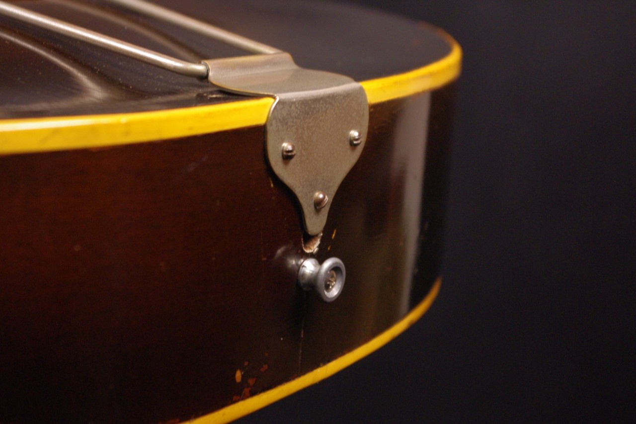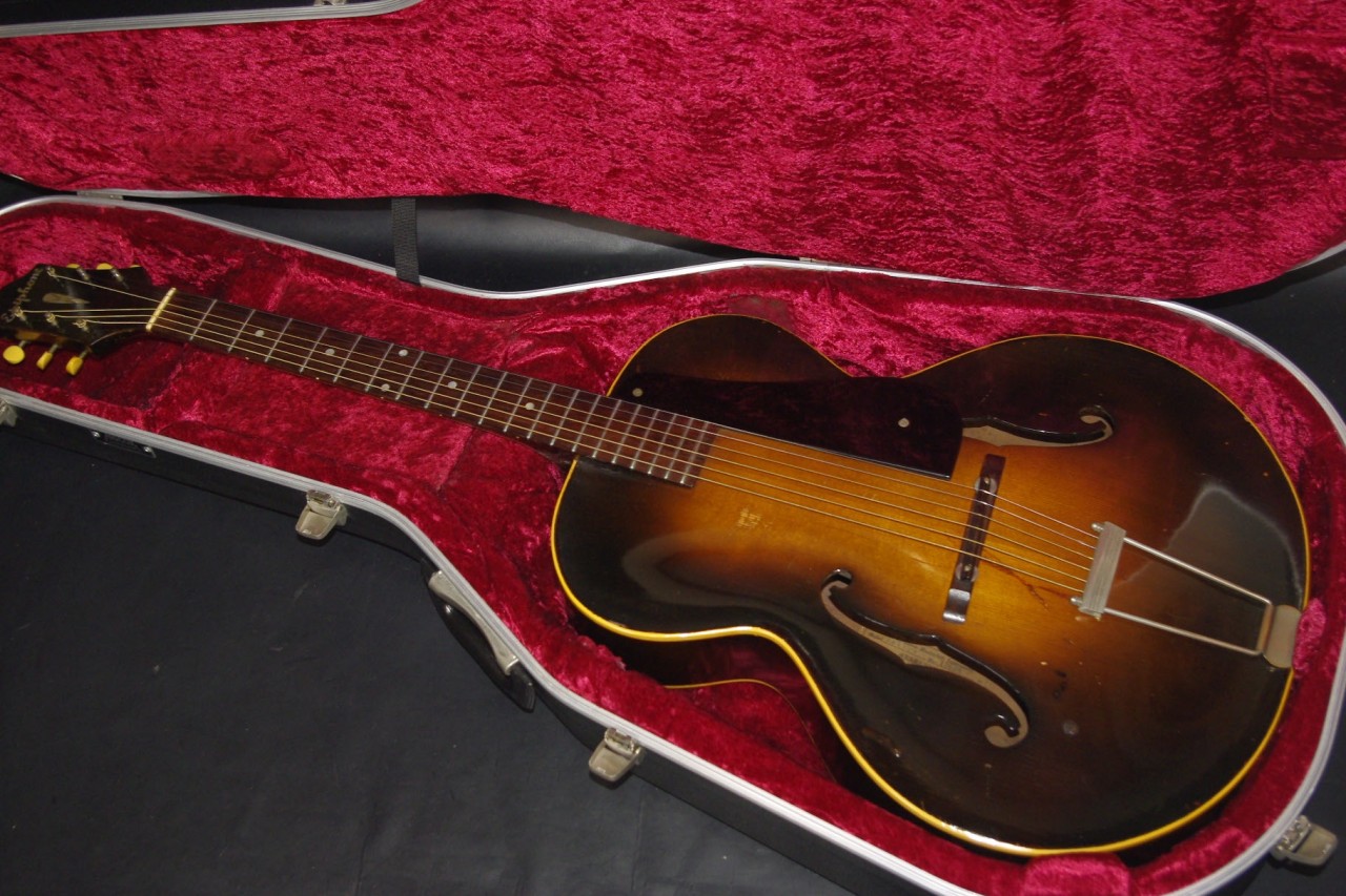 1930年代のエピフォンZenithが入荷しました!!トップはスプルース、サイドバックにはウォルナット、指板とブリッジにはハカランダを採用した16インチアーチトップです。シリアルナンバーから1938年に生産された個体でボディ内部のラベルもしっかり残っていました。グローバー製のオープンバックペグ、ピックガードはオリジナルで残っています。テールピースは交換されています。オーバーラッカー、トップに弾き傷、全体的に打ち傷、タッチアップ、ウェザーチェックが年代相応入っていますがビンテージならではの貫録が堪りません!ナット幅は約42mm、やや厚みのあるソフトVシェイプになります。ロッド調整はございませんがネックのアングルも適正です。フレットは交換されており多少の減りは出ていますが今後もまだまだお使いいただけます。弦高は12フレット6弦側で約2.6mm、1弦側で約2.1mmの高さでサドル側で微調整しています。サイドバックにはウォルナット材が使われておりマホガニーと比べるとやや硬くレスポンスが良いです!歯切れがよく乾いた味わい深いサウンドで仕上がっています!是非この機会にどうぞ!HISCOXのハードケースが付属しています。
