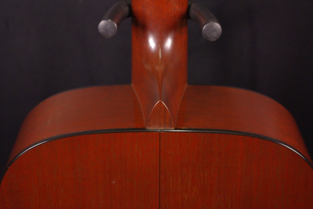 1996年製のマーティン D-18がお買い得!!トップはシトカ・スプルース、サイドバックにはマホガニー、指板とブリッジにはローズウッドを採用、ノンスキャロップドXブレーシングなのも特徴で現行品と比べると歯切れがよくスッキリとした音抜けです!マーティンペグ、ブラックピックガードなど主なパーツはオリジナルで残っていました。バインディングの剥がれ補修箇所、ヘッド裏とネックに傷、多少の細かい傷はありますが全体的に綺麗に残っています。ネックヒールへのストラップピンやピックアップの取り付け加工はございません。ナット幅は約42.9mm、やや薄めで押さえやすいグリップで幅広い演奏に適しています。アングルは14フレット付近から僅かな元起きがありますが許容範囲でトラスロッドの動作も問題なく機能しています。フレットは多少の減りは出ていますがまだまだお使いいただけます。弦高は12フレット6弦側で約2.2mm、1弦側で約1.6mmの高さで押さえやすく調整しています。サドル残は少なめですが気持ち微調整が可能です。30年経過しておりマホガニーの明るく乾いた味わい深いサウンドで仕上がっていますね!是非この機会にお試しください!!汎用ハードケース付き