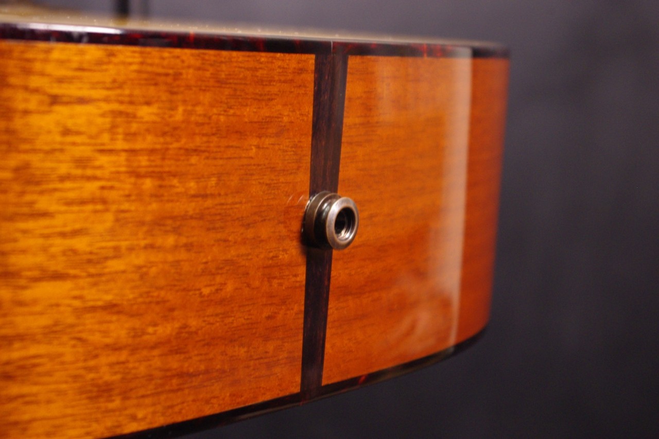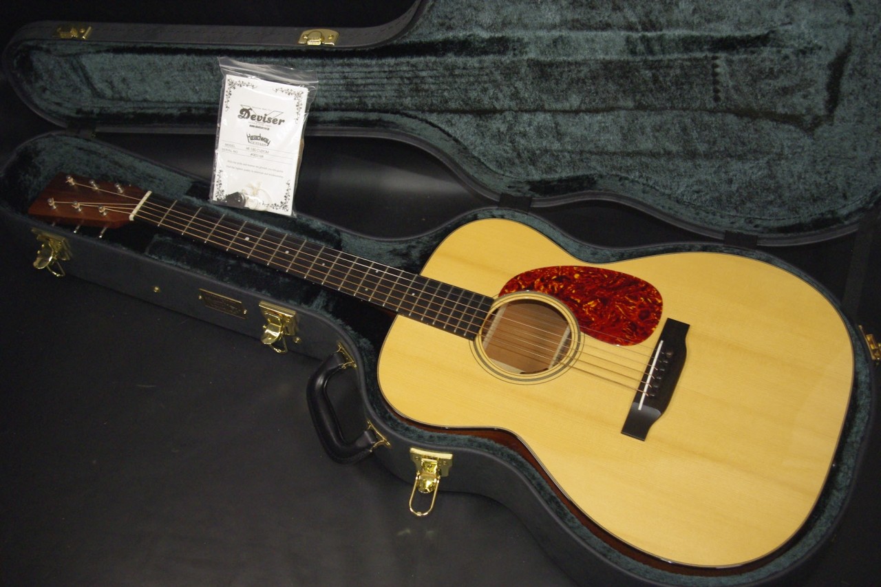 ヘッドウェイ 百瀬氏製作!オーセンティック仕様のHF-180 Customが入荷しました!!トップには最高級5Aのアディロンダックスプルース、サイドバックにはヴィンテージのホンジュラスマホガニー、ネックは1ピースホンジュラスマホガニーの厳選された材を採用した貴重なモデル!!ペグはゴトー製のオープンバック、べっ甲柄ピックガード、ロングサドルなどビンテージに拘ったパーツも装飾も魅力です!ヘッドのロゴはあえて入れておらず裏側に刻印されています。トップ裏には百瀬氏のサインと製造年が入っていました。2019年に生産されたモデルでネックに傷がありますが全体的に綺麗で演奏性も大変優れています!LRBaggs社のリリックピックアップが搭載されていますのでライブでもお使いいただけます。ネックヒールへのストラップピン加工はございません。ナット幅は約43mm近くのしっかりとしたソフトVシェイプで幅広い演奏に適しています。ネックのアングルも理想的でトラスロッドの動作も問題なく機能しています。フレットは少々の減りは出ていますがまだまだ余裕があります。弦高は12フレット6弦側で約2.4mm、1弦側で約1.6mmの高さで押さえやすく調整しています。お好みに合せた微調整にもお応えいたします。アディロンダックスプルースとマホガニーの相性が見事で温かくふくよかな響きで軽いタッチで広がります!リア・シフトされたXブレーシングの影響も大きく各弦にしっかりと芯がありピックで弾いた時の切れ味も抜群ですね!是非この機会にお試しください!オリジナルハードケース付