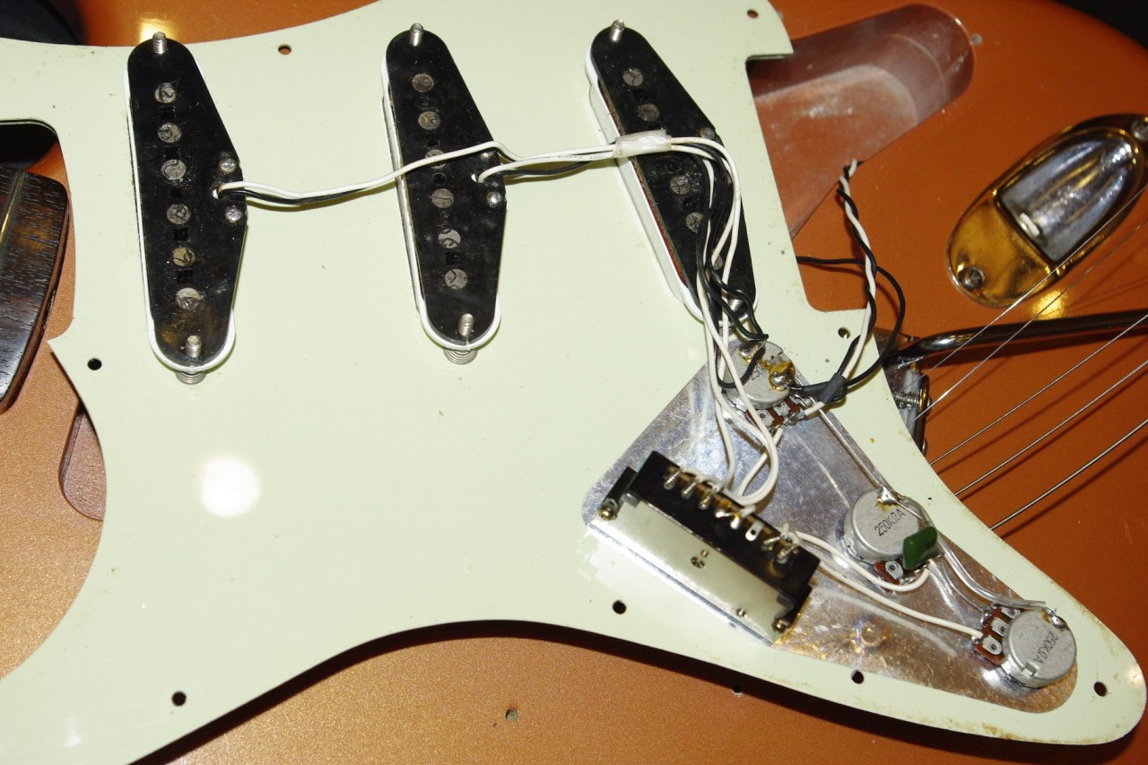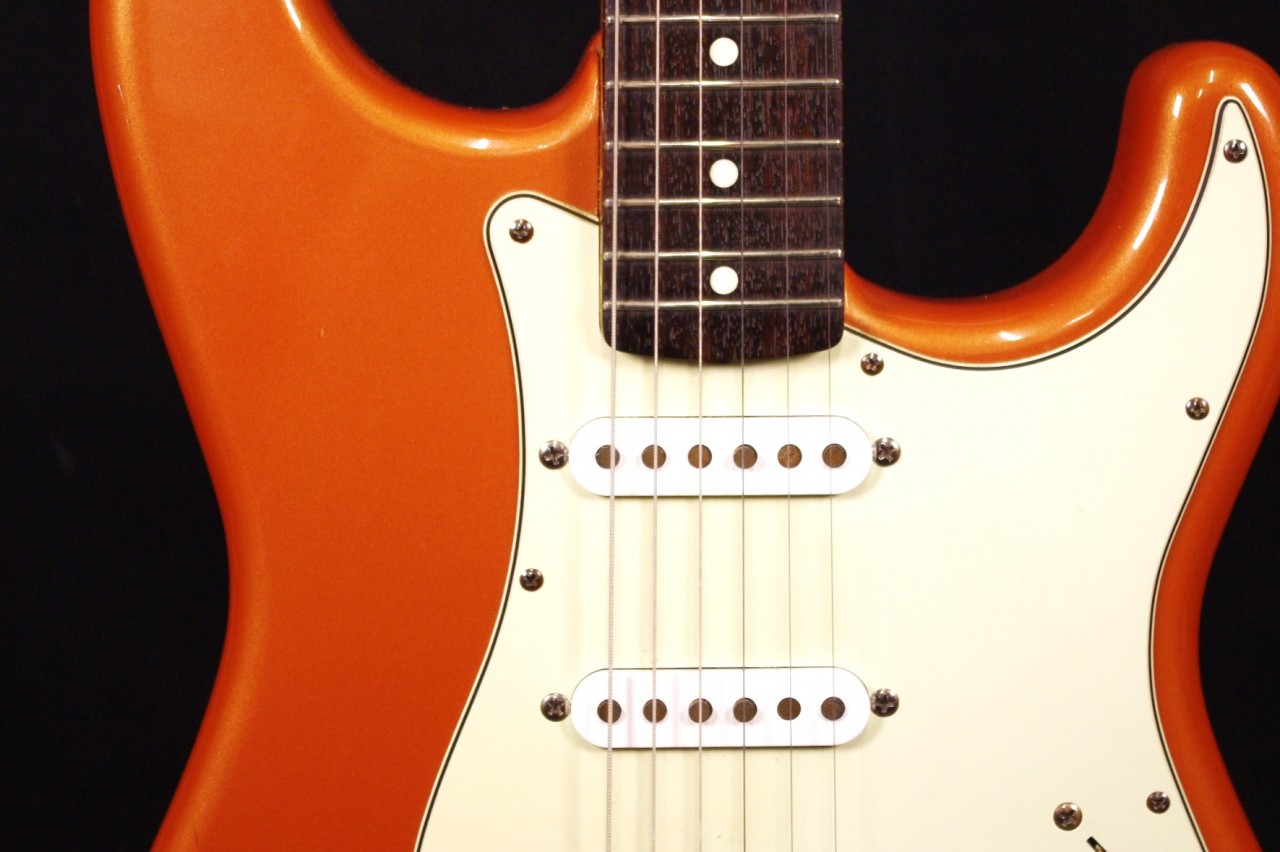 ボディ アルダー、指板 ローズウッド、ネック メイプル(フォトフレーム)、オリジナルチューナー、オリジナルピックアップ、ジャック交換、PUカバー交換、バックプレート欠品、アーム付属、5WAYセレクタースイッチ、1Vol、2Tone、