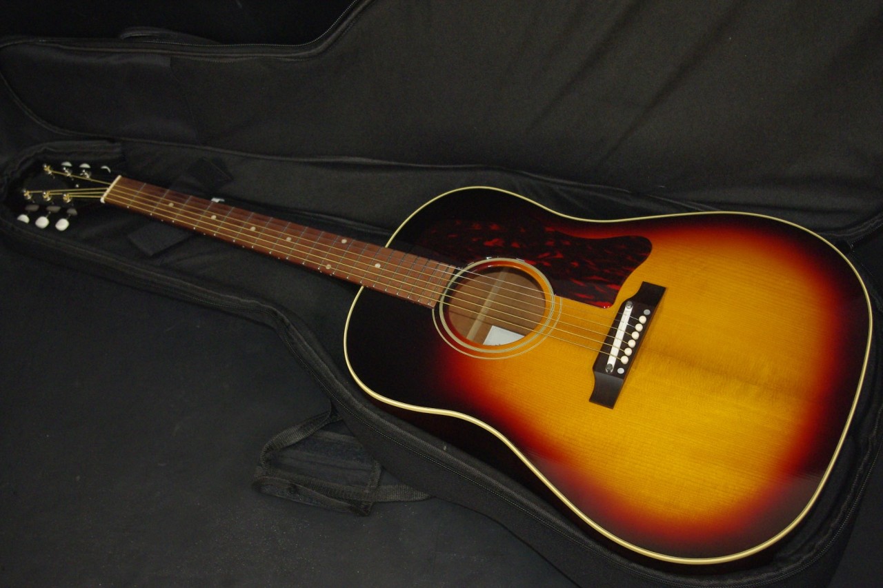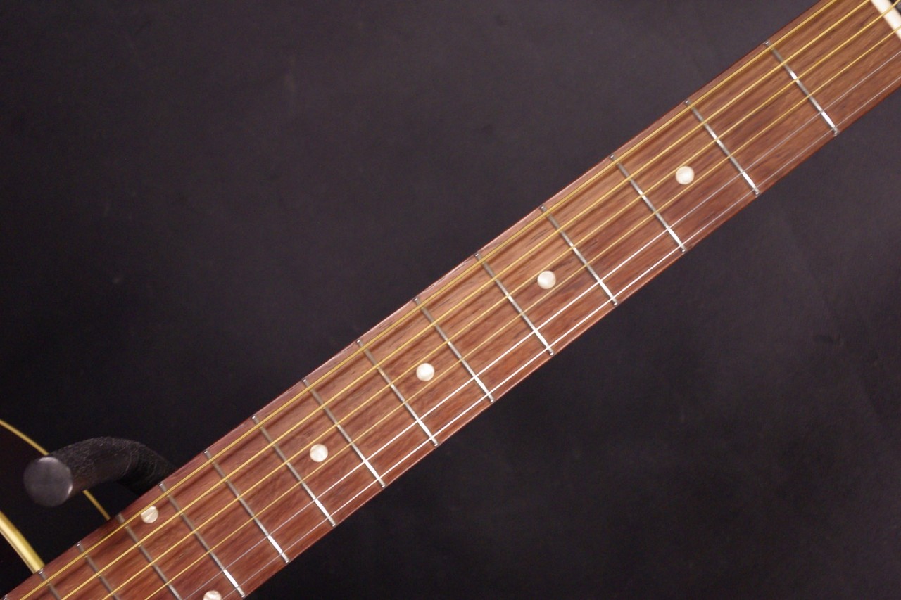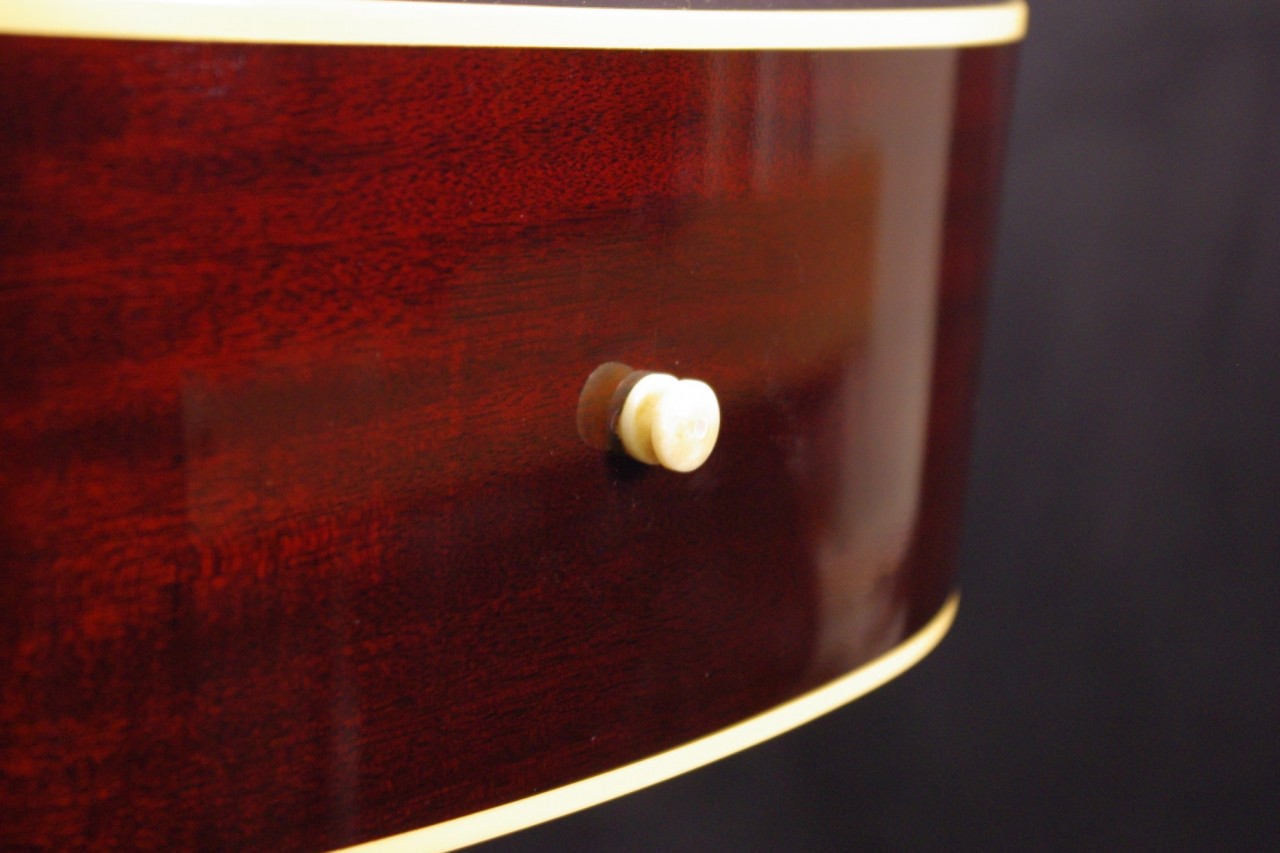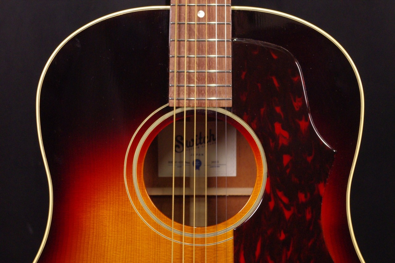 日本製!SWITCHの RSD-45 ADJ 39mmが入荷しました!!トップはアディロンダックスプルース、サイドバックにはホンジュラスマホガニーの厳選された材を採用したラウンドショルダーモデル!60年代後期のアジャスタブルブリッジ、ナット幅は約39mmのナローネックが大きな特徴で歯切れがよく迫力があります!クルーソンタイプの3連ペグや厚みのあるラージピックガードなどパーツも拘り作りもしっかりと丁寧に仕上がっています。ブラウンサンバーストカラーも美しく大変魅力ですね!ネックヒールへのストラップピン加工はございません。以前にピックアップを取り付けていたためエンドホールが広がっています。現在はコンバージョン用のエンドピンで対応しています。細かい傷はありますが全体的に綺麗で演奏性も抜群です!ネックのアングルも理想的でトラスロッドの動作も問題なく機能しています。フレットの減りもなく長期で安心いただけます。弦高もハイポジションまで押さえやすく調整していますがお好みに合せてサドル側での微調整も可能です。ナトーネックの締まりの良いキレの良いサウンド!ストローク中心での演奏に一押し!弦長は約630mm、重量もやや軽めでとても扱いやすい1本でこれはおすすめです!!SWITCHギグケース付き