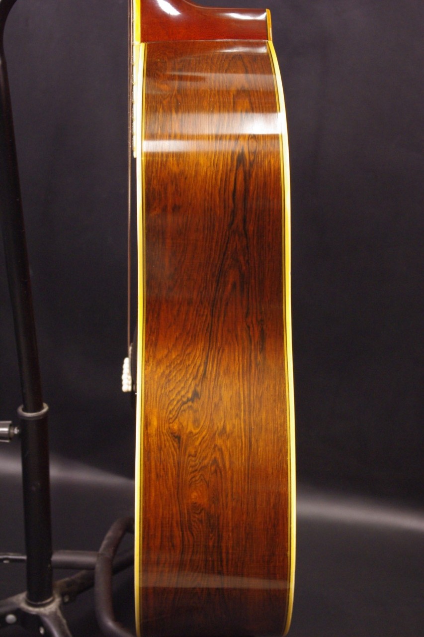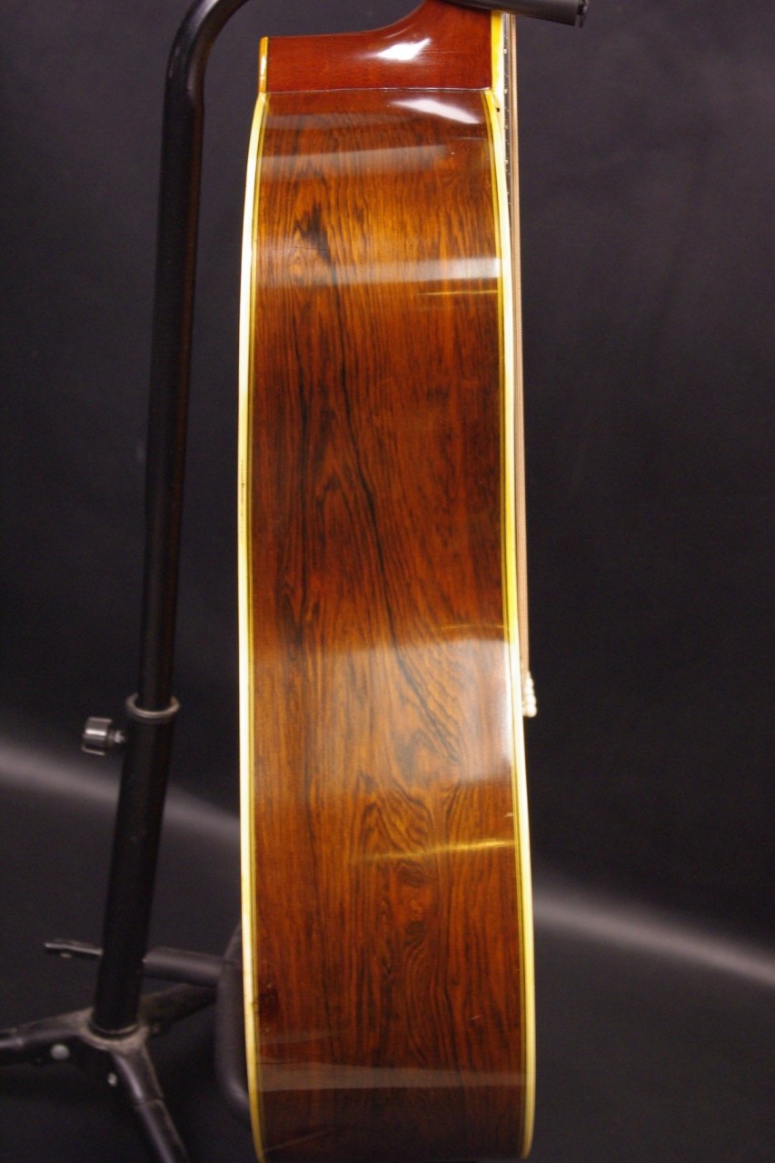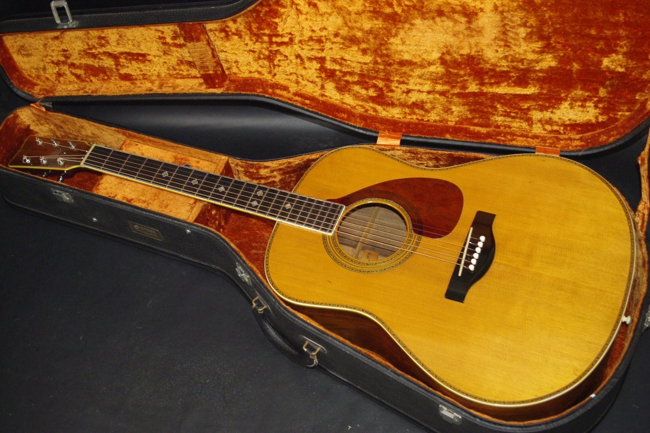 1972年製!当時の高級手工モデル FG-2000が初期のV字ヘッド期で入荷しました!!トップはエゾ松単板、サイドバックには希少材ハカランダ単板の厳選された材を採用、ボディ内部の本革ラベルもしっかりと残っておりテリー中本氏のサインも確認できます!ペグ、べっ甲柄ピックガード、黒檀ブリッジもオリジナルで残っていました!トップに打ち傷のタッチアップが所々にあります。傷、ウェザーチェックは出ていますがビンテージに相応し雰囲気の良い個体で狙い目です!!ネックヒールへのストラップピン加工はございません。以前にピックアップを取り付けていたためエンドホールが広がっています。上手く穴埋めして通常サイズのピンが付いています。ナット幅は約45mm近くのやや太めのグリップも特徴でしっかりとしています!ナット、フレット、サドルは交換されておりフレットは高さに余裕があります。ネックのアングルは14フレットジョイント付近から元起きが少し見られますが許容範囲で弦高は12フレット6弦側で約2.8mm、1弦側で約2mmの高さでサドルを下げて調整しています。トラスロッドの動作には余裕があります。ハカランダらしいくっきりした音抜けで指で弾いても分離が良く気持ちよく前に吐き出してくれます!ジャンボボディから大音量で低音も太くパワフル!!探していた方は是非この機会にお試しください。入手困難!!オリジナルYAMAHAハードケース付。