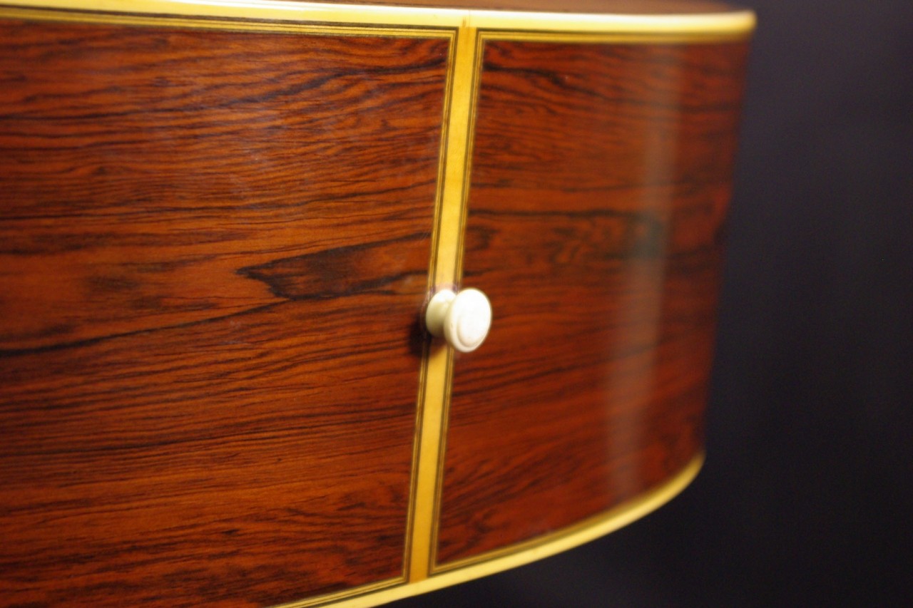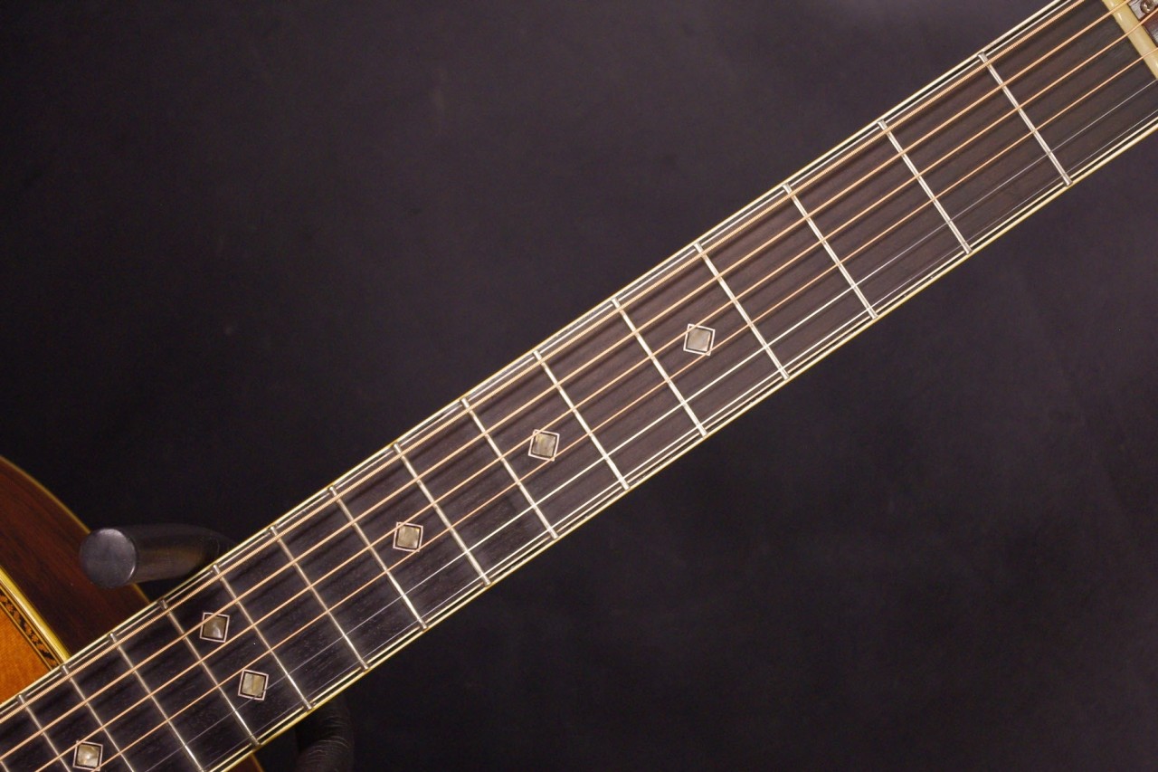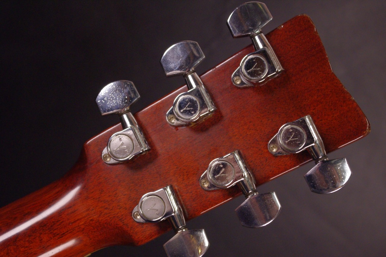 1972年製!当時の高級手工モデル FG-2000が初期のV字ヘッド期で入荷しました!!トップはエゾ松単板、サイドバックには希少材ハカランダ単板の厳選された材を採用、ボディ内部の本革ラベルもしっかりと残っておりテリー中本氏のサインも確認できます!ペグ、べっ甲柄ピックガード、黒檀ブリッジもオリジナルで残っていました!トップに打ち傷のタッチアップが所々にあります。傷、ウェザーチェックは出ていますがビンテージに相応し雰囲気の良い個体で狙い目です!!ネックヒールへのストラップピン加工はございません。以前にピックアップを取り付けていたためエンドホールが広がっています。上手く穴埋めして通常サイズのピンが付いています。ナット幅は約45mm近くのやや太めのグリップも特徴でしっかりとしています!ナット、フレット、サドルは交換されておりフレットは高さに余裕があります。ネックのアングルは14フレットジョイント付近から元起きが少し見られますが許容範囲で弦高は12フレット6弦側で約2.8mm、1弦側で約2mmの高さでサドルを下げて調整しています。トラスロッドの動作には余裕があります。ハカランダらしいくっきりした音抜けで指で弾いても分離が良く気持ちよく前に吐き出してくれます!ジャンボボディから大音量で低音も太くパワフル!!探していた方は是非この機会にお試しください。入手困難!!オリジナルYAMAHAハードケース付。