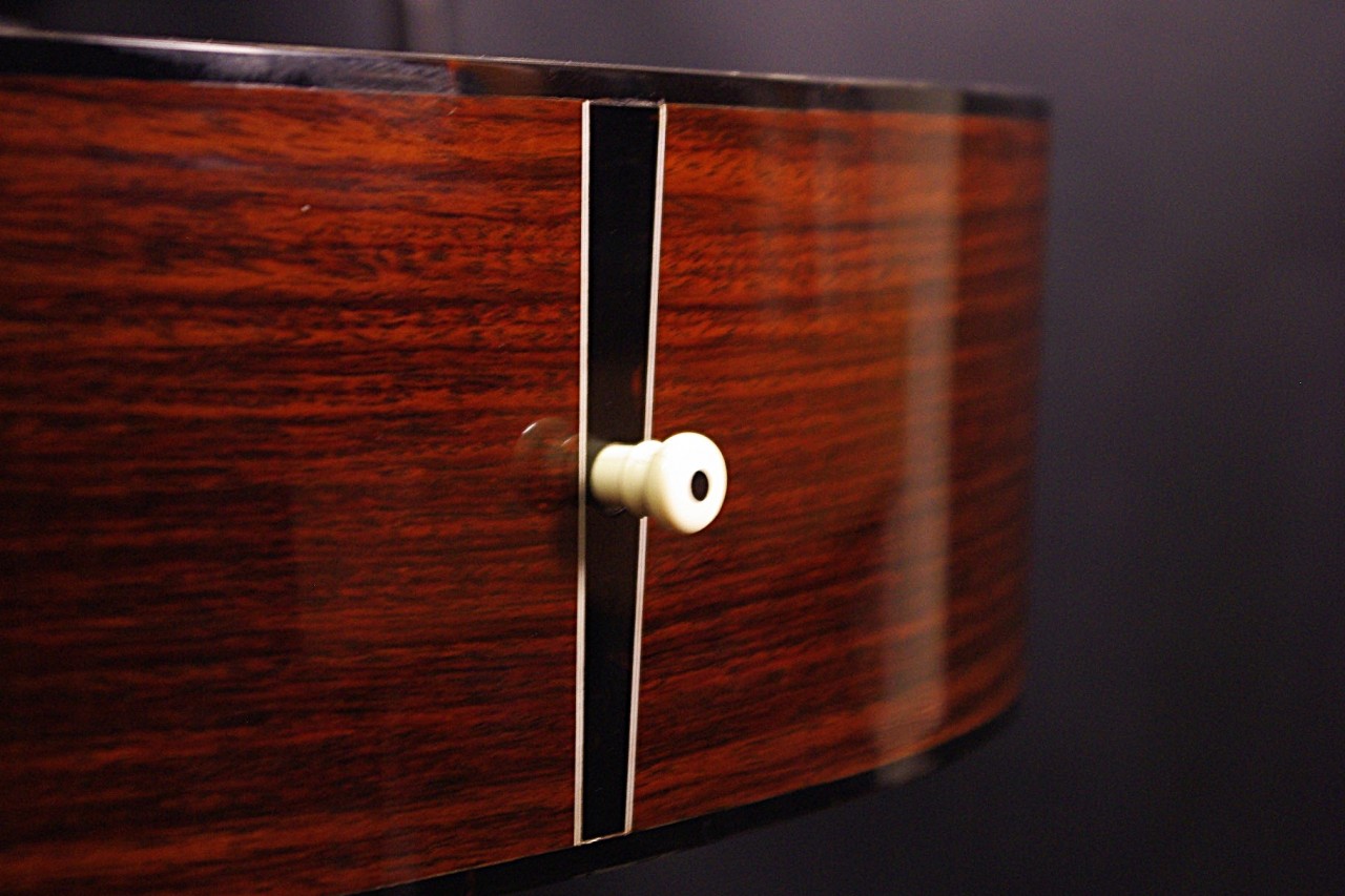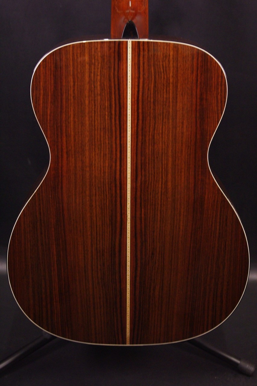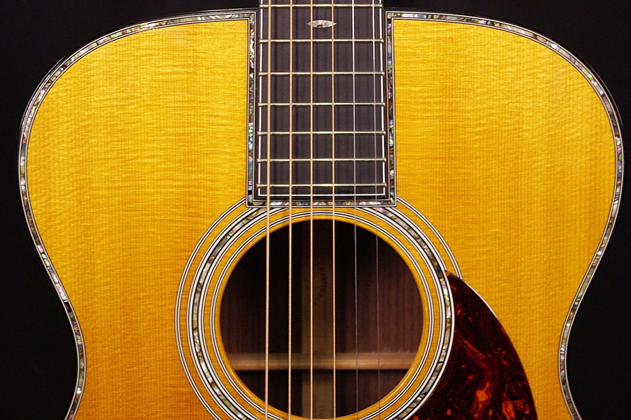 2018年製のマーティン OM-42カスタムモデルが入荷しました!!トップはシトカスプルース、サイドバックには美しいインディアンローズウッドの厳選された材を採用、抱えやすい000ボディにロングスケールの組み合わせが特徴で000と比べるとヴォリューム感があり軽いタッチで美しく広がります!!ペグは白ノブのウェバリーオープンバックペグが装備されています。縦ロゴマーティン、指板にはスノーフレイクとキャッツアイのポジションインレイが入っています!ヘッド、ネック、ボディバインディングにはべっ甲柄を使っているのもこのモデルの特徴でルックスも高級感がありますね!ヘッドやボディの所々に打ち傷が見られますが全体的に綺麗で演奏性、サウンドが優れていますので安心です!ネックヒールへのストラップピン加工、ピックアップの取り付け加工はございません。ナット幅は約42.9mmの太すぎない、薄すぎない幅広い演奏で押さえやすいグリップですね!ネックのアングルも適正でトラスロッドの動作にも余裕がありました。フレットは多少の減りは出ていますがまだまだ余裕があります。弦高は12フレット6弦側で約2.6mm、1弦側で約1.7mmの高さで押さえやすく調整しています。ブリッジからサドル残もあり微調整にもお応えいたします。倍音成分を多く含んだ煌びやかなサウンド!!指弾きではバランスがよくサスティーンも豊富で非常に癒されますよ!是非この機会にお試しください!オリジナルマーティンハードケース付。