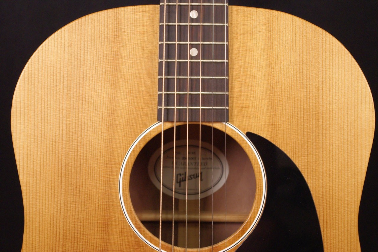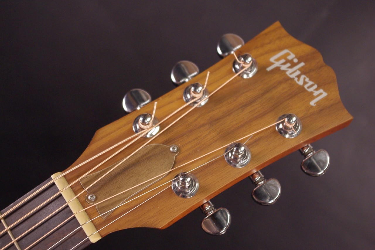 コストパフォーマンスに優れたギブソン G-45が入荷しました!!トップはシトカスプルース、サイドバックにはウォルナット、ネックにはマホガニーの特性を持つユーリー材が採用されています。J-45スタイルのボディにサイドにはプレイヤーポートと呼ばれるホールが設けられており自身がよりはっきりと音を捉えることができます!シリアルナンバーから2021年製で使用感が少なく目立った傷がございません。状態、演奏性もよく長期で安心してお楽しみいただけます。ペグ、ピックガード、ブリッジなどパーツもオリジナルで残ってます。ネックヒールへは新品時からストラップピンが打っています。ピックアップの取り付け加工はございません。ナット幅は約43mmの薄すぎない幅広い演奏で押さえやすいグリップです。ネックのアングルも理想的でトラスロッドの動作も問題なく機能しています。フレットの減りも少なく今後も気にしないでお使いいただけます。弦高は12フレット6弦側で約2.4mm、1弦側で約1.5mmでハイポジションまで押さえやすい高さです。お好みに合せた微調整にもお応えいたします。J-45と比べるとボディがやや薄く仕上げており歯切れがよくスッキリと抜けてくれます!是非この機会にお試しください!オリジナルギグケース付き