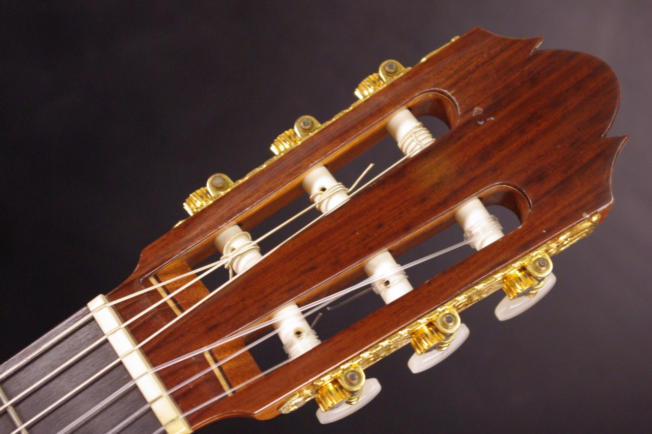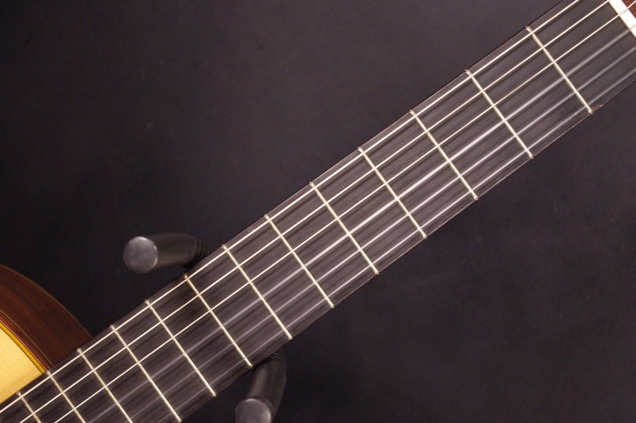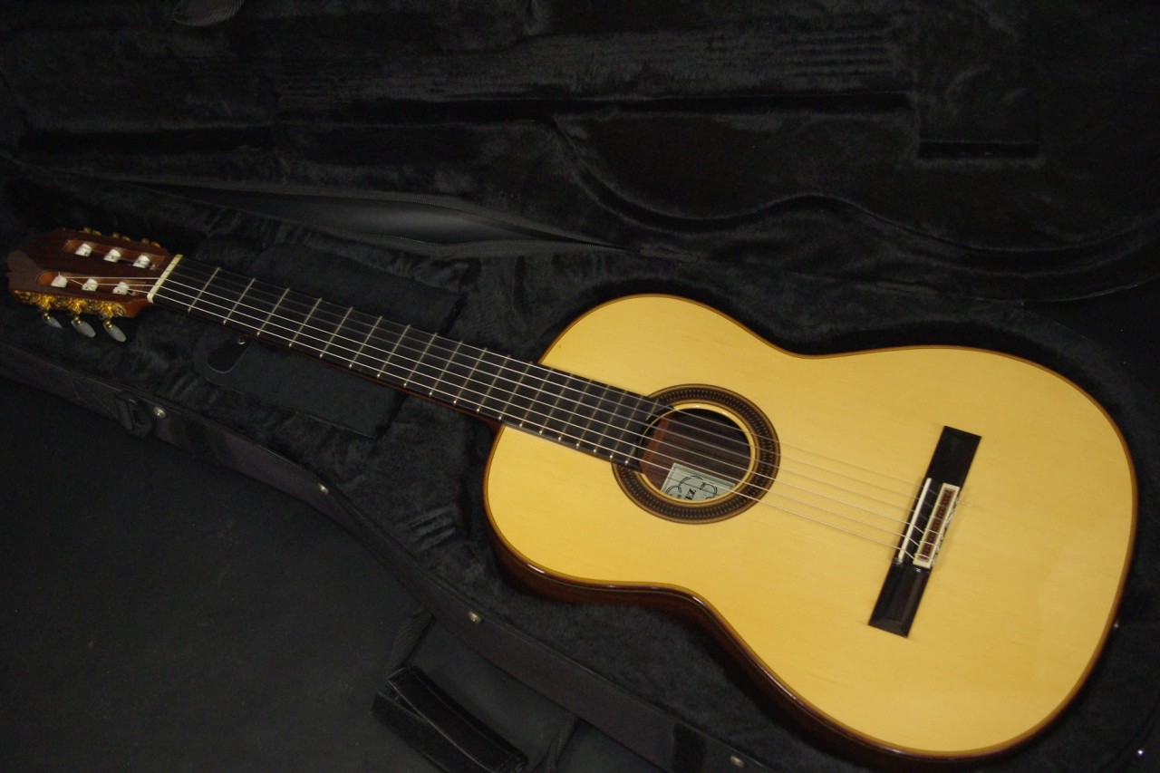 国産!松岡良治ギター工房で生産されたアランフェス No.715が入荷しました!!トップはドイツ松、サイドバックにはローズウッドが有力のオール単板モデル!ゴトー製のゴールドペグ、ブリッジはローズウッド材でダブルホール仕様になっているのも特徴です!シリアルナンバーから2008年頃に生産された個体で指板の1フレット1弦側に亀裂補修がありますが演奏するにあたって支障ございません。全体的に打ち傷、使用感は見られますが演奏性、サウンドが優れていますのでおすすめです。ネックヒールへはストラップピンが打っています。LR.Baggs社のiBeamアクティブピックアップが搭載されておりライブでもお使いいただけます。ナット幅は約51mm近く、ネックのアングルも理想的でフレットの状態も良いです。弦高は12フレット6弦側で約3.5mm、1弦側で約2.3mmの高さで調整していますがお好みに合せた微調整にもお応えいたします。甘くて柔らかい豊かなサウンドで非常に癒されます!弦長は標準的な約650mmとっており音も大きく軽いタッチで抜けてくれます!マイク付きで手軽に使えるクラシックギターで探していた方にとっては嬉しい1本です。セミハードケース付き