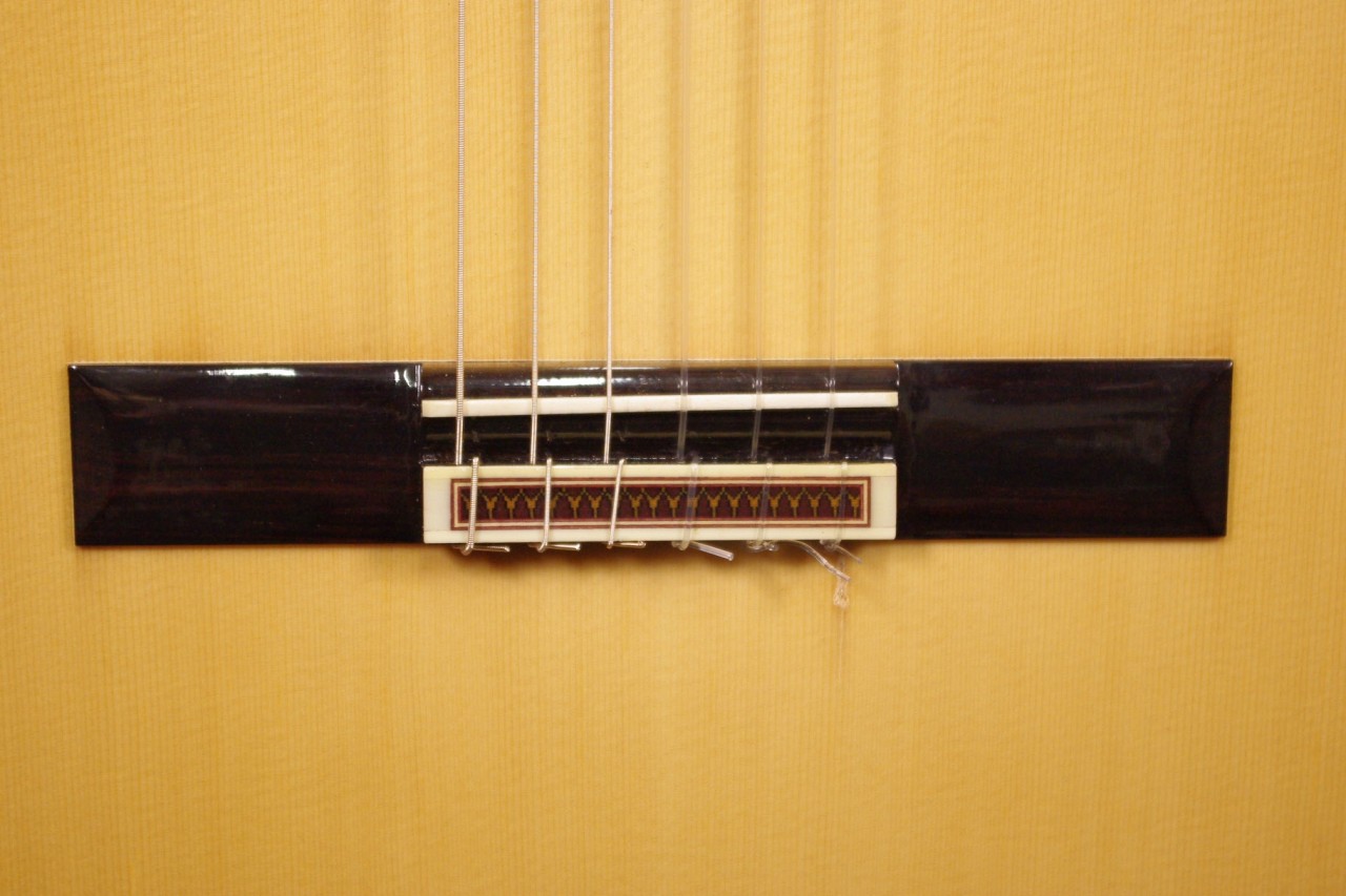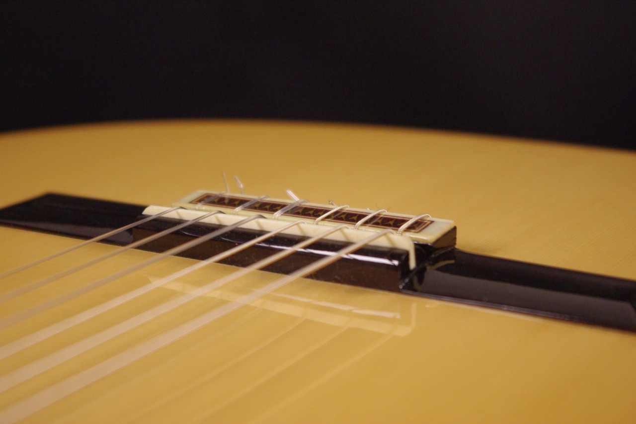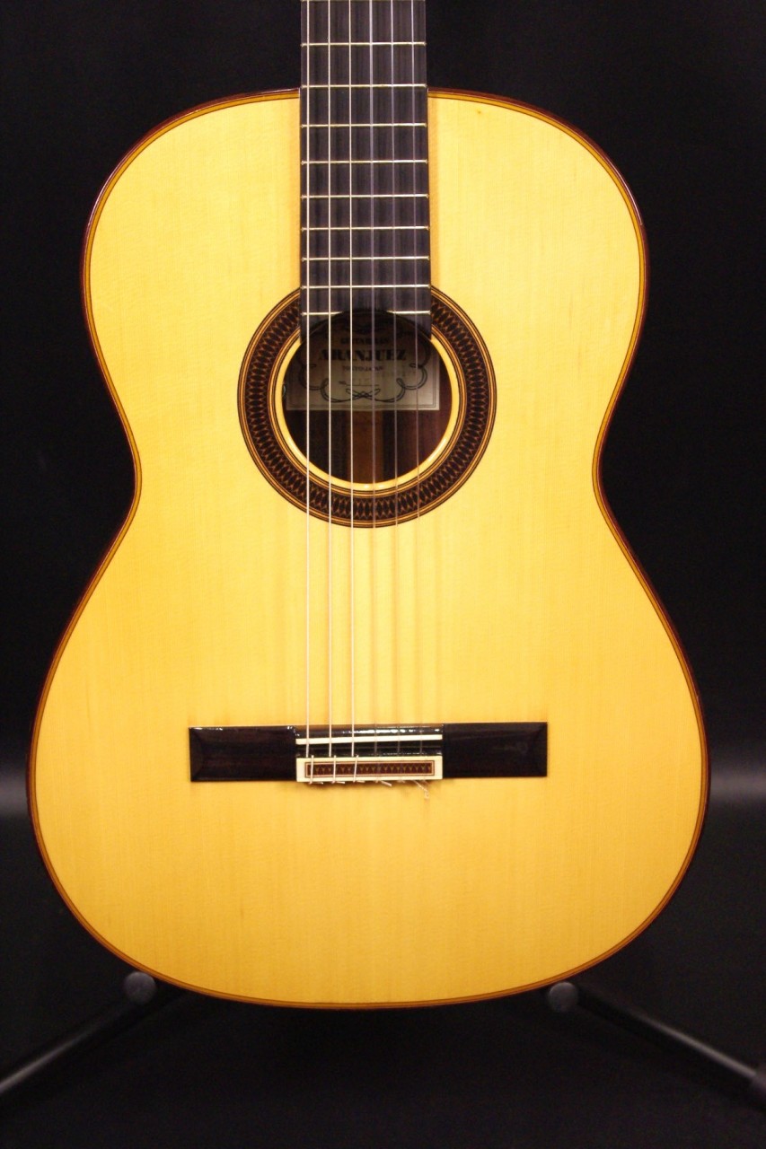 国産!松岡良治ギター工房で生産されたアランフェス No.715が入荷しました!!トップはドイツ松、サイドバックにはローズウッドが有力のオール単板モデル!ゴトー製のゴールドペグ、ブリッジはローズウッド材でダブルホール仕様になっているのも特徴です!シリアルナンバーから2008年頃に生産された個体で指板の1フレット1弦側に亀裂補修がありますが演奏するにあたって支障ございません。全体的に打ち傷、使用感は見られますが演奏性、サウンドが優れていますのでおすすめです。ネックヒールへはストラップピンが打っています。LR.Baggs社のiBeamアクティブピックアップが搭載されておりライブでもお使いいただけます。ナット幅は約51mm近く、ネックのアングルも理想的でフレットの状態も良いです。弦高は12フレット6弦側で約3.5mm、1弦側で約2.3mmの高さで調整していますがお好みに合せた微調整にもお応えいたします。甘くて柔らかい豊かなサウンドで非常に癒されます!弦長は標準的な約650mmとっており音も大きく軽いタッチで抜けてくれます!マイク付きで手軽に使えるクラシックギターで探していた方にとっては嬉しい1本です。セミハードケース付き
