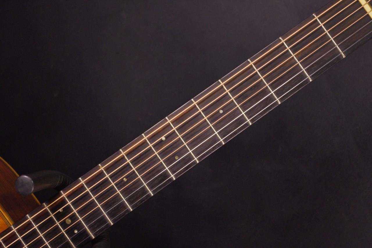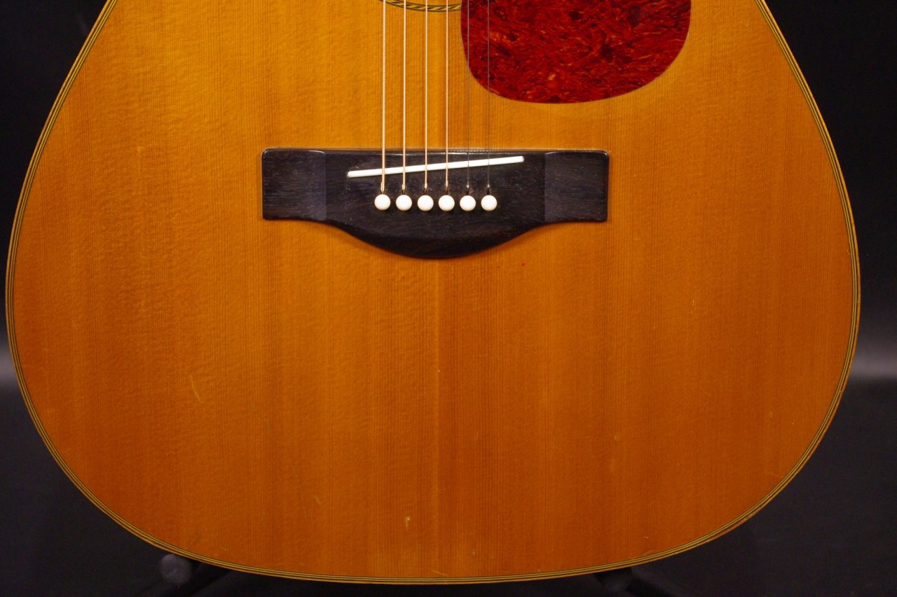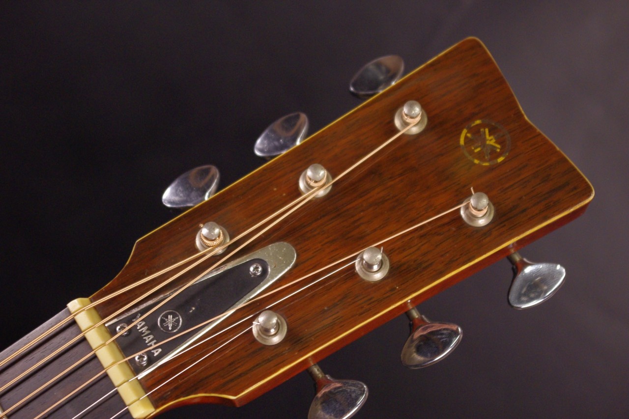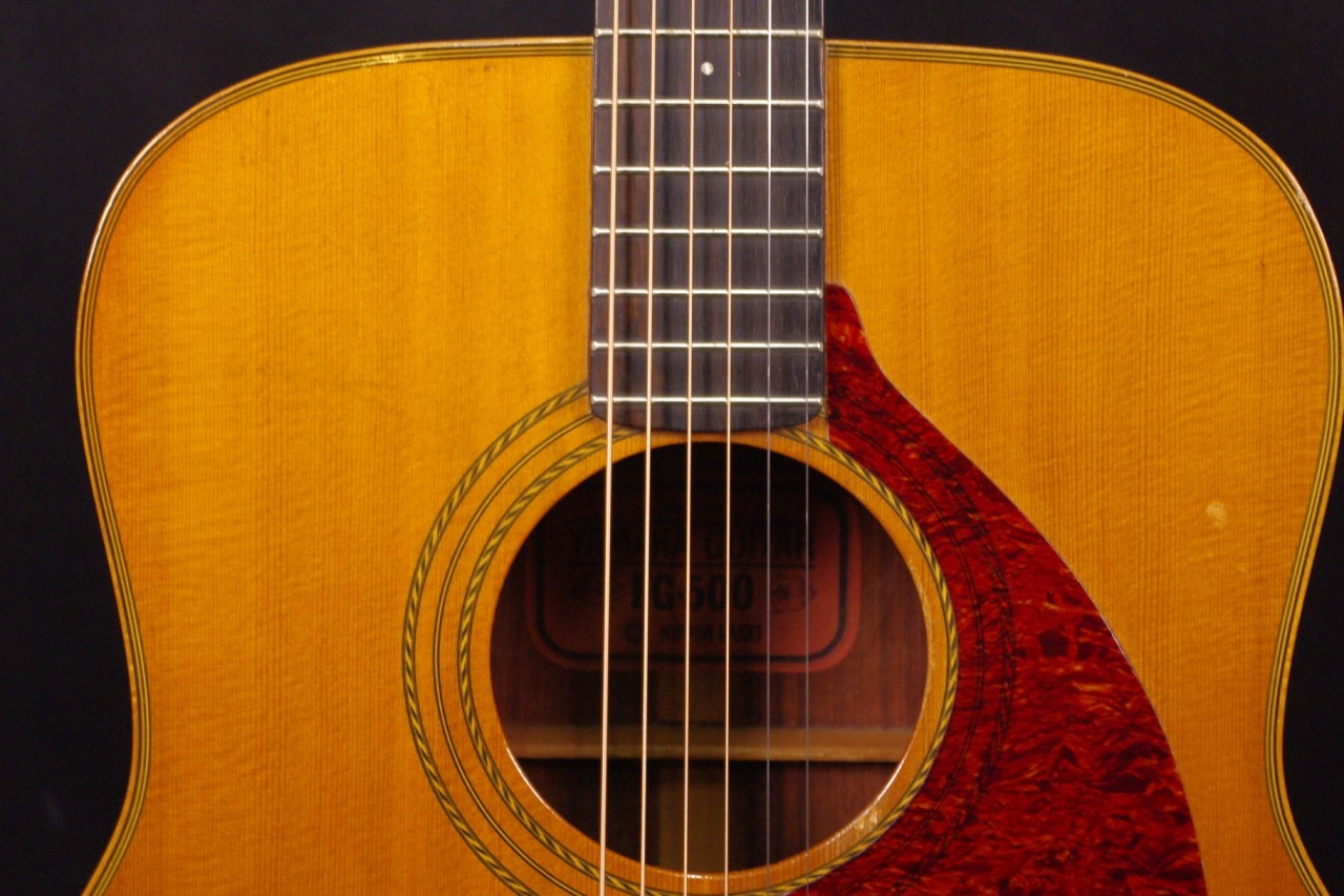 ヤマハ赤ラベルの最上位機種 FG-500がお買い得!トップはスプルース単板、サイドはハカランダ合板、バックはハカランダ単板、指板とブリッジには黒檀を採用、1970年代前半に生産された個体でピックガードが交換されています。ペグ、ブリッジはオリジナルで残っていました。ロゴが薄くなっています。ネックに塗装の剥離、年代相応の傷はありますが演奏性、サウンドが優れていますので一押しです!ネックヒールへのストラップピン加工、ピックアップの取り付け加工はございません。ナット幅は約44mmのやや太めのグリップになります。ネックのアングルも適正でトラスロッドの動作も問題なく余裕がありました。フレットは多少の減りはありますが十分残っており今後も安心です。弦高は12フレット6弦側で約mm、1弦側で約mmの高さでハイポジションまで押さえやすく調整しています。ブリッジもオリジナルの高さをキープしておりサドル残もありますので微調整も可能です。パリッと最高に乾いたハカランダらしいサウンド!指で弾いても反応が素早く粒立ちがよいです!音量も凄くボディ全体で響きますね!是非この機会にお試しください!汎用ハードケース付き