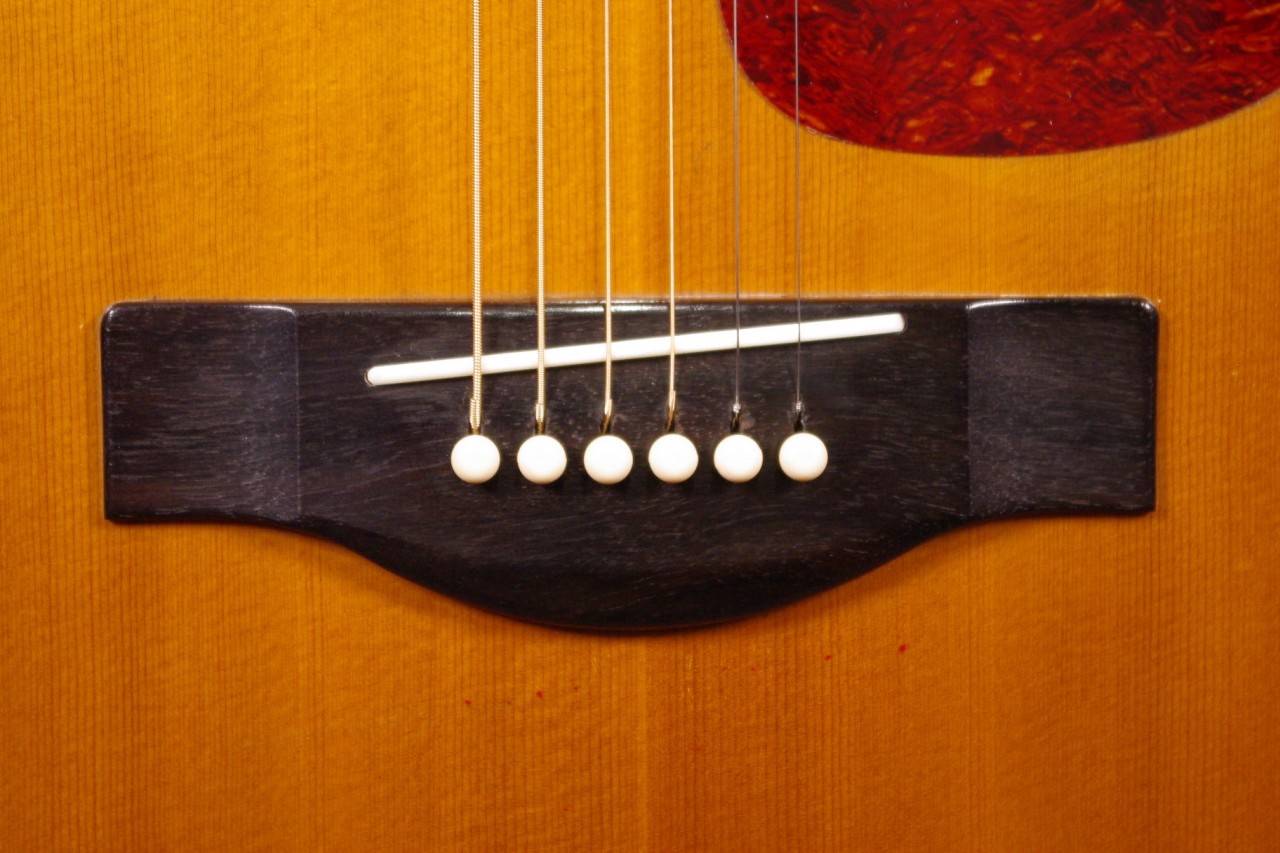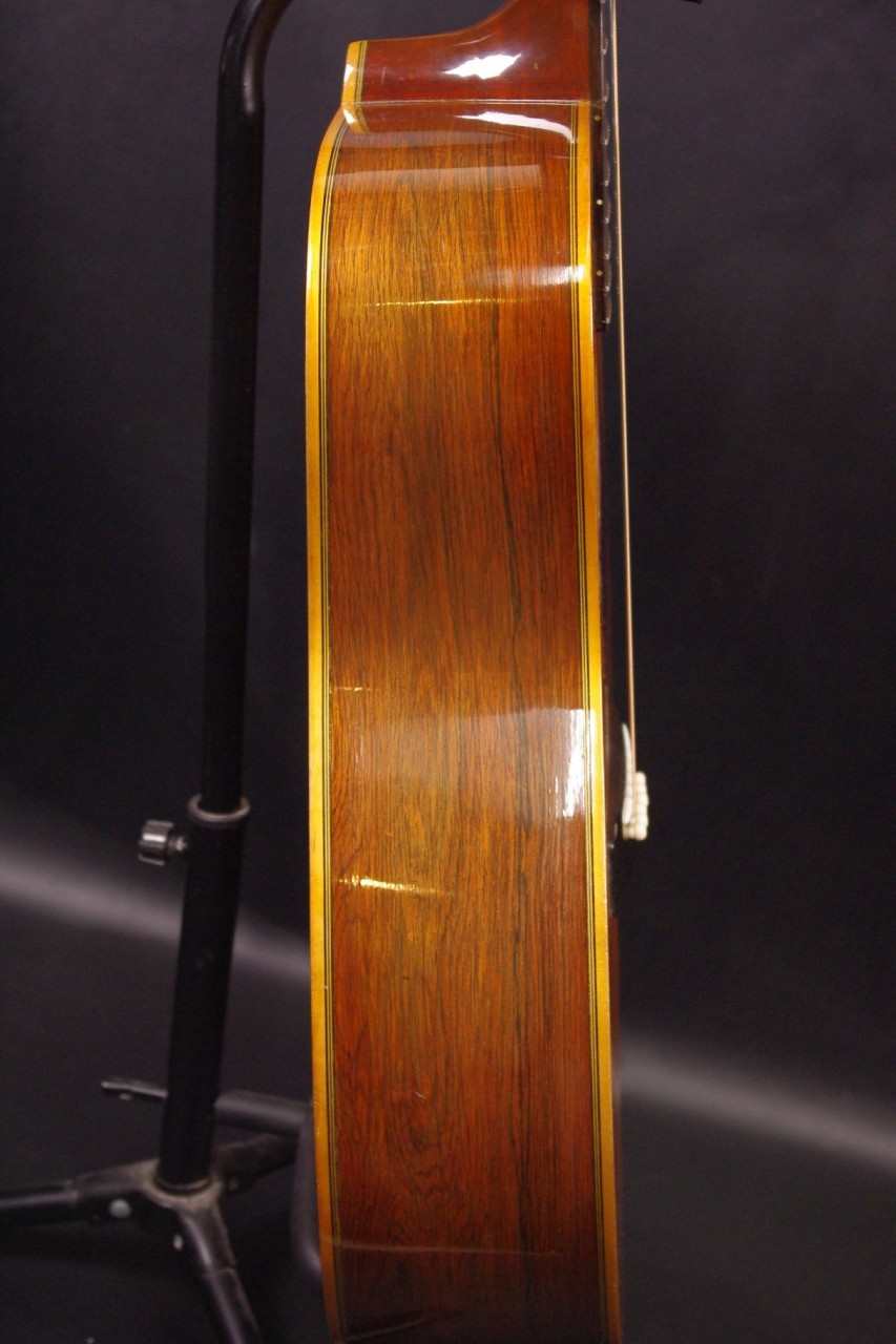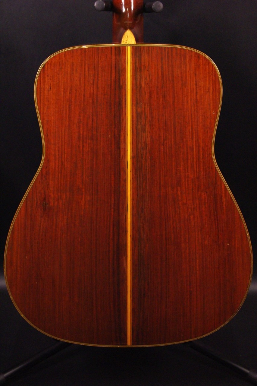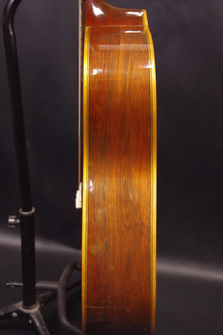 ヤマハ赤ラベルの最上位機種 FG-500がお買い得!トップはスプルース単板、サイドはハカランダ合板、バックはハカランダ単板、指板とブリッジには黒檀を採用、1970年代前半に生産された個体でピックガードが交換されています。ペグ、ブリッジはオリジナルで残っていました。ロゴが薄くなっています。ネックに塗装の剥離、年代相応の傷はありますが演奏性、サウンドが優れていますので一押しです!ネックヒールへのストラップピン加工、ピックアップの取り付け加工はございません。ナット幅は約44mmのやや太めのグリップになります。ネックのアングルも適正でトラスロッドの動作も問題なく余裕がありました。フレットは多少の減りはありますが十分残っており今後も安心です。弦高は12フレット6弦側で約mm、1弦側で約mmの高さでハイポジションまで押さえやすく調整しています。ブリッジもオリジナルの高さをキープしておりサドル残もありますので微調整も可能です。パリッと最高に乾いたハカランダらしいサウンド!指で弾いても反応が素早く粒立ちがよいです!音量も凄くボディ全体で響きますね!是非この機会にお試しください!汎用ハードケース付き