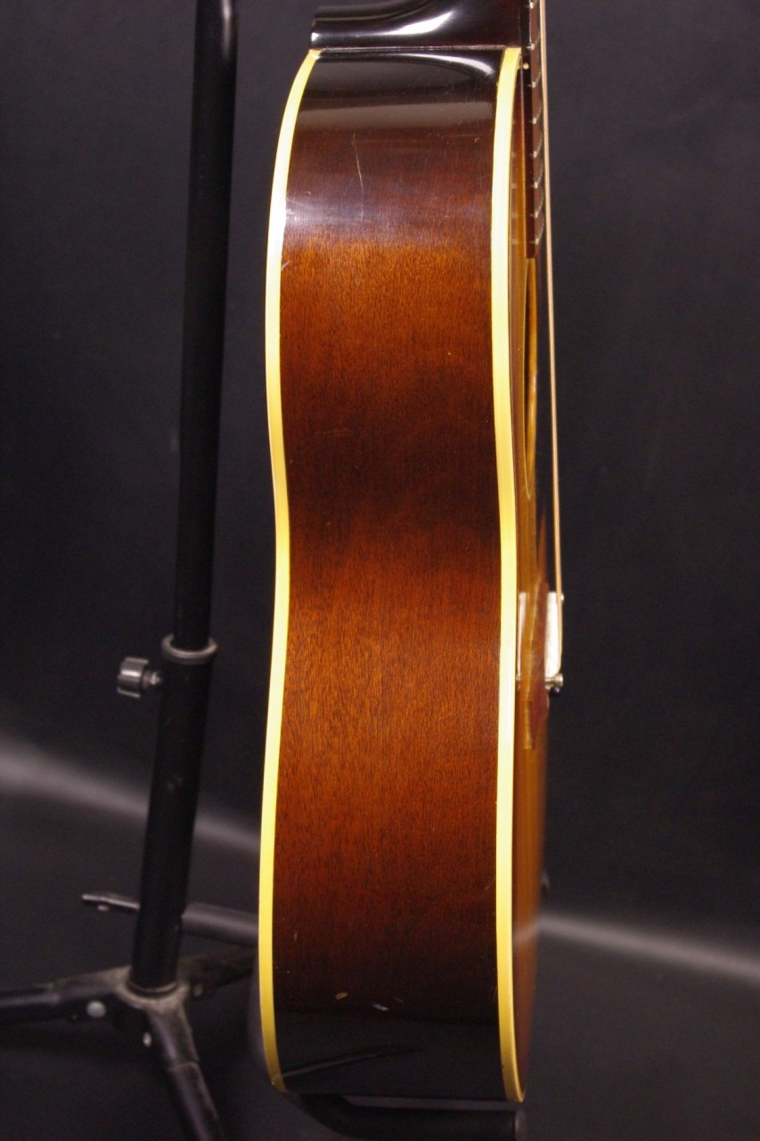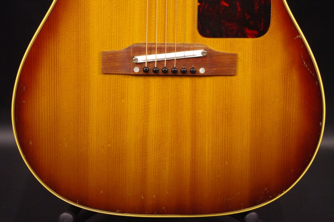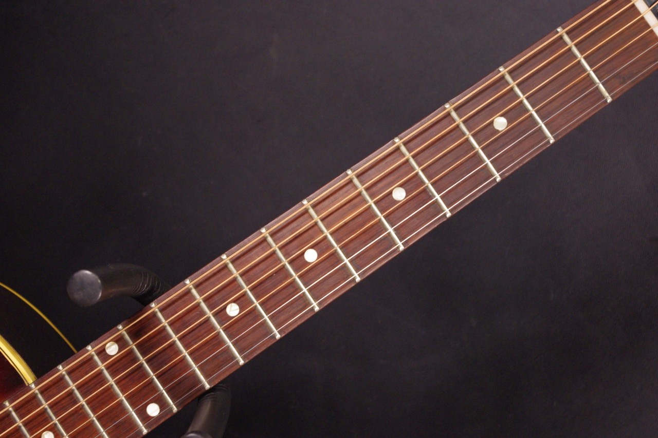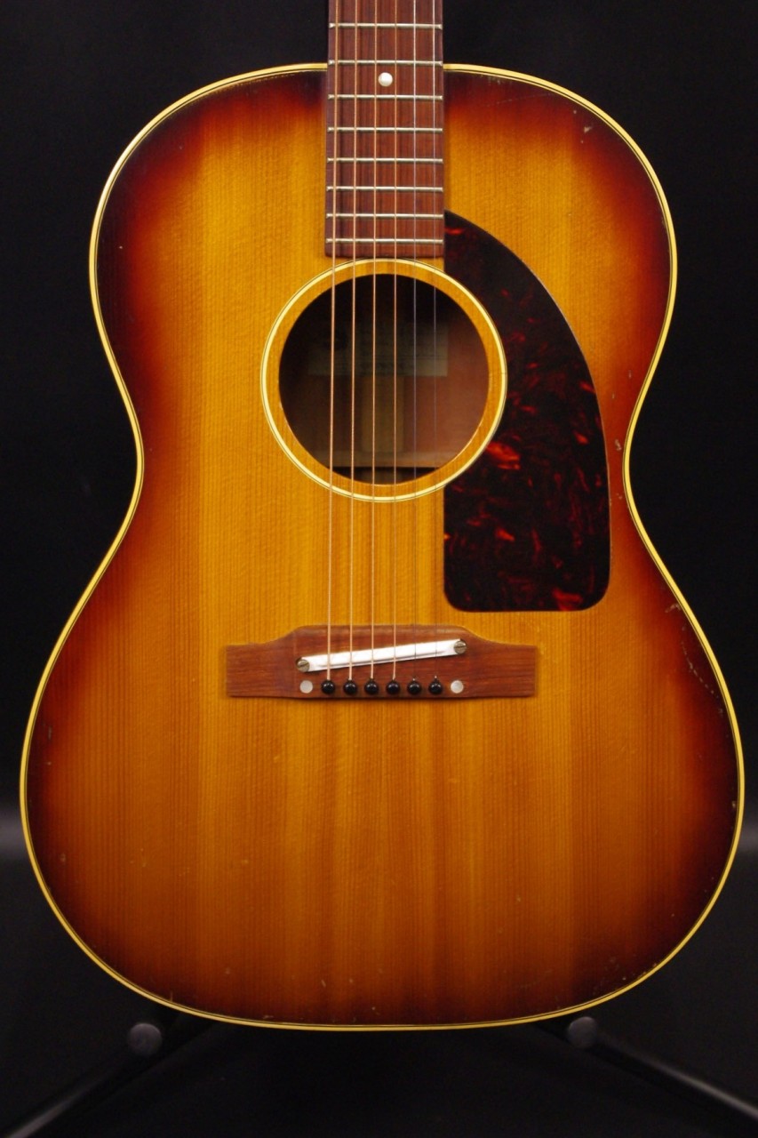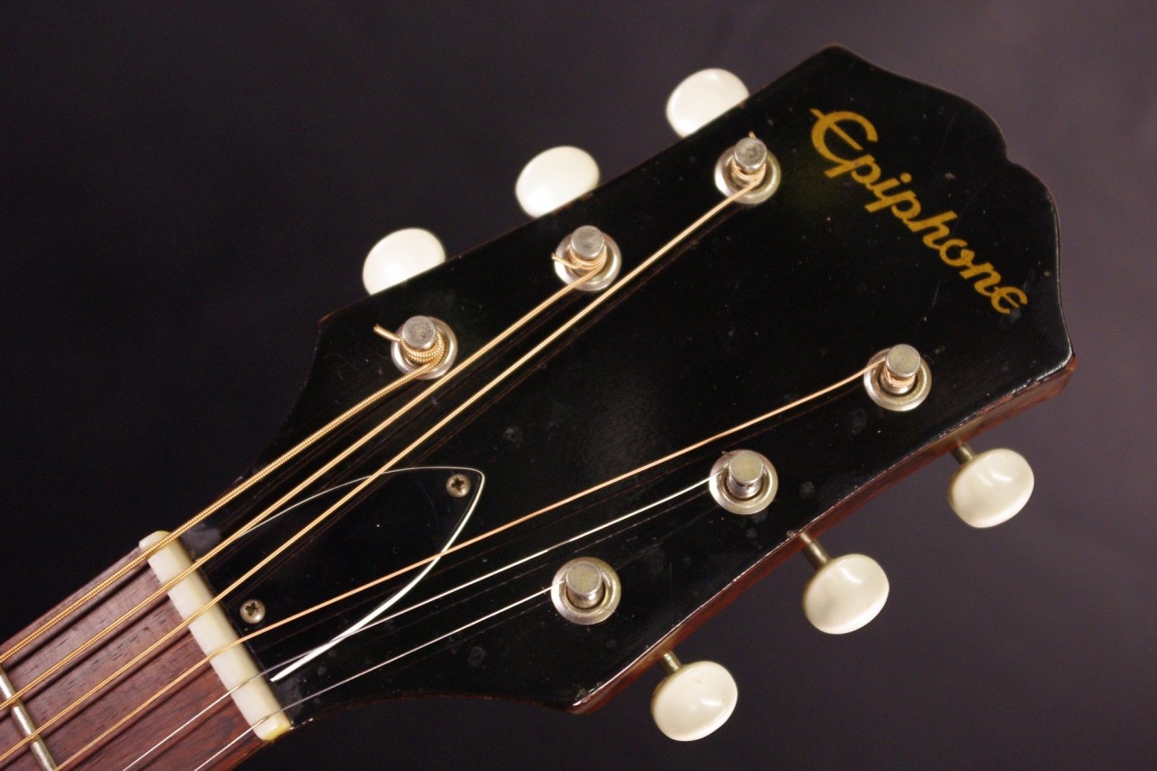 貴重な1962年製のエピフォン FT-45 Cortezが入荷しました!トップはスプルース、サイドバックにはマホガニー、指板とブリッジにはハカランダを採用、ギブソンのLGやB-25等と同じくらいのスモールボディで抱えやすく扱いやすいモデルです!シリアルナンバーから1962年製でこの時期までは幅広いヘッドが特徴!市場でも滅多に出てきません!クルーソン製の3連ペグ、ピックガード、ブリッジもオリジナルで残っていました。ネックヒールへのストラップピン加工、またピックアップの取り付け加工もございません。打痕傷、ウェザーチェックは出ていますが60年以上経過した個体としては状態がよくオールドとしての雰囲気、サウンドも抜群です!ナット幅は約42mm、60年代後期と比べると幅広いネックもこの時期の特徴です。ネックのアングルも理想的でトラうロッドの動作も問題なく機能しています。フレットの減りは少々出ていますが今後もまだまだお使いいただけます。弦高もハイポジションまで押さえやすく調整しています。サドルの上下にも余裕がありお好みに合わせた微調整にもお応えいたします。ビンテージの最高に乾いた味わい深いサウンド!指で弾いても粒立ちが良くストロークではジャキジャキと歯切れがよくスッキリと前に抜けてくれますよ!入手困難!是非この機会にお試しください!汎用ハードケース付。