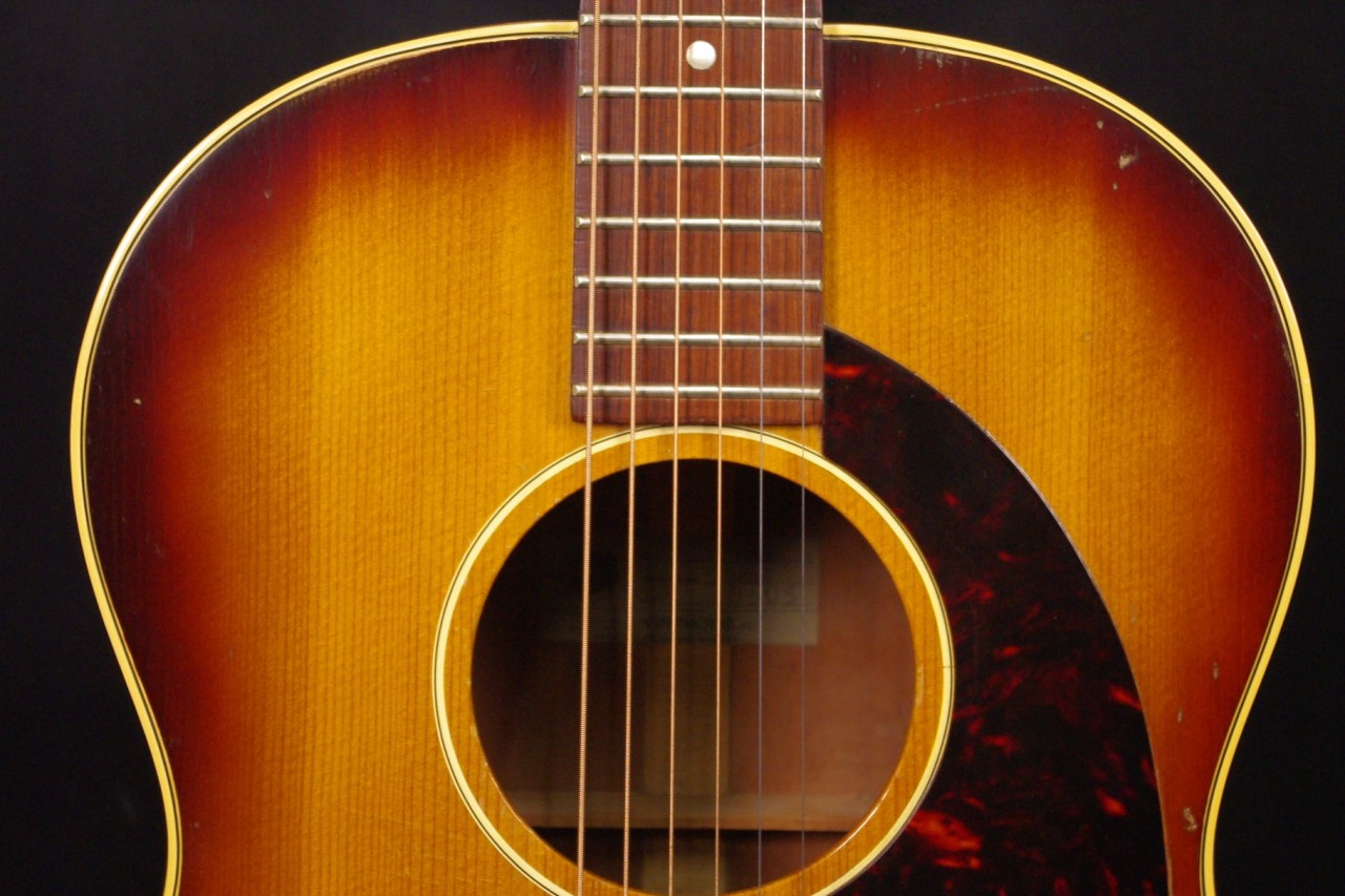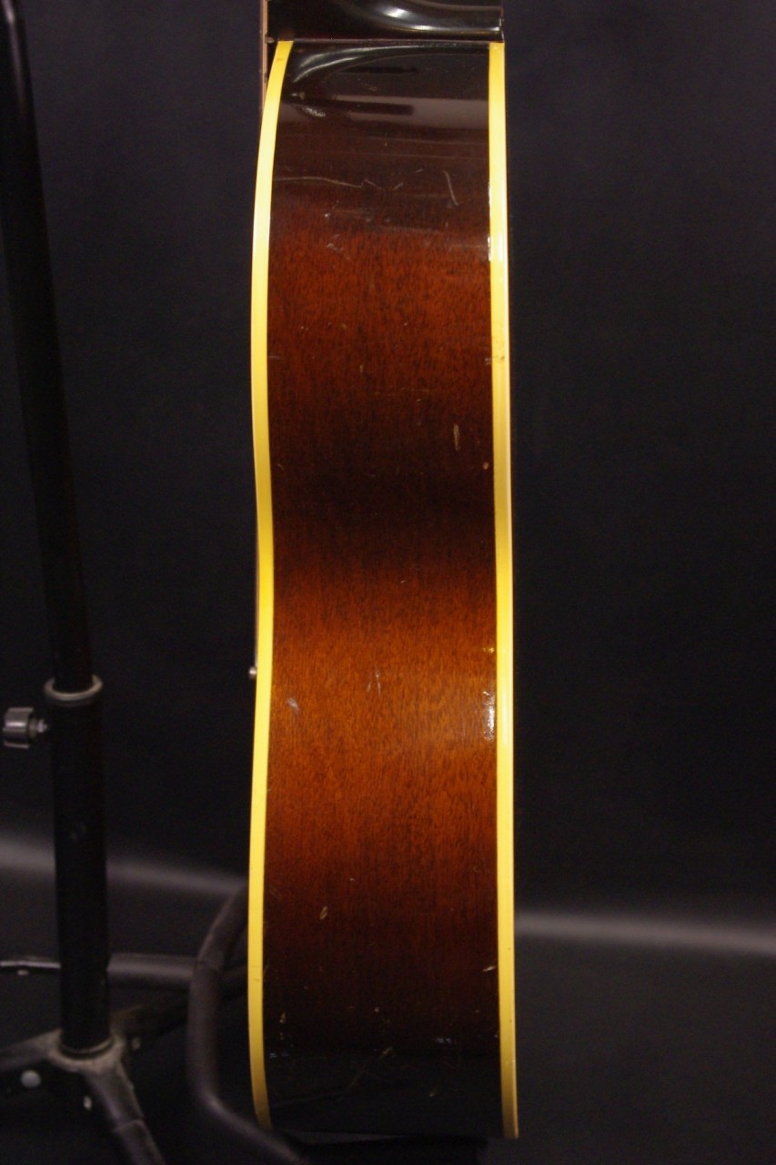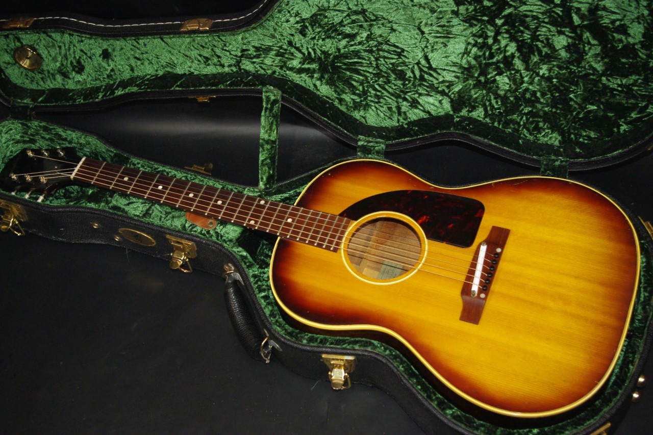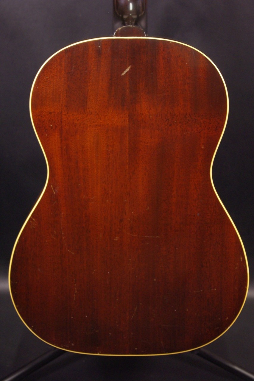 貴重な1962年製のエピフォン FT-45 Cortezが入荷しました!トップはスプルース、サイドバックにはマホガニー、指板とブリッジにはハカランダを採用、ギブソンのLGやB-25等と同じくらいのスモールボディで抱えやすく扱いやすいモデルです!シリアルナンバーから1962年製でこの時期までは幅広いヘッドが特徴!市場でも滅多に出てきません!クルーソン製の3連ペグ、ピックガード、ブリッジもオリジナルで残っていました。ネックヒールへのストラップピン加工、またピックアップの取り付け加工もございません。打痕傷、ウェザーチェックは出ていますが60年以上経過した個体としては状態がよくオールドとしての雰囲気、サウンドも抜群です!ナット幅は約42mm、60年代後期と比べると幅広いネックもこの時期の特徴です。ネックのアングルも理想的でトラうロッドの動作も問題なく機能しています。フレットの減りは少々出ていますが今後もまだまだお使いいただけます。弦高もハイポジションまで押さえやすく調整しています。サドルの上下にも余裕がありお好みに合わせた微調整にもお応えいたします。ビンテージの最高に乾いた味わい深いサウンド!指で弾いても粒立ちが良くストロークではジャキジャキと歯切れがよくスッキリと前に抜けてくれますよ!入手困難!是非この機会にお試しください!汎用ハードケース付。