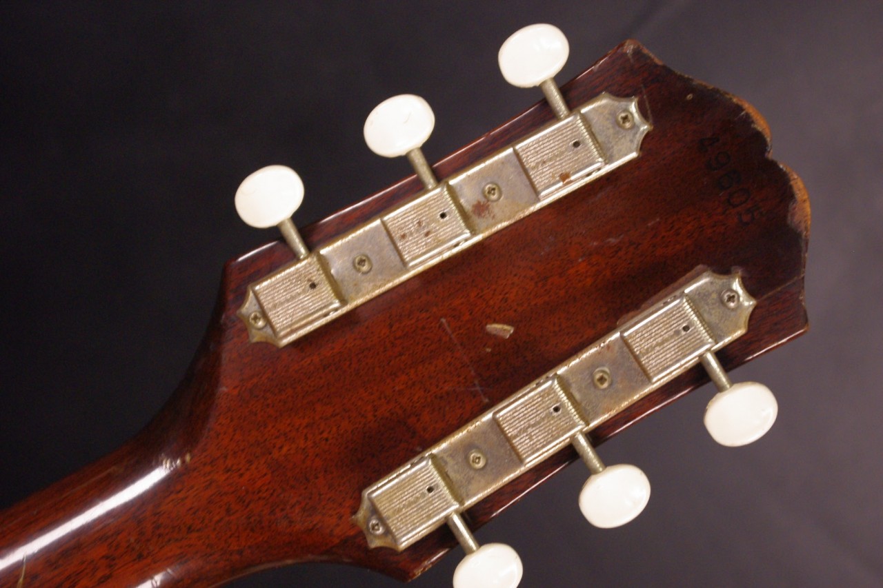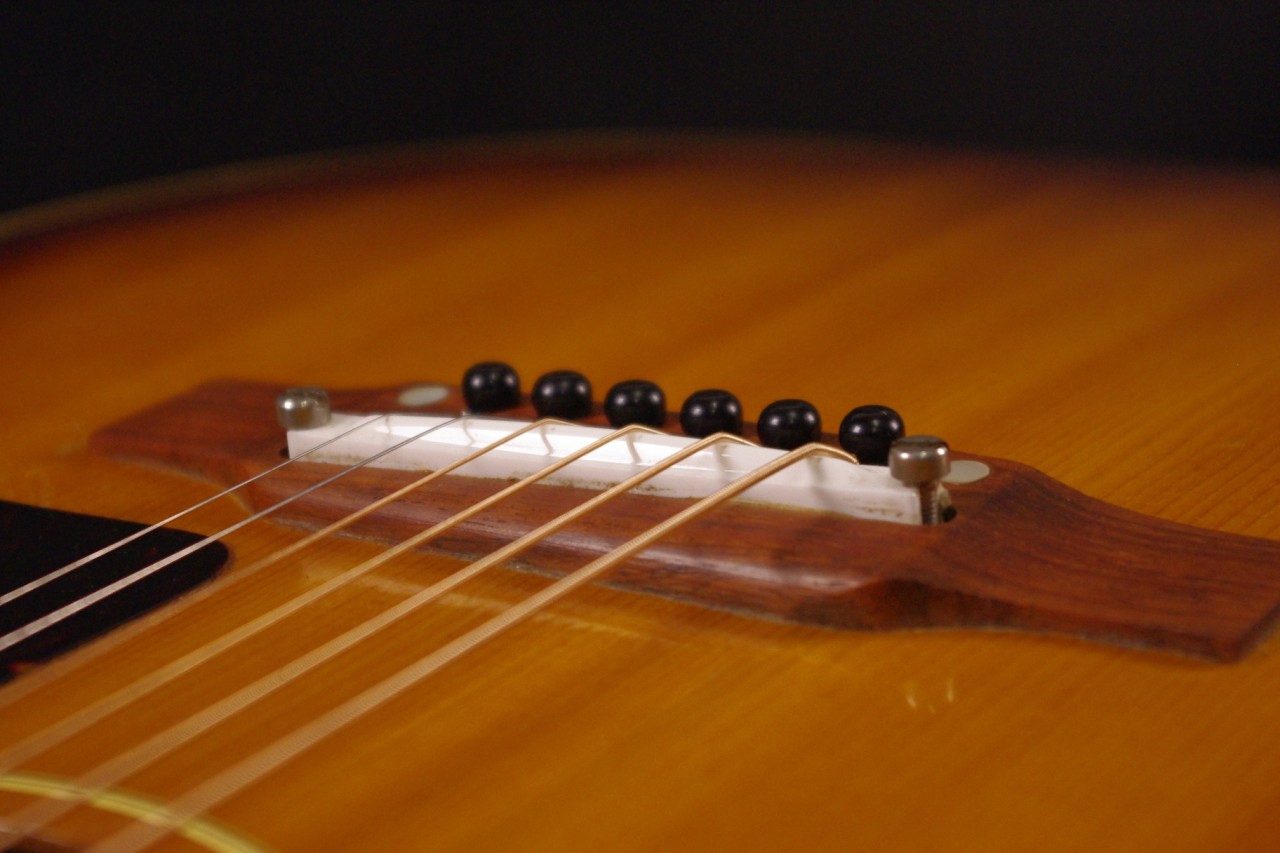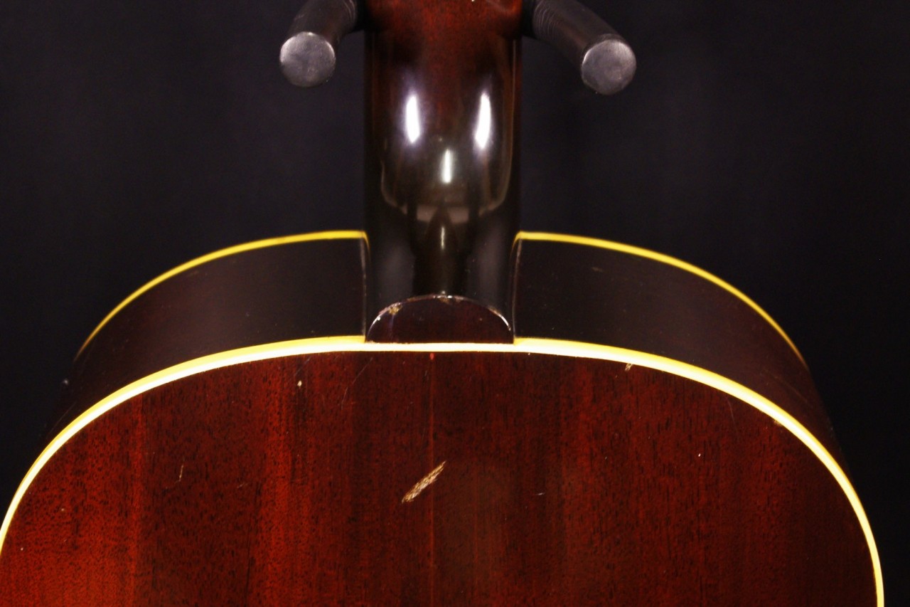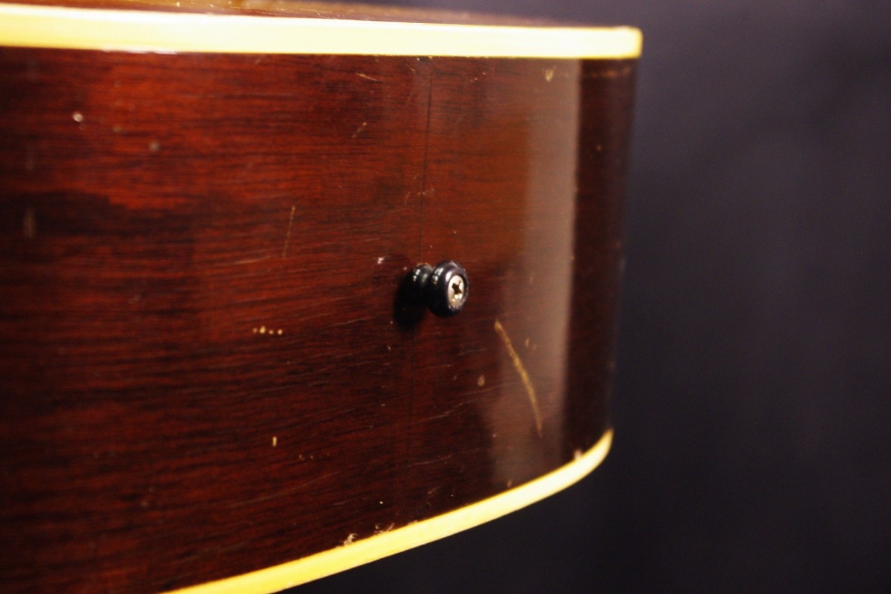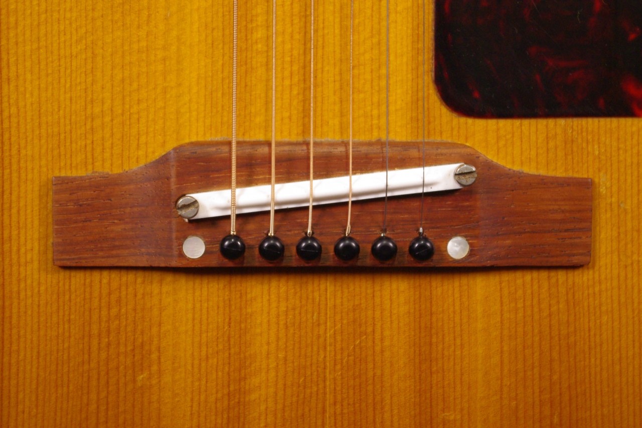 貴重な1962年製のエピフォン FT-45 Cortezが入荷しました!トップはスプルース、サイドバックにはマホガニー、指板とブリッジにはハカランダを採用、ギブソンのLGやB-25等と同じくらいのスモールボディで抱えやすく扱いやすいモデルです!シリアルナンバーから1962年製でこの時期までは幅広いヘッドが特徴!市場でも滅多に出てきません!クルーソン製の3連ペグ、ピックガード、ブリッジもオリジナルで残っていました。ネックヒールへのストラップピン加工、またピックアップの取り付け加工もございません。打痕傷、ウェザーチェックは出ていますが60年以上経過した個体としては状態がよくオールドとしての雰囲気、サウンドも抜群です!ナット幅は約42mm、60年代後期と比べると幅広いネックもこの時期の特徴です。ネックのアングルも理想的でトラうロッドの動作も問題なく機能しています。フレットの減りは少々出ていますが今後もまだまだお使いいただけます。弦高もハイポジションまで押さえやすく調整しています。サドルの上下にも余裕がありお好みに合わせた微調整にもお応えいたします。ビンテージの最高に乾いた味わい深いサウンド!指で弾いても粒立ちが良くストロークではジャキジャキと歯切れがよくスッキリと前に抜けてくれますよ!入手困難!是非この機会にお試しください!汎用ハードケース付。