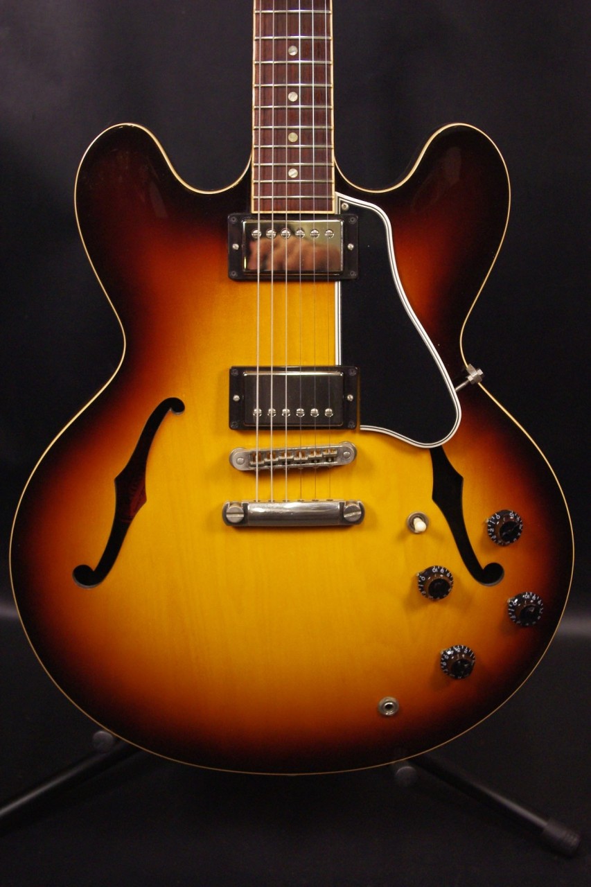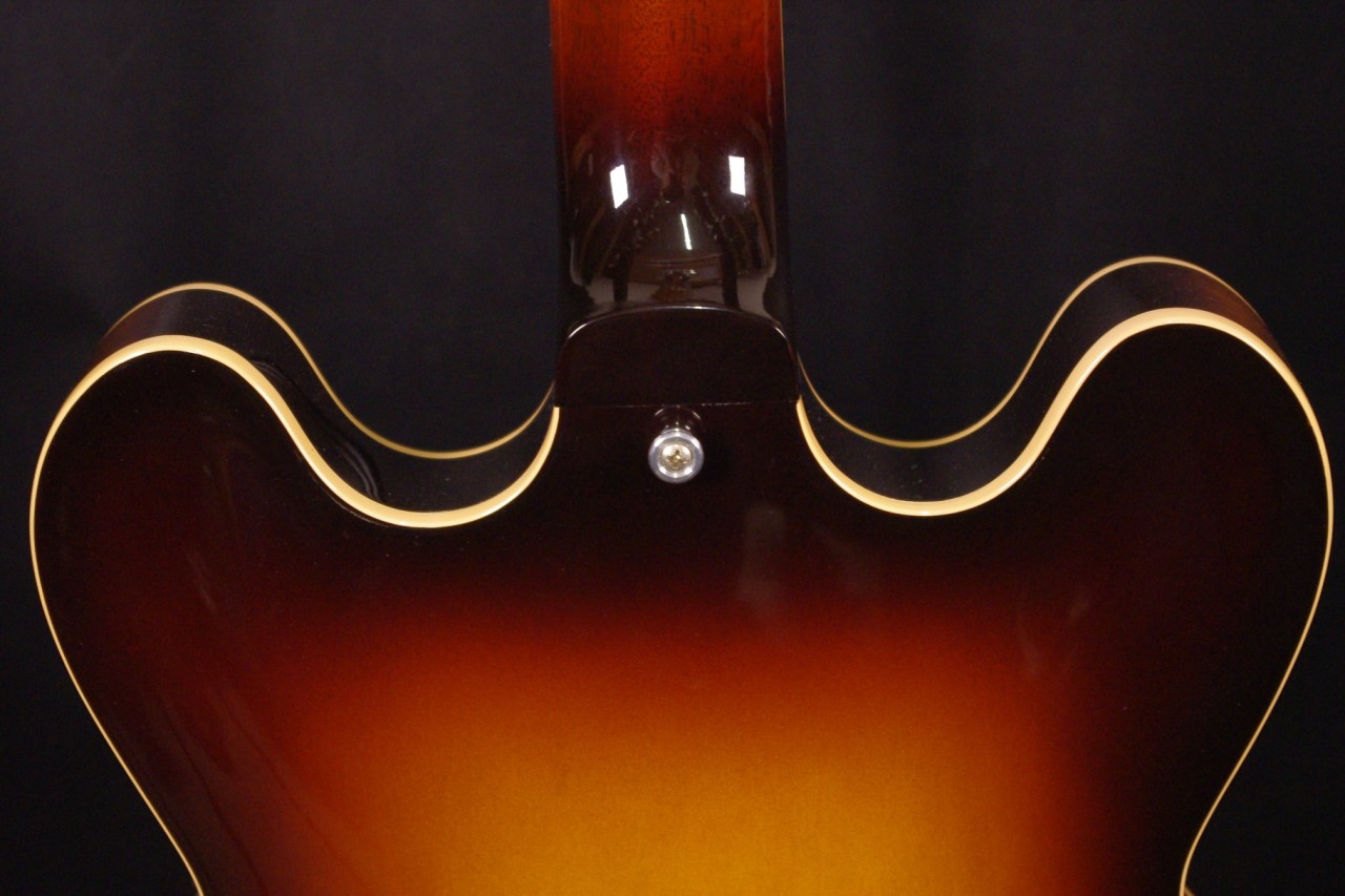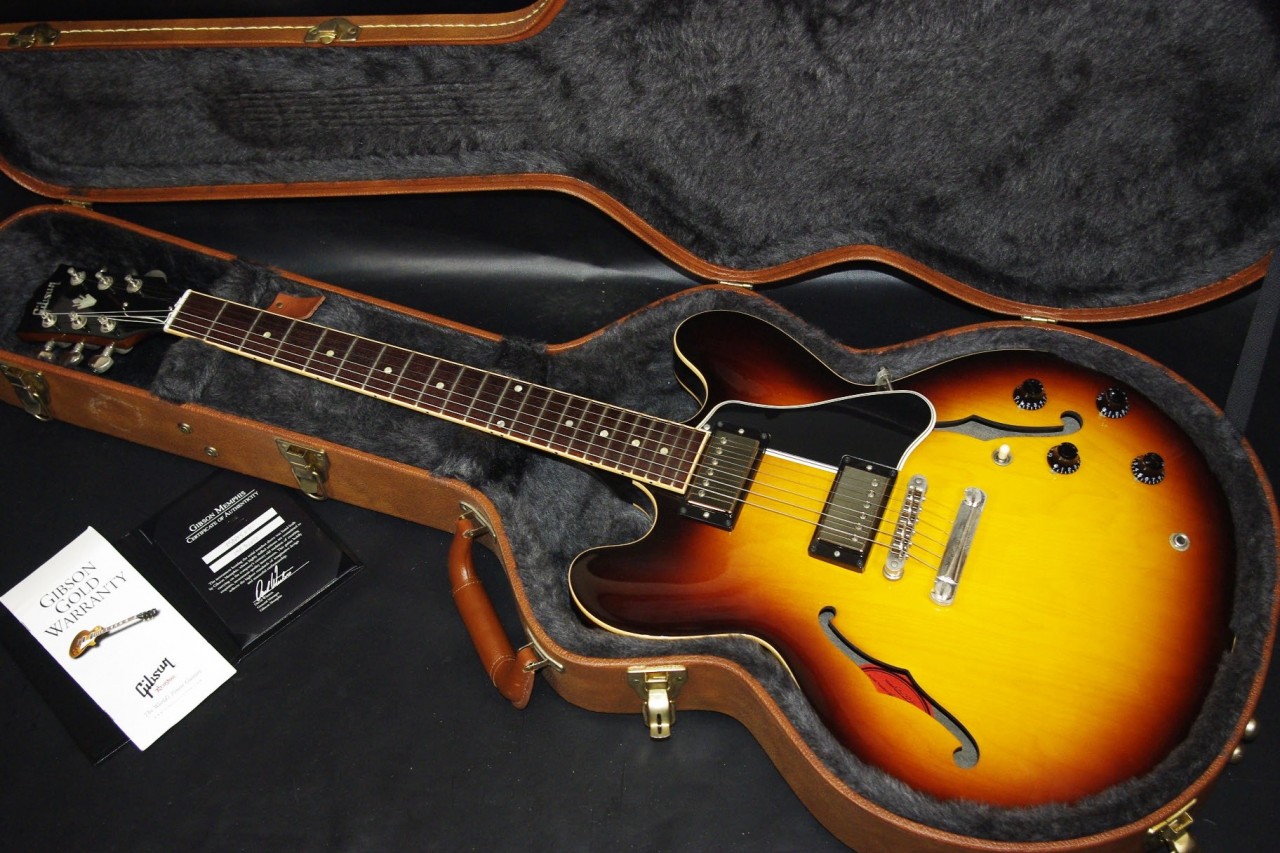 2013年にメンフィスで生産されたES-335 DOT Plainが味わい深いヴィンテージサンバーストフィニッシュで入荷しました!!メイプルとポプラを使ったボディにマホガニーの1ピースネックを採用、ピックアップには57Classic が2基搭載されておりセミホロウ特有の甘くコシのある豊かなサウンドで使い勝手が良いですね!生産から10年以上経過していますが保管状態がよく全体的に綺麗で光沢があります!グローバー製のペグ、ピックガードやブリッジなど主なパーツもオリジナルで残っていました。ナット幅は約42mmのやや薄めのグリップになります。ネックのアングルも理想的でトラスロッドの動作も問題なく機能しています。フレットもオリジナルで減りがなく長期で安心してお使いいただけます。弦高もハイポジションまでストレスを感じない高さで調整していますがお好みに合せた微調整にもお応えいたします。電気系の不具合もなく即戦力でお使いいただけます!!是非この機会にお試しください!オリジナルハードケース付き
