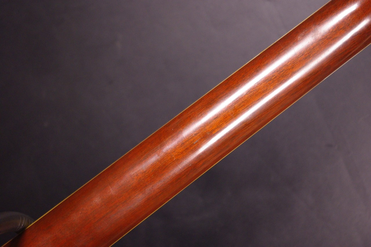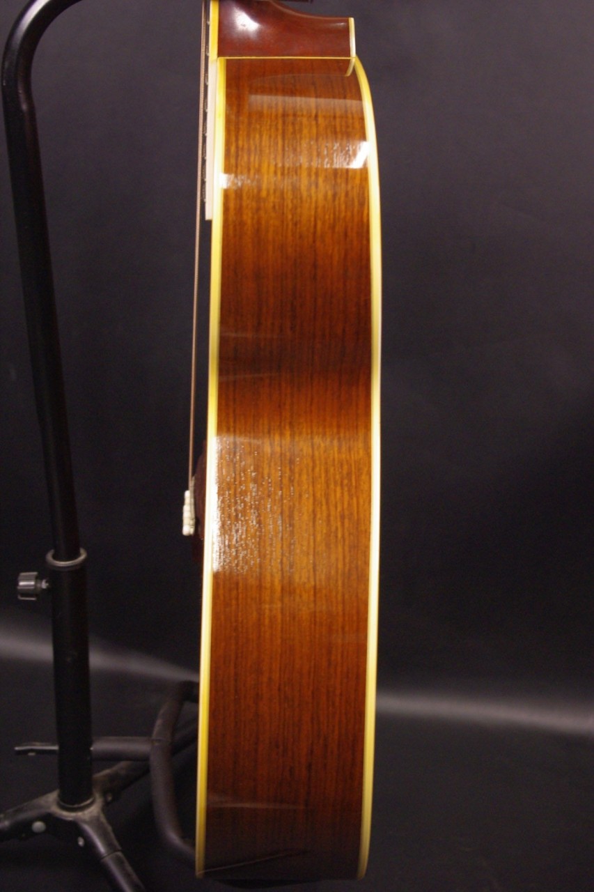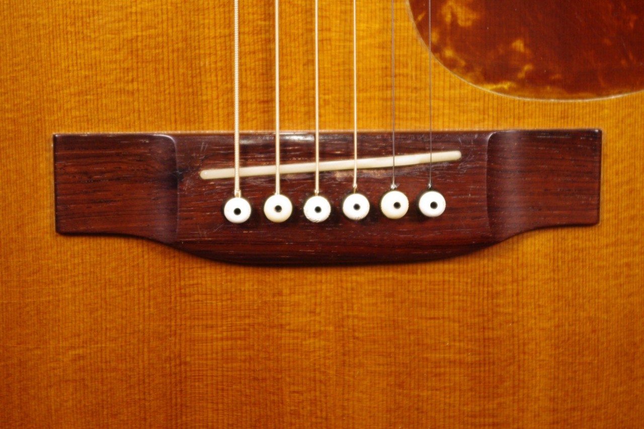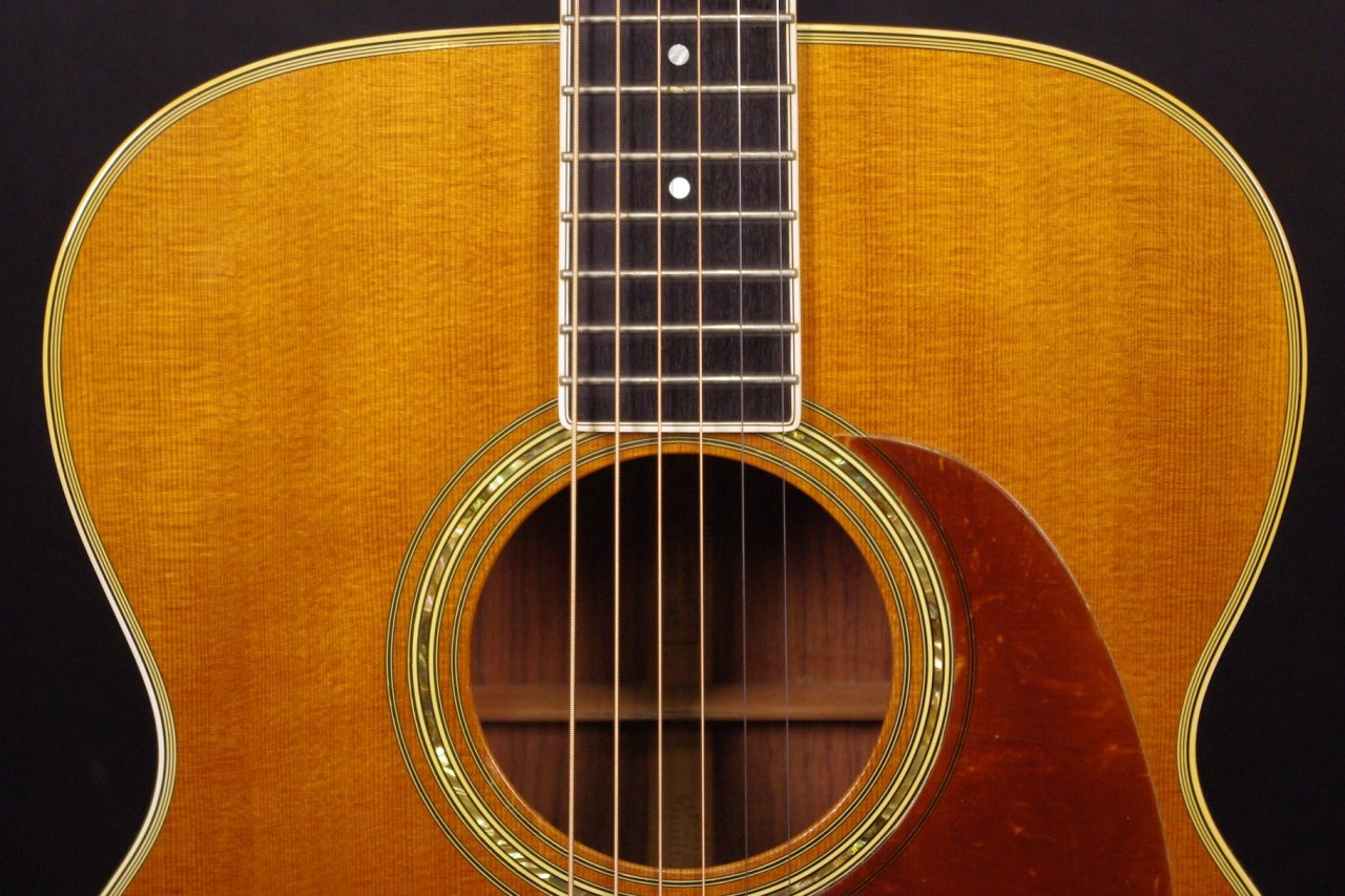 1977年から生産開始されたマーティン M-38が入荷しました!!トップはシトカスプルース、サイドバックにはインディアンローズウッド、指板はエボニーですがブリッジにはローズウッドを採用しています。トリプルオーより一回り大きいボディに約645mmのロングスケールなのが大きな特徴です。ドレッドノートと比べると薄くとても抱えやすい形状ですね!シリアルナンバーから1978年に生産された個体になります。シャーラー製のペグ、雰囲気の良いべっ甲柄ピックガード、ブリッジもオリジナルで残っていました。ネックヒールへのストラップピン加工、ピックアップの取り付け加工はございません。小傷、ウェザーチェックは出ていますが全体的に綺麗でオールドらしい雰囲気が堪りません。ナット幅は約42mmの太すぎない握りやすいグリップになります。ネックのアングルは僅かな順反りはありますが許容範囲です。フレットは交換済みで長期で安心です。サドル残は少なめですが弦高は12フレット6弦側で約2.6mm、1弦側で約1.9mmの高さで押さえやすく調整しています。煌びやかな高音が魅力でフィンガーピッキングでは美しく広がります!!スキャロップドXブレーシングを採用していますのでハリ、ヴォリューム感がありストロークもパワフル!滅多に出てこない70年代モデル!探していた方は是非この機会にお試しください。オリジナルハードケース付。