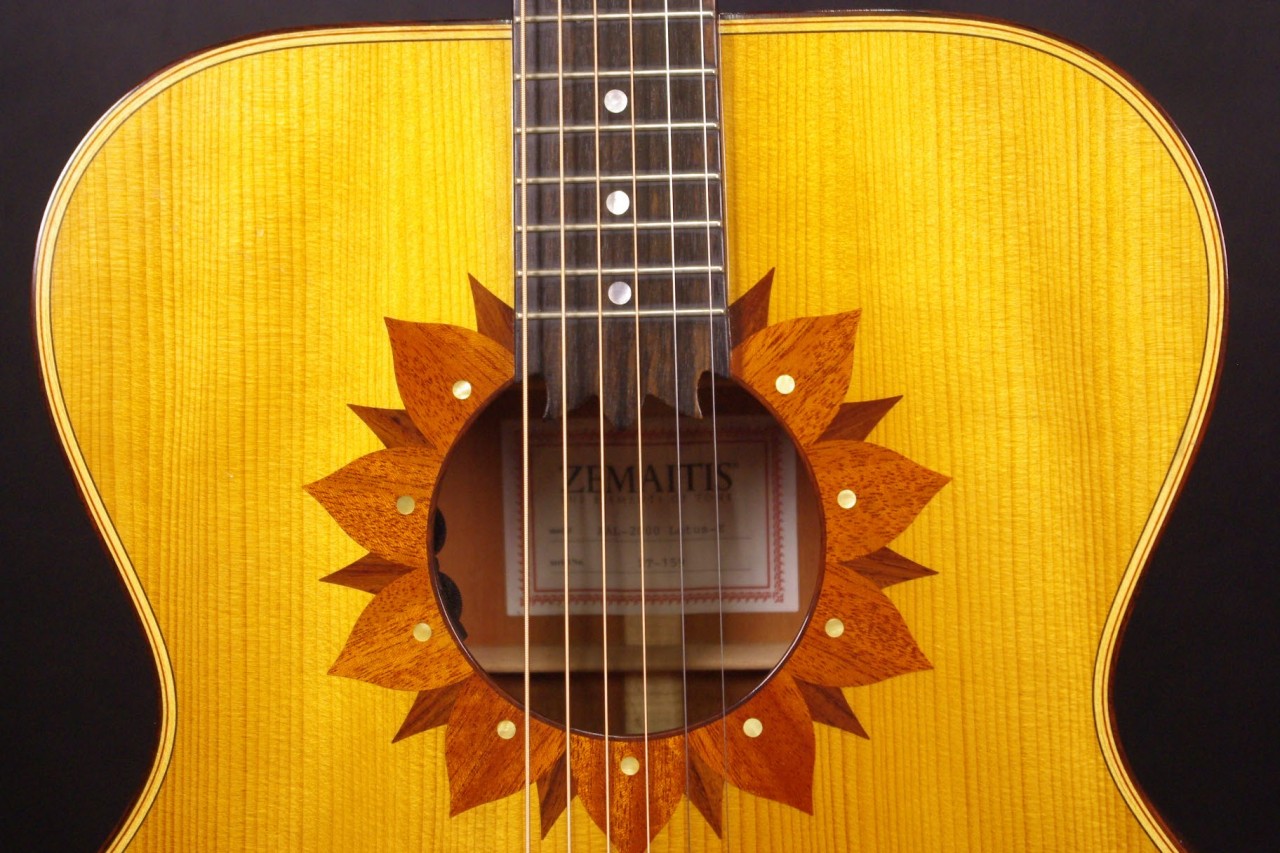 ゼマイティスのアコースティックギターAAL-2000 Lotus-Eが入荷しました!!トップにはアディロンダックスプルース、サイドバックにはマホガニーの厳選された材を採用、17インチの迫力あるボディにFishman Matrix Infinityピックアップが搭載されておりライブでもご使用いただけます!日本製で作りもよいので安心いただけます。ヘッドには彫刻されたアルミプレート、フィンガーボードやブリッジなどゼマイディスらしい個性的な装飾、パーツも嬉しいですね!ゴトー製のペグはオリジナルです。所々に打痕傷、エンドジャックの位置変更、ネックヒールへはストラップピンが打っています。状態、演奏性、サウンドが優れています!ナット幅は約42mmの標準サイズで幅広い演奏に適しています。ネックのアングルも理想的でトラスロッドの動作も問題なく機能しています。フレットは少々減りは出ていますが長期でまだまだ使えます。弦高は12フレット6弦側で約2.7mm、1弦側で約1.8mmの高さで押さえやすく調整しています。サドル残もありお好みに合せた微調整にもお応えいたします。17インチボディの豊かな低域が持ち味!マホガニーのカラッと乾いた抜けの良い高音も魅力です!!是非この機会にお試しください!オリジナルハードケース付。