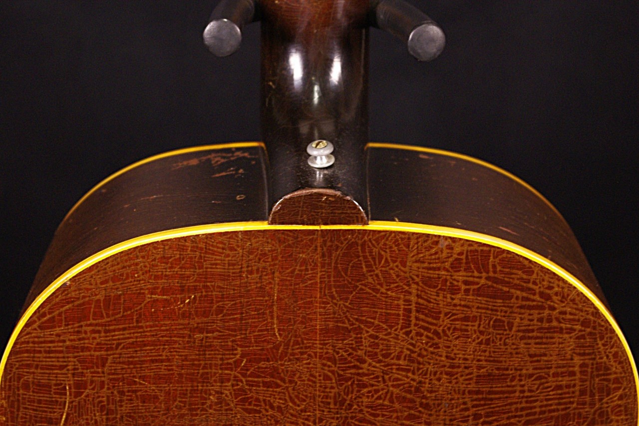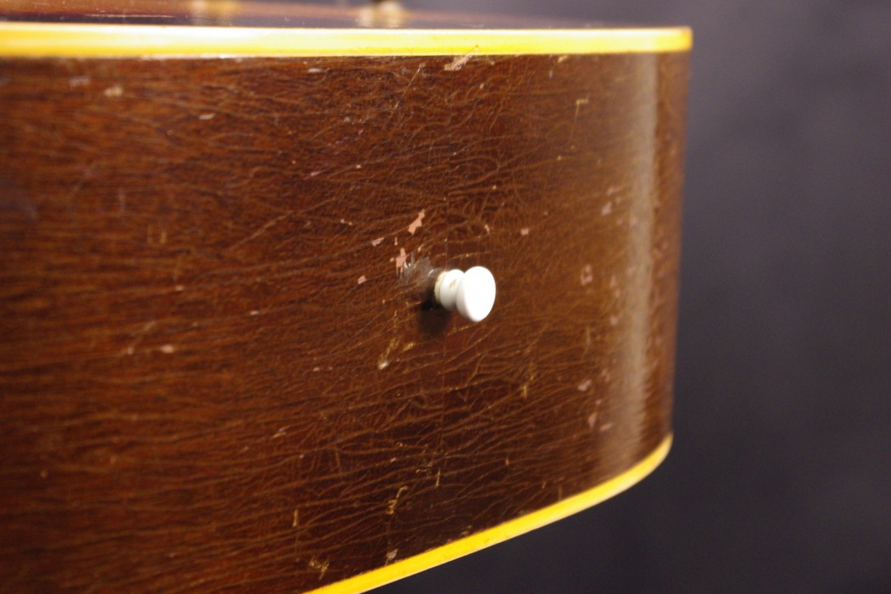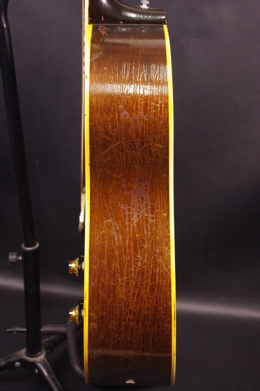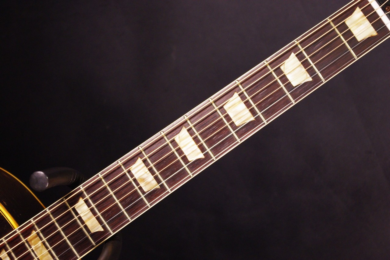 1950年代ダイヤル式アジャスタブルブリッジ仕様のJ-160Eが入荷しました!!トップはスプルース、サイドバックにはマホガニー、指板とブリッジにはハカランダを採用、ラウンドショルダーボディにラダーブレーシング、P-90ピックアップが搭載されているのが大きな特徴です。シリアルナンバーから1956年に生産された個体でサウンドホール周囲に激しい弾き傷、全体的に傷、ウェザーチェックが多めに入っておりヴィンテージらしい貫録が堪りません!バッククラック補修があり落ち着いています。クルーソン製のペグ、個性的なピックガード、ブリッジもオリジナルで残っていました。ネックヒールへはストラップピンが打っています。ナット幅は約42mm、60年代と比べると厚みがありしっかりとしたグリップです。ネックのアングルも適正でトラスロッドの動作も問題なく機能しています。フレットは全体的に低めですが今なところ支障なくお使いいただけます。弦高もハイポジションまでストレスを感じないところで調整しています。サドル側での微調整も十分可能です。70年近く経過し大変弾きこまれていますので合板ですが乾いた味のあるサウンドで仕上がっています!ラインアウトではフルアコのような温かく豊かなサウンドでお楽しみいただけます!是非この機会に弾いてみてください。ヴィンテージハードケースつき