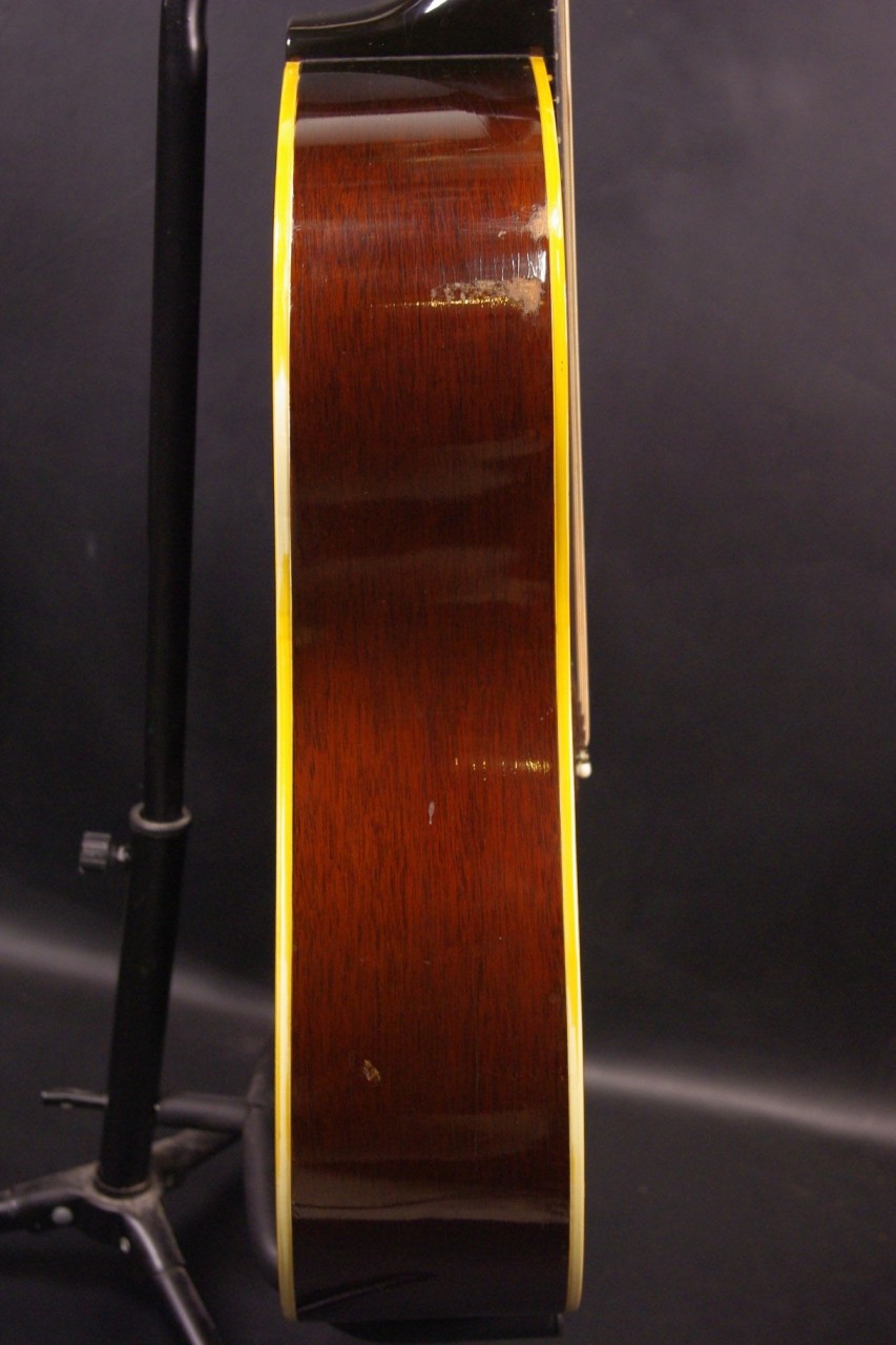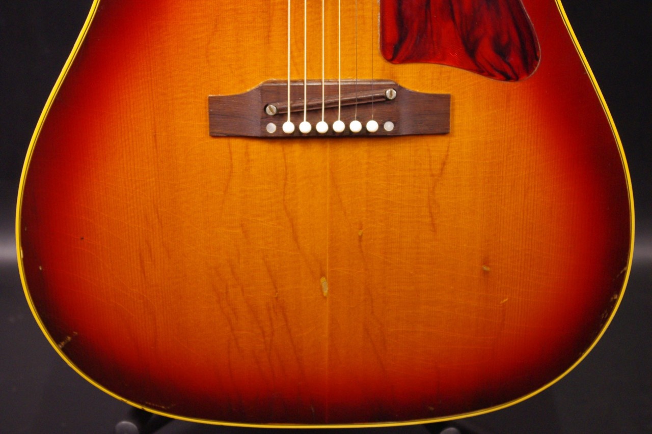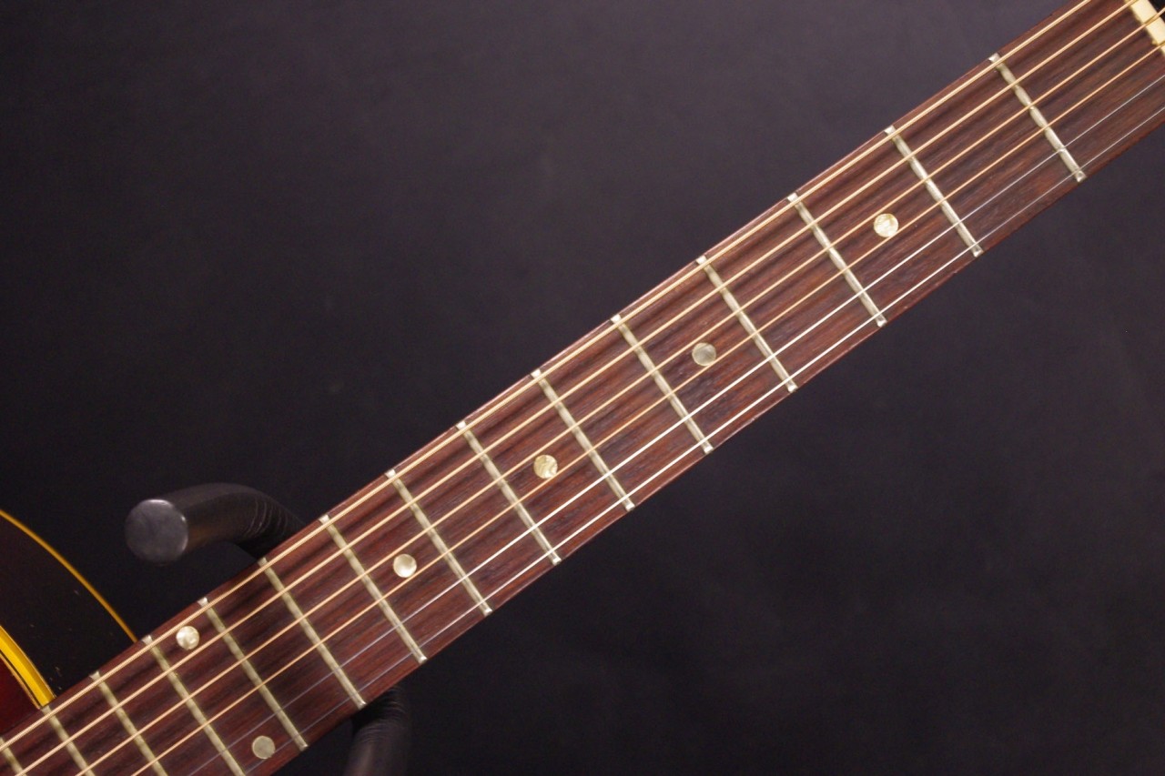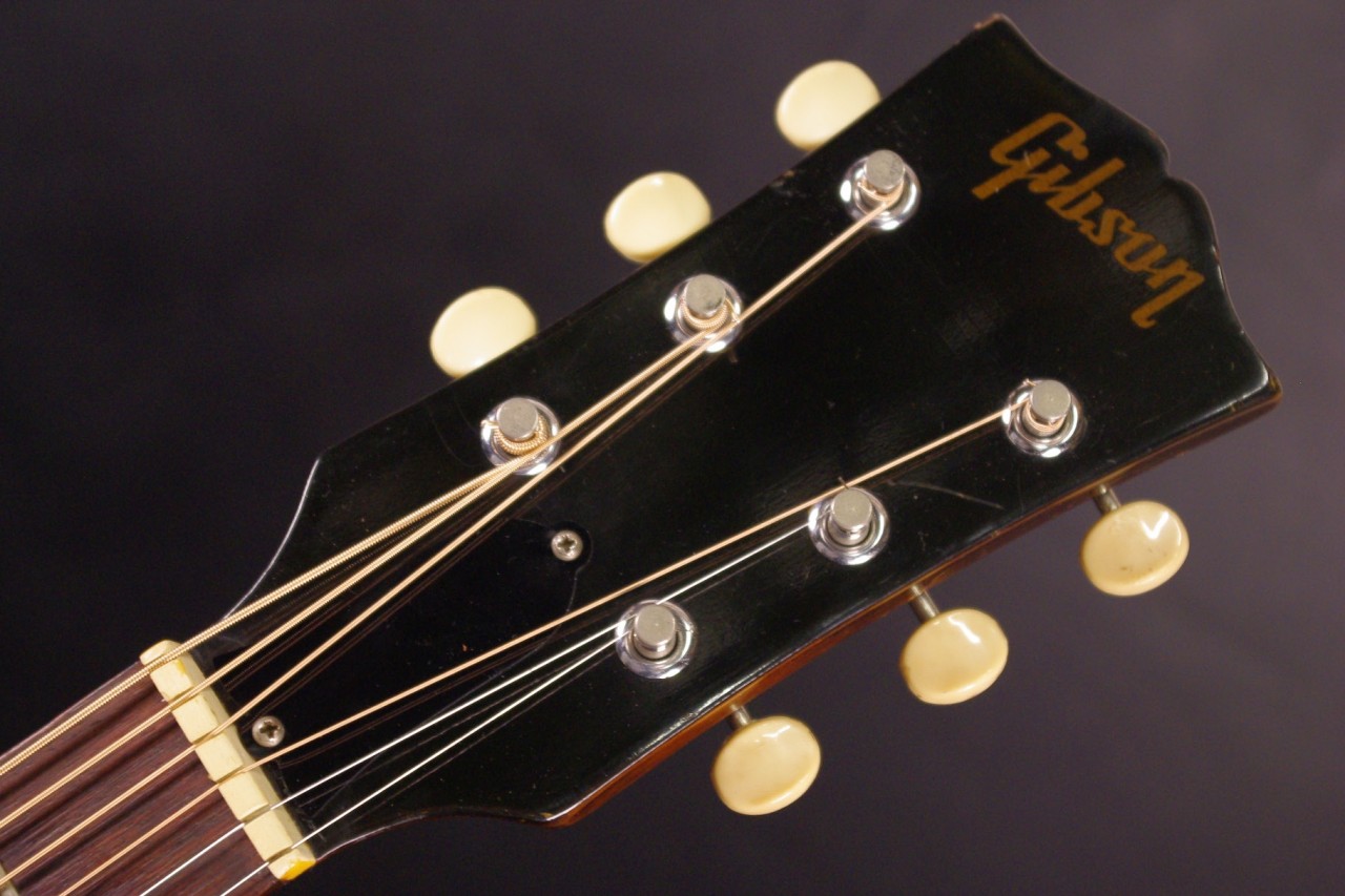 1960年代後期ナローネック仕様のJ-45が味わい深いサンバーストフィニッシュで入荷しました!トップはスプルース、サイドバックにはマホガニー、指板とブリッジまたサドルにはハカランダ材を採用、歯切れがよく特にストローク中心で演奏される方に一押し!シリアルナンバーとスペックから1968年あたりが有力です。クルーソン製3連ペグ、ギブソンロゴの入ったラージピックガードなど主なパーツもオリジナルで残っていました!トップのセンター付近と所々に打ち傷、左サイドに傷、全体的にウェザーチェックはありますがメンテナンスがよく演奏性、サウンド、雰囲気も良いです!!ネックヒールへのストラップピン加工、ピックアップなど特別な加工もございません。ナット幅は約40mmのナローネックでコードで押さえやすいです。ネックのアングルも理想的でトラスロッドの動作も問題なく機能しています。フレットは多少の減りは出ていますがまだまだ余裕があります。弦高もハイポジションまで押さえやすく調整していますがお好みに合せた微調整にもお応えいたします。50年以上前の個体で大切に弾きこまれており素晴らしく乾いたビンテージの音で仕上がっています!!プライスも魅力的!是非この機会にお試しください。オリジナルチップボードケース付。