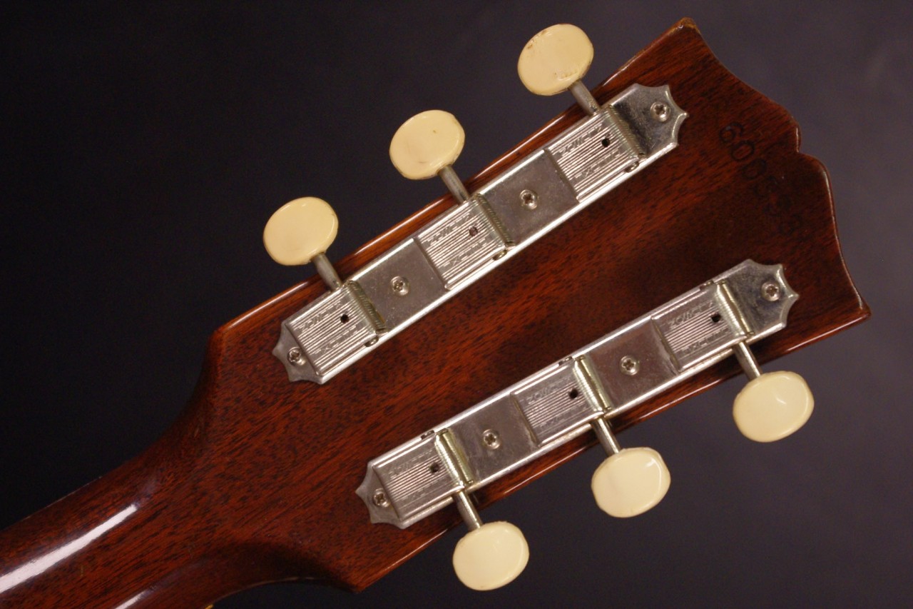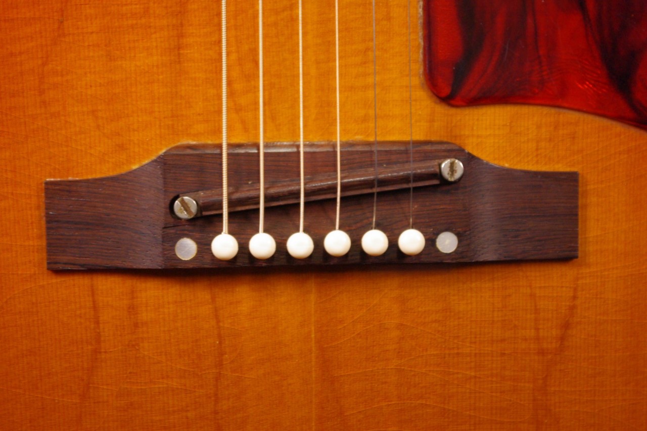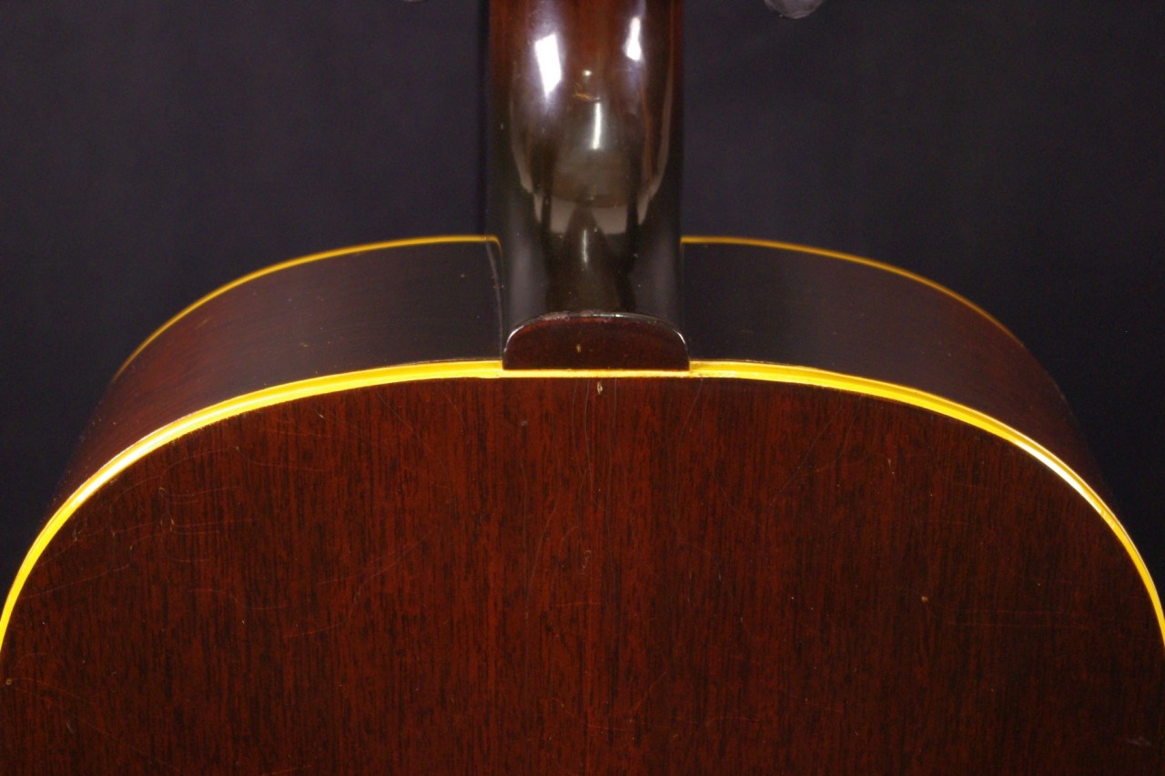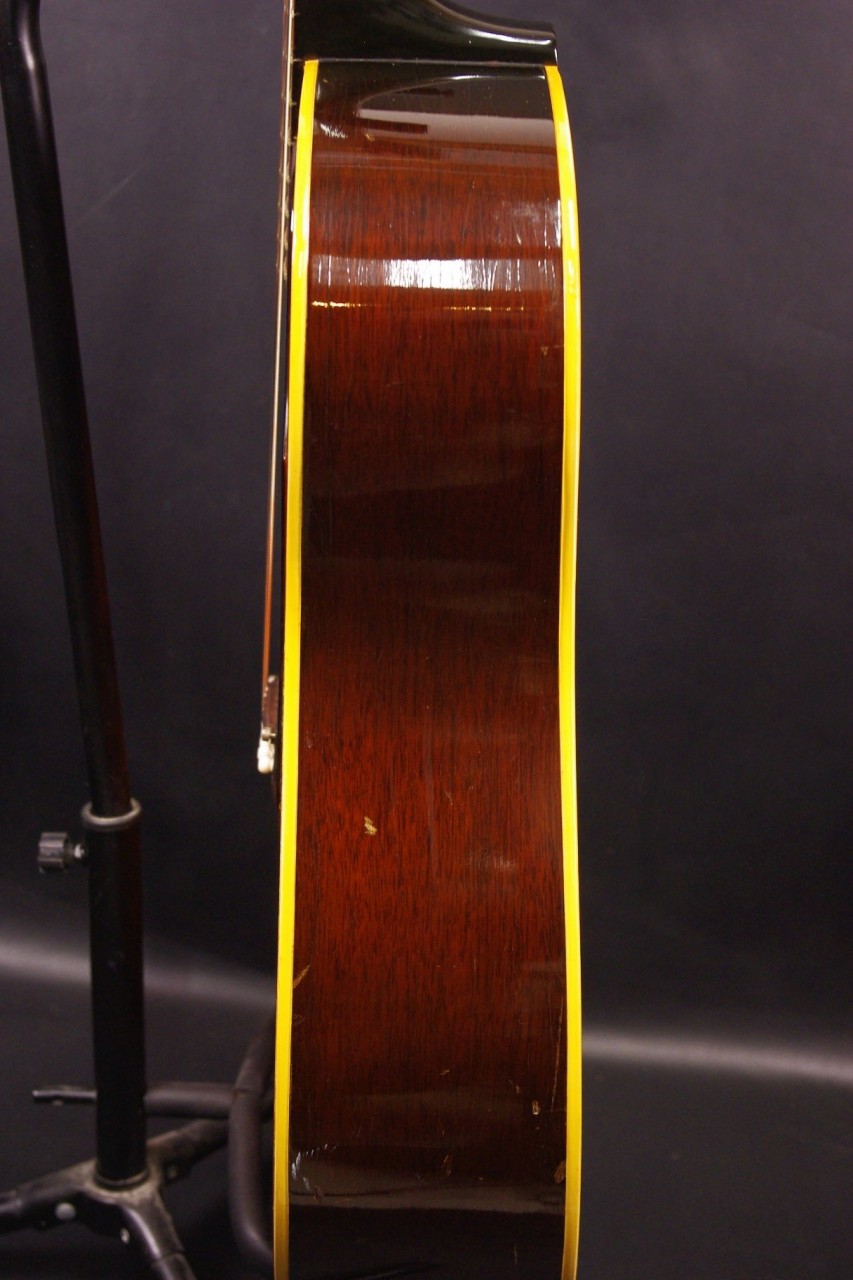 1960年代後期ナローネック仕様のJ-45が味わい深いサンバーストフィニッシュで入荷しました!トップはスプルース、サイドバックにはマホガニー、指板とブリッジまたサドルにはハカランダ材を採用、歯切れがよく特にストローク中心で演奏される方に一押し!シリアルナンバーとスペックから1968年あたりが有力です。クルーソン製3連ペグ、ギブソンロゴの入ったラージピックガードなど主なパーツもオリジナルで残っていました!トップのセンター付近と所々に打ち傷、左サイドに傷、全体的にウェザーチェックはありますがメンテナンスがよく演奏性、サウンド、雰囲気も良いです!!ネックヒールへのストラップピン加工、ピックアップなど特別な加工もございません。ナット幅は約40mmのナローネックでコードで押さえやすいです。ネックのアングルも理想的でトラスロッドの動作も問題なく機能しています。フレットは多少の減りは出ていますがまだまだ余裕があります。弦高もハイポジションまで押さえやすく調整していますがお好みに合せた微調整にもお応えいたします。50年以上前の個体で大切に弾きこまれており素晴らしく乾いたビンテージの音で仕上がっています!!プライスも魅力的!是非この機会にお試しください。オリジナルチップボードケース付。