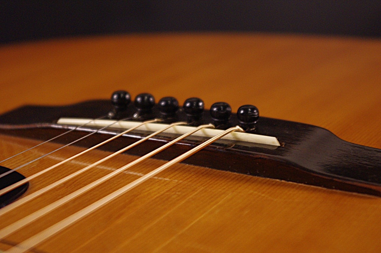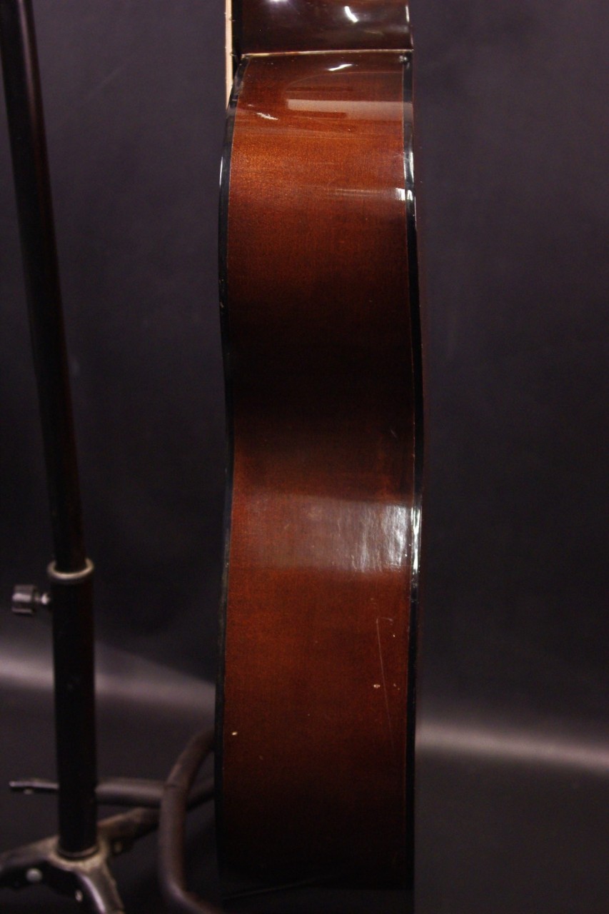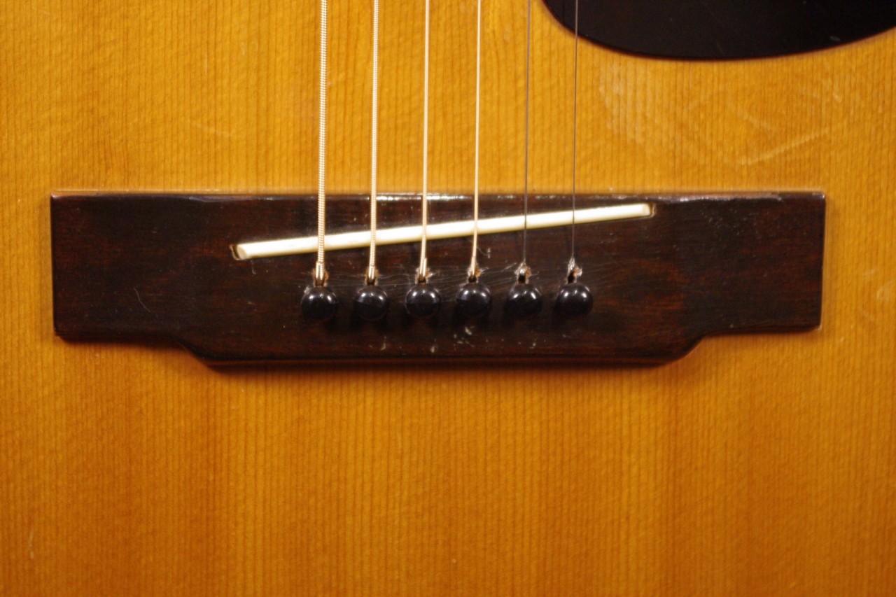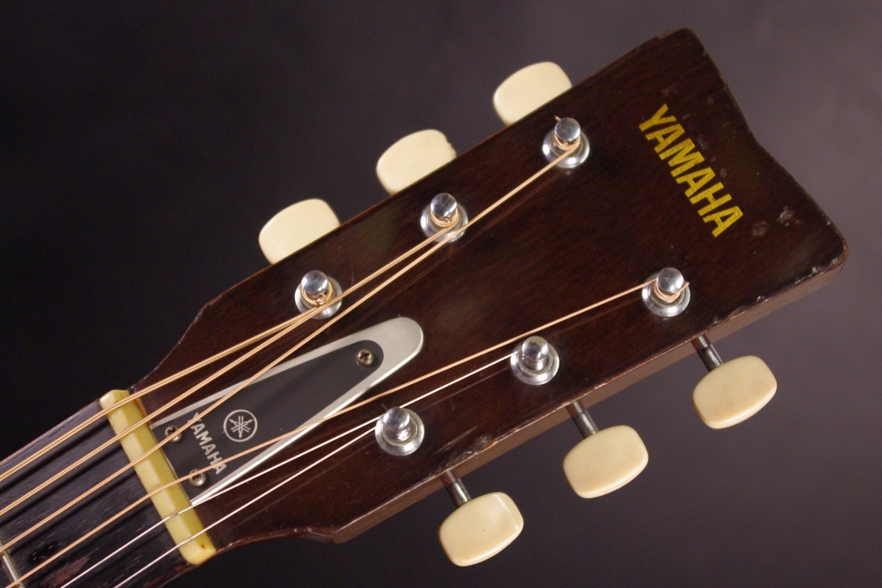 1968年製 YAMAHAロゴ期のFG-110が入荷しました!トップはスプルース、サイドバックには楓、指板とブリッジにはブビンガを採用したフォークサイズで手軽にお楽しみいただけるジャパンビンテージです!!傷、使用感はありますが生産から50年以上経過しているわりには綺麗に残っていました。オープンバックペグ、ピックガード、ブリッジもオリジナルで残っています。ネックヒールへのストラップピン加工、ピックアップの取り付けもございません。ナット幅は約44mmのやや太めのしっかりとしたグリップです。ネックアングルも適正でトラスロッドの動作も問題なく機能しました。フレットは多少の減りは出ていますが今後もまだまだ余裕があります。弦高は12フレット6弦側で約2.8mm、1弦側で約2.2mmの高さで調整しています。サドル残は少なめですが少し調整が可能です。スモールボディですが音量がありボディ全体で響きます!!FG-150と比べると硬質でパリッと乾いたサウンドでスッキリと前に抜けてくれます!是非この機会にどうぞ!ソフトケース付き。