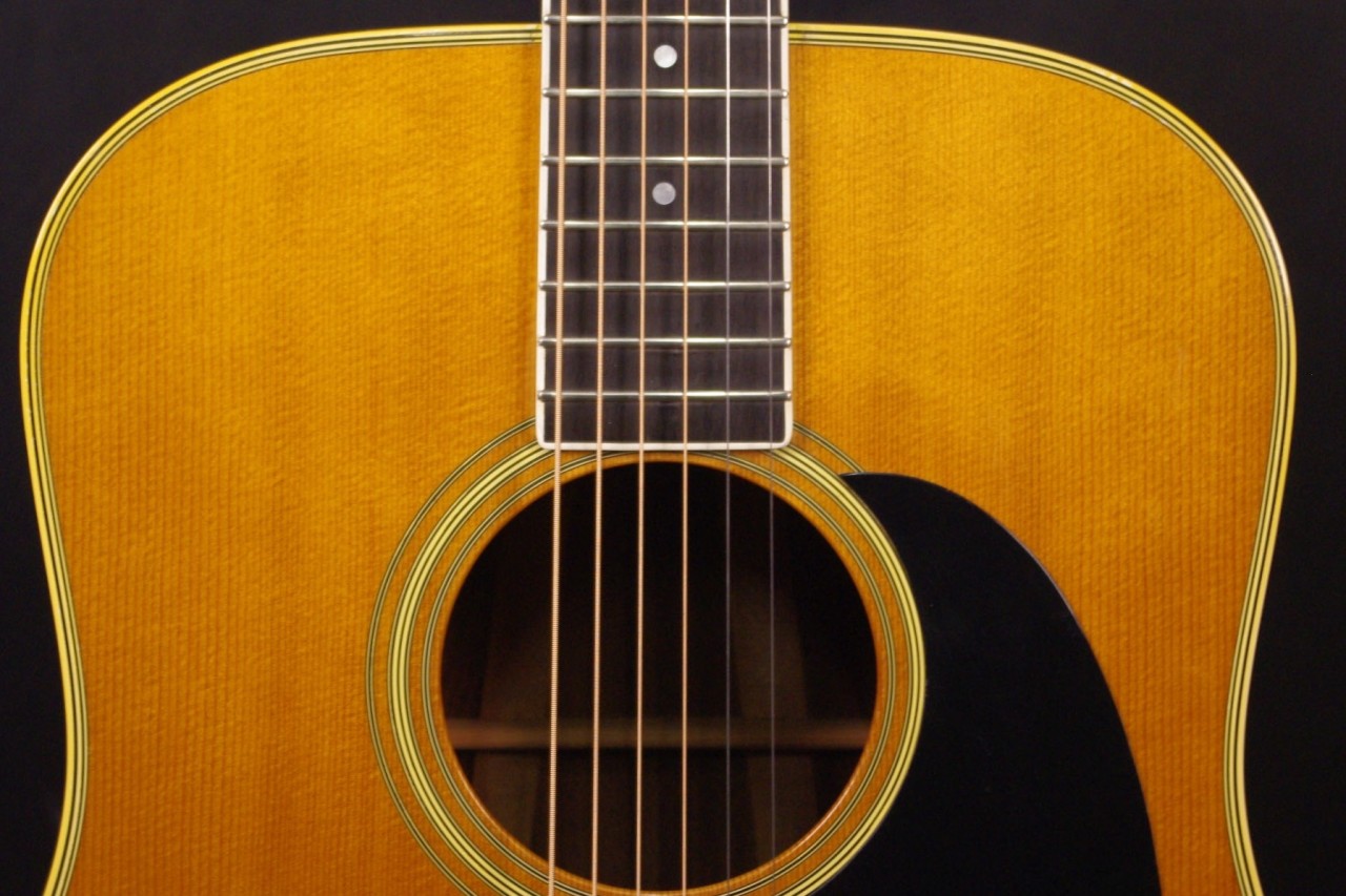 1970年代SQロッド期のD-35が入荷しました!!スプルーストップ、サイドバックにはインディアンローズウッドの3ピースバック、指板とブリッジにはエボニーを採用、同時期のD-28と比べると甘く暖かな心地よいサウンドが持ち味!!シリアルナンバーから1973年に生産された個体で細かな傷はありますが目立った傷、割れもなく年式の割には大変綺麗で光沢があります!!バインディングの剥がれ補修、ピックガード交換、ネックリセットなど調整も行き届いており演奏性、サウンドが抜群に良いので安心です!グローバーペグ、エボニーブリッジはオリジナルで残っています。ネックヒールへのストラップピン加工、ピックアップの取り付け加工もございません。ナット幅は約43mm、SQロッド期のしっかりとしたグリップです。ネックリセット済みでアングルも適正で調弦時に若干の順反りはでますが気にならない程度です。フレットはすり合わせしていますが高さも十分残っています。弦高は12フレット6弦側で約2.6mm、1弦側で約1.6mmの高さでハイポジションまで押さえやすく調整しています。ブリッジもオリジナルの高さでサドル残も確保していますので将来の微調整も安心です。コードストロークでは纏まりがよく低中音が気持ちよく膨らみパワフル!指で弾いても美しく広がります!D-35らしい柔らかさが堪りませんね!是非この機会にお試しください!オリジナルマーティンブルーケース付!