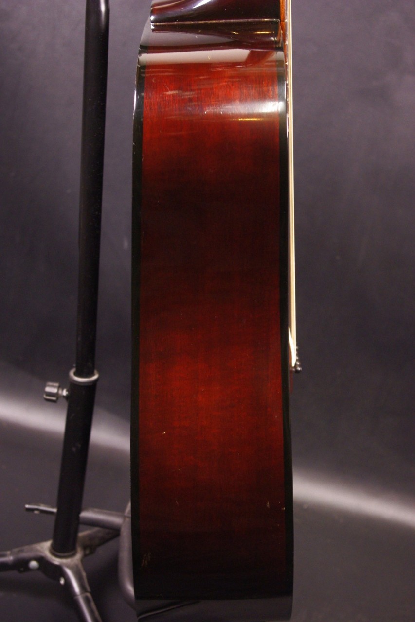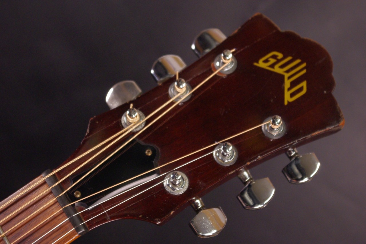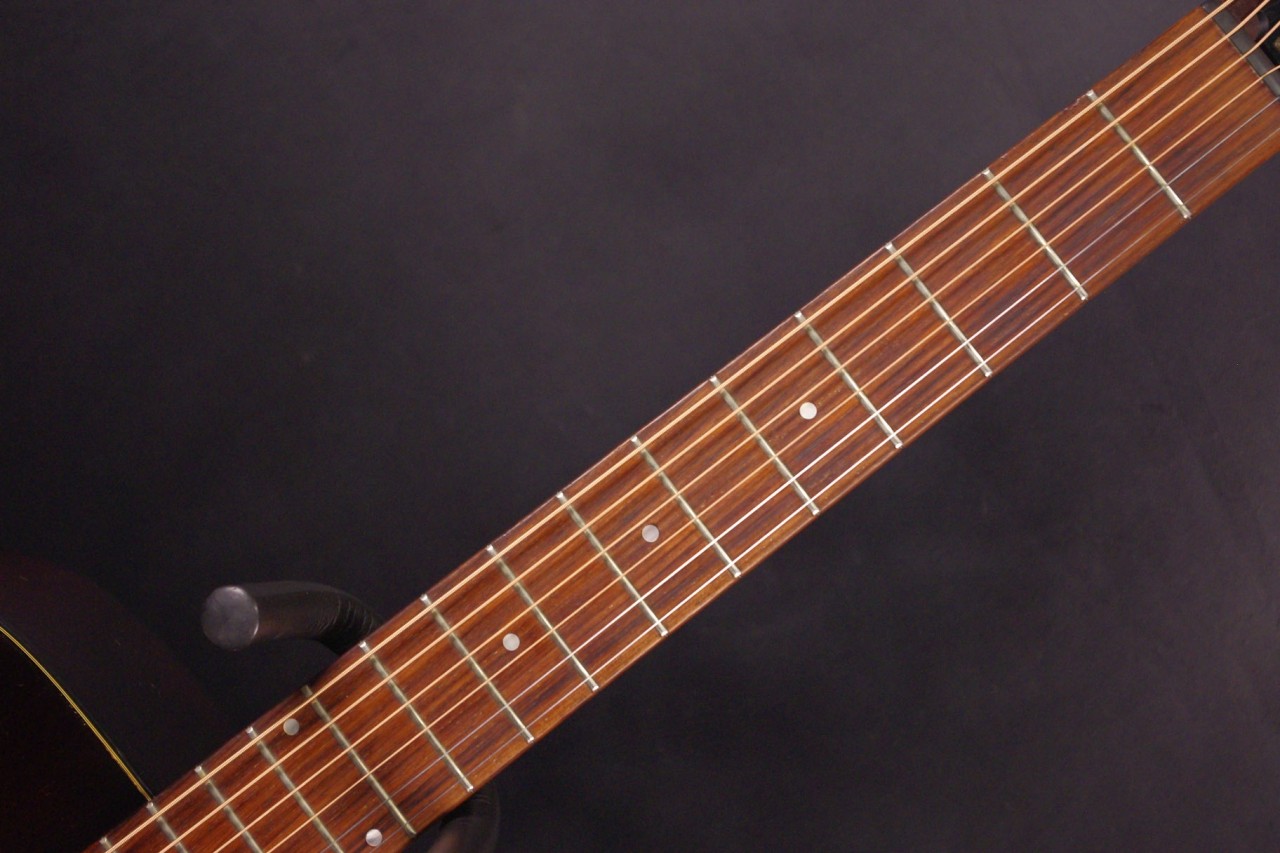 1980年代のギルド D-35が珍しいブラウンサンバーストフィニッシュで入荷しました!!トップはスプルース、サイドバックにはマホガニー、指板とブリッジにはローズウッドを採用したドレッドノートタイプです!ボディ内部のスタンプから1981年製で全体的に傷がありますがメンテナンスの行き届いた個体でおすすめです!ヘッドの耳貼りに沿って線が出ていますが表面上で演奏上支障ございません。ペグ、べっ甲柄ピックガード、ブリッジはオリジナルで残っていました。ネックヒールへのストラップピン加工、ピックアップ加工はございません。ナット幅は約42.5mmの太すぎないしっかりとしたネックグリップでアングルも適正でトラスロッドの動作も問題なく機能しています。フレットの高さもあり今後もまだまだお使いいただけます。弦高は12フレット6弦側で約2.1mm、1弦側で約1.6mmの高さでハイポジションまで押さえやすく調整しています。ブリッジもオリジナルの高さでサドル残もあり微調整にもお応えいたします。40年以上経過しており乾いた味わい深いサウンドで仕上がっています!!ギルドらしいどっしりとした粘り強さが堪りません!マーティン、ギブソンと比べるとプライスも魅力!!是非この機会にどうぞ!ハードケース付。