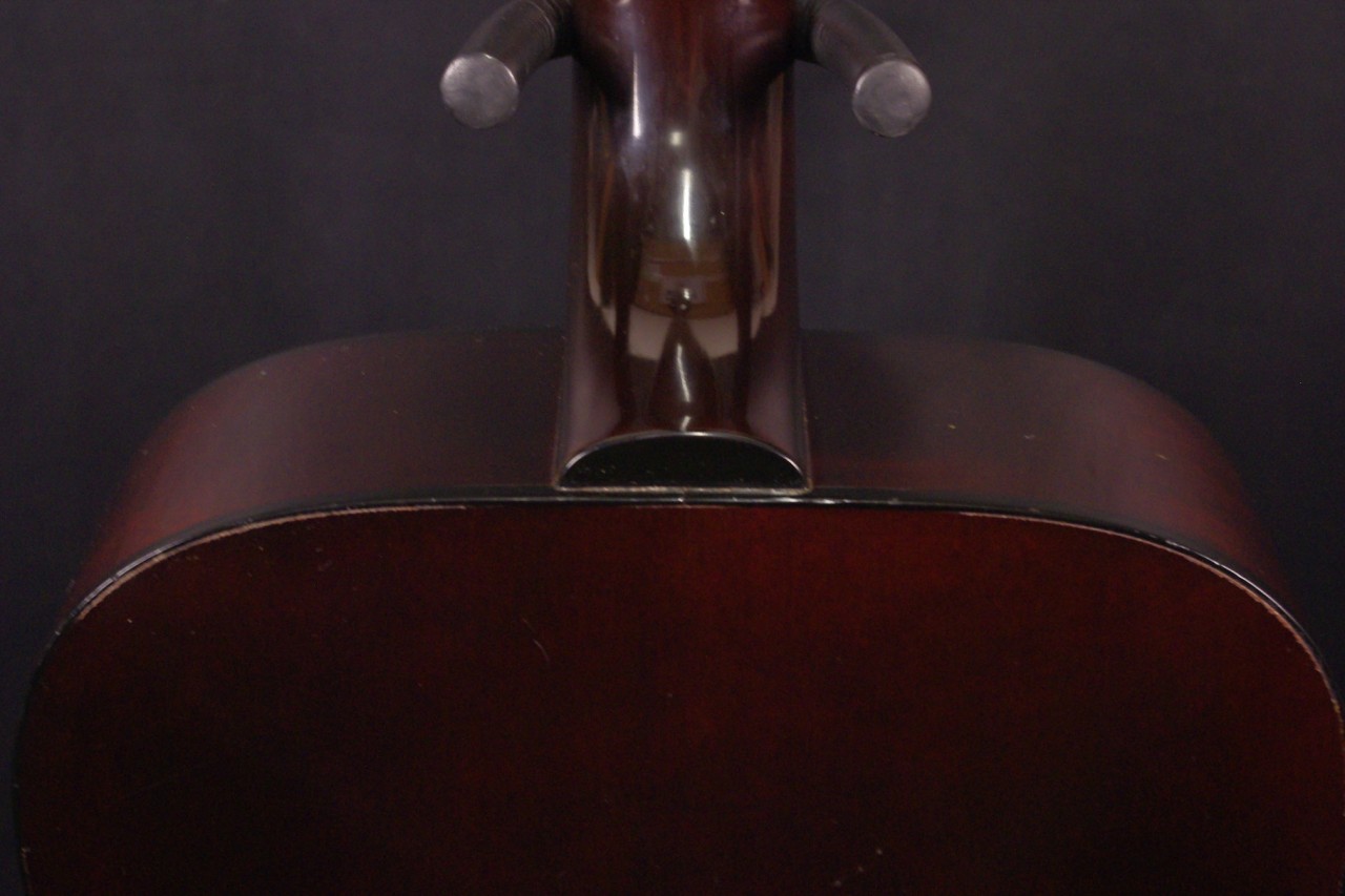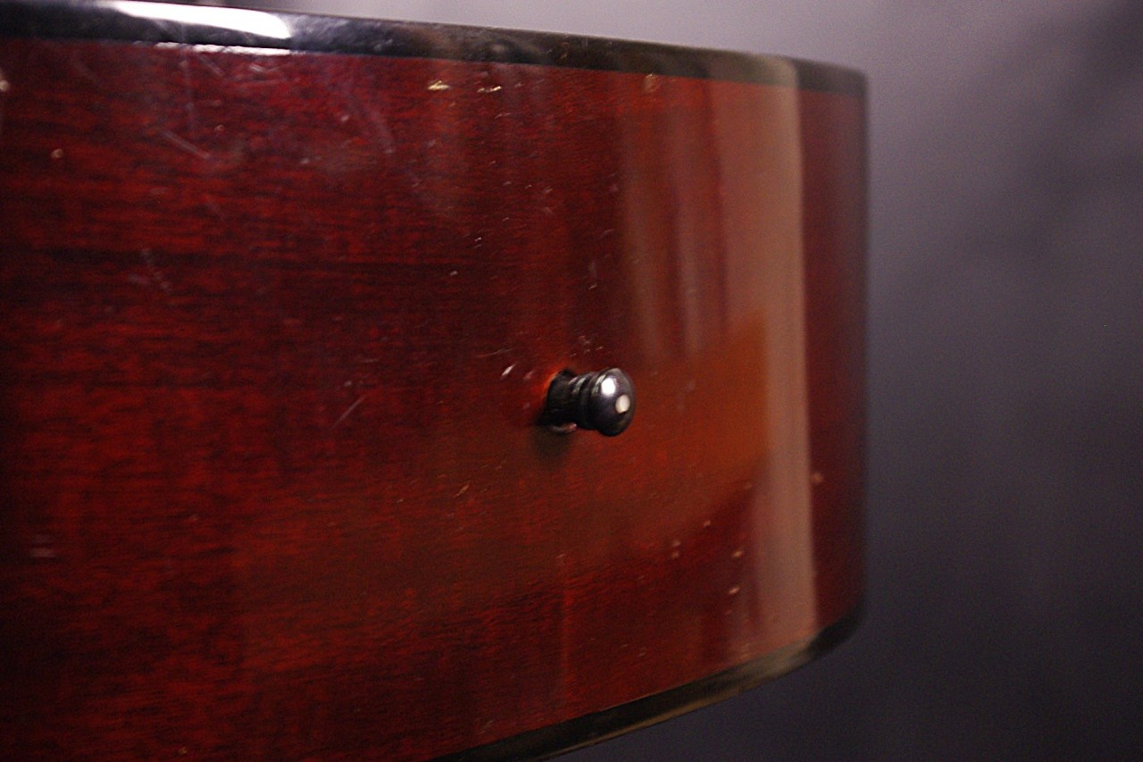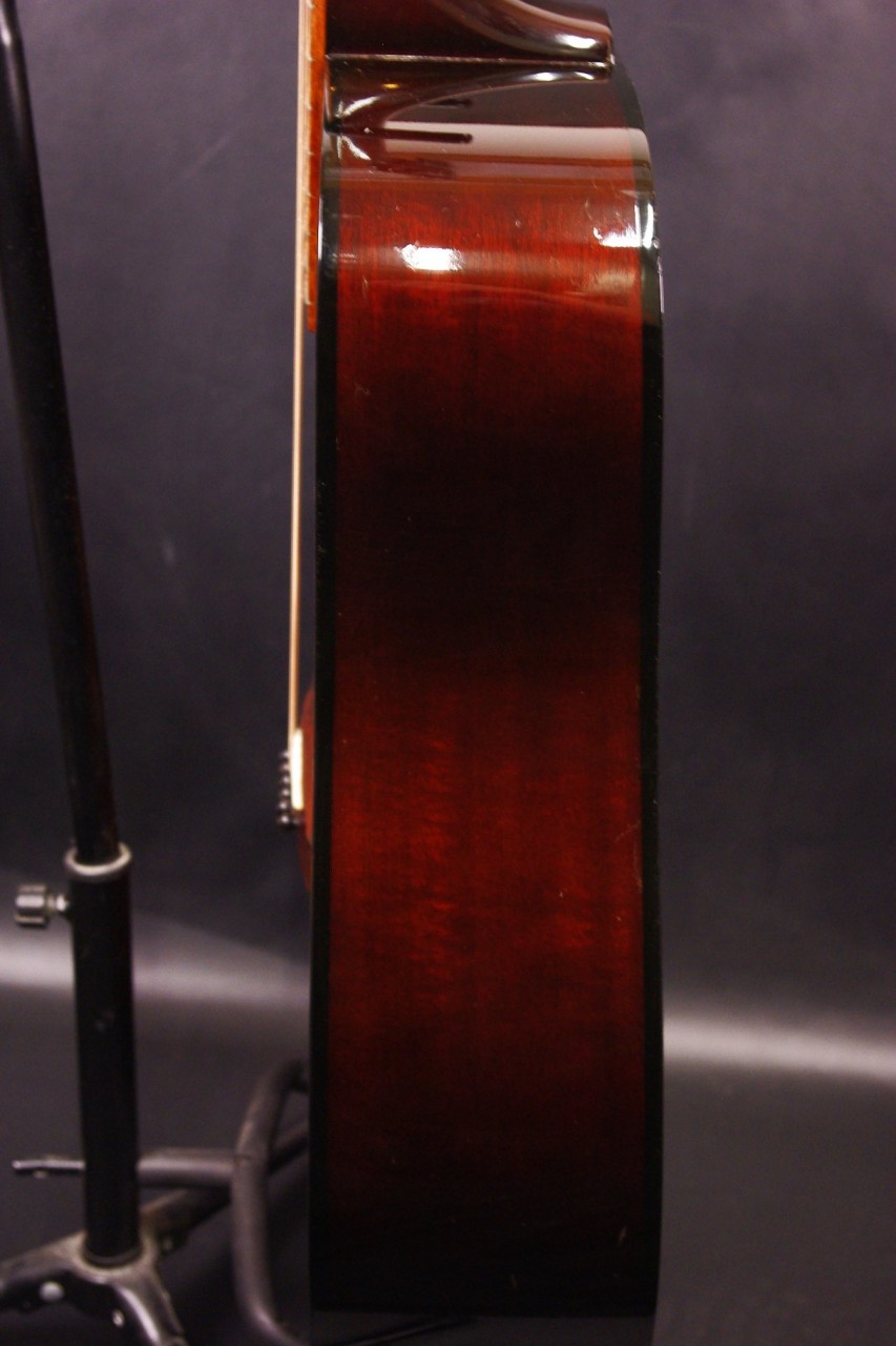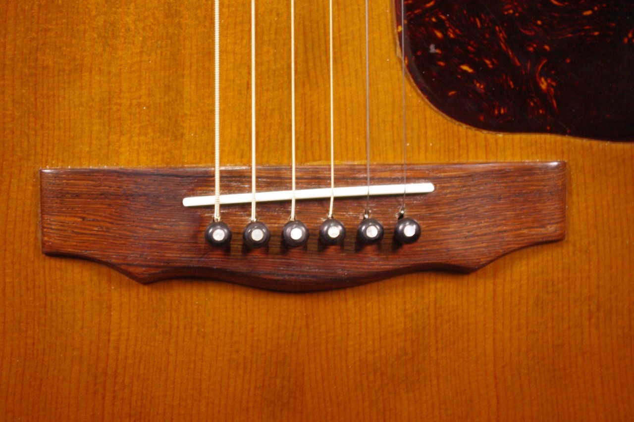 1980年代のギルド D-35が珍しいブラウンサンバーストフィニッシュで入荷しました!!トップはスプルース、サイドバックにはマホガニー、指板とブリッジにはローズウッドを採用したドレッドノートタイプです!ボディ内部のスタンプから1981年製で全体的に傷がありますがメンテナンスの行き届いた個体でおすすめです!ヘッドの耳貼りに沿って線が出ていますが表面上で演奏上支障ございません。ペグ、べっ甲柄ピックガード、ブリッジはオリジナルで残っていました。ネックヒールへのストラップピン加工、ピックアップ加工はございません。ナット幅は約42.5mmの太すぎないしっかりとしたネックグリップでアングルも適正でトラスロッドの動作も問題なく機能しています。フレットの高さもあり今後もまだまだお使いいただけます。弦高は12フレット6弦側で約2.1mm、1弦側で約1.6mmの高さでハイポジションまで押さえやすく調整しています。ブリッジもオリジナルの高さでサドル残もあり微調整にもお応えいたします。40年以上経過しており乾いた味わい深いサウンドで仕上がっています!!ギルドらしいどっしりとした粘り強さが堪りません!マーティン、ギブソンと比べるとプライスも魅力!!是非この機会にどうぞ!ハードケース付。
