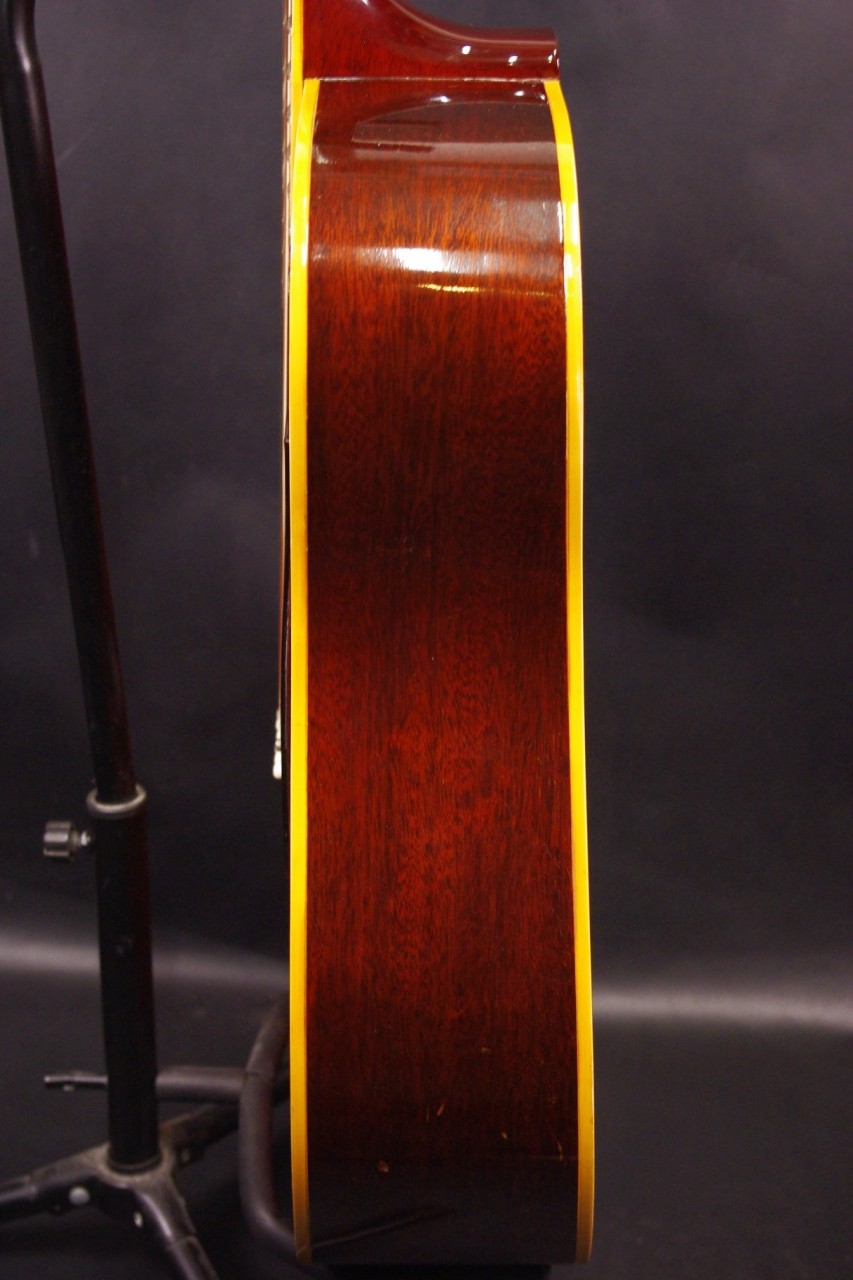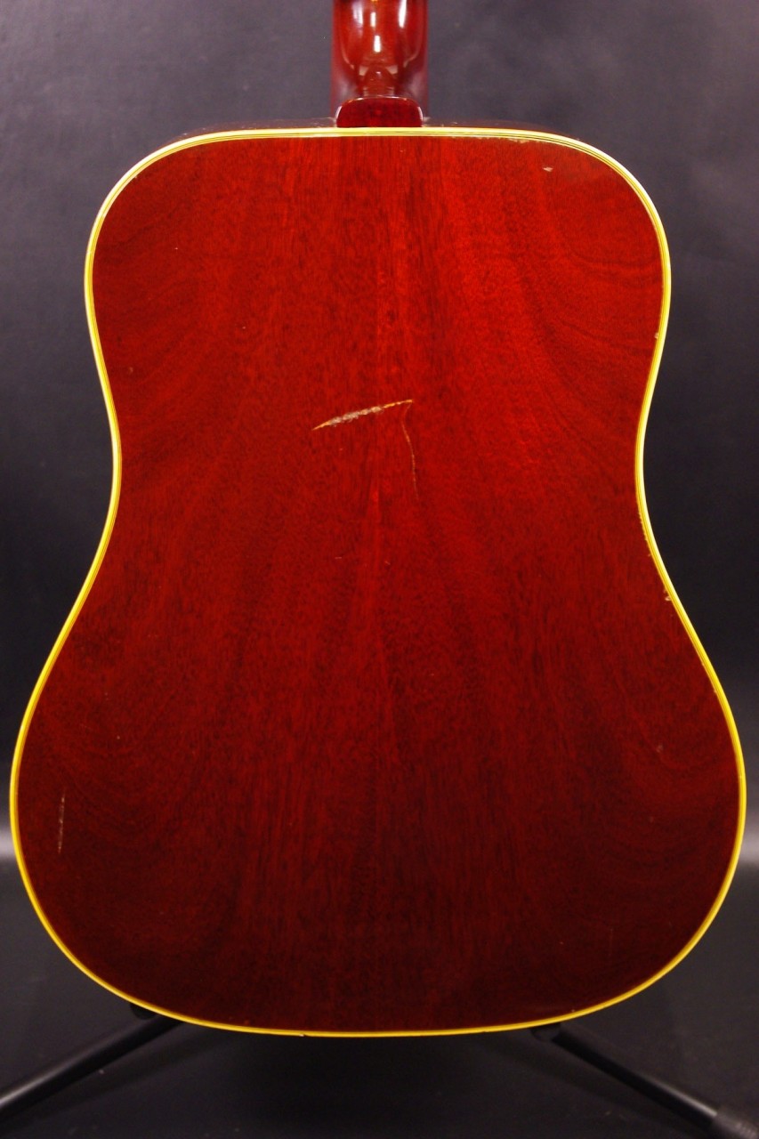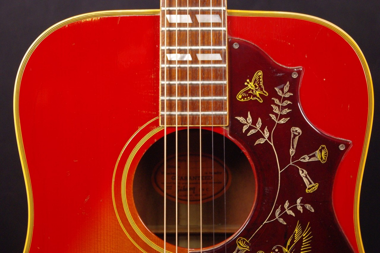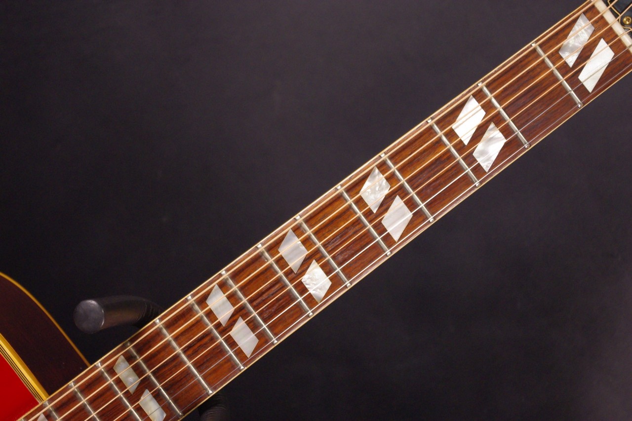 1960年代後期のギブソン上位機種 HummingBirdがチェリーサンバーストフィニッシュで入荷しました!!トップはスプルース、サイドバックにはマホガニー、指板とブリッジにはハカランダを採用、シリアルナンバースペックから1969年が有力でこの時期ナローネックが多く存在しますがナット幅約42mmの1ピースマホガニーを使っているのが最大の特徴です。60年代初期スペックをがお好みの方にとっては嬉しい1本ですよ!!ペグはギブソンデラックスに交換されています。裏のカバーが浮いている箇所がありますが今のところ支障ございません。ネジ止めされたピックガード、ベリーブリッジはオリジナルで残っていました。ネックヒールへは以前にストラップピンが打たれていましたが綺麗に穴埋めされています。ピックアップの取り付け加工はございません。ネックのアングルも理想的でトラスロッドは硬さを感じるところまで締めて調整していますが問題なく効いています。フレットはオリジナルでローポジションに多少の減りは出ていますがまだまだ使えます。弦高もハイポジションまでストレスなく押さえられます。セラミックサドルが搭載されておりお好みに合せた微調整も可能です。J-45と比べるとロングスケールの影響もありよりキレの良いダイナミックなサウンドで特にストローク中心で演奏される方に一押しです!!レギュラーネックのレアな1本!!是非この機会にお試しください!汎用ハードケース付