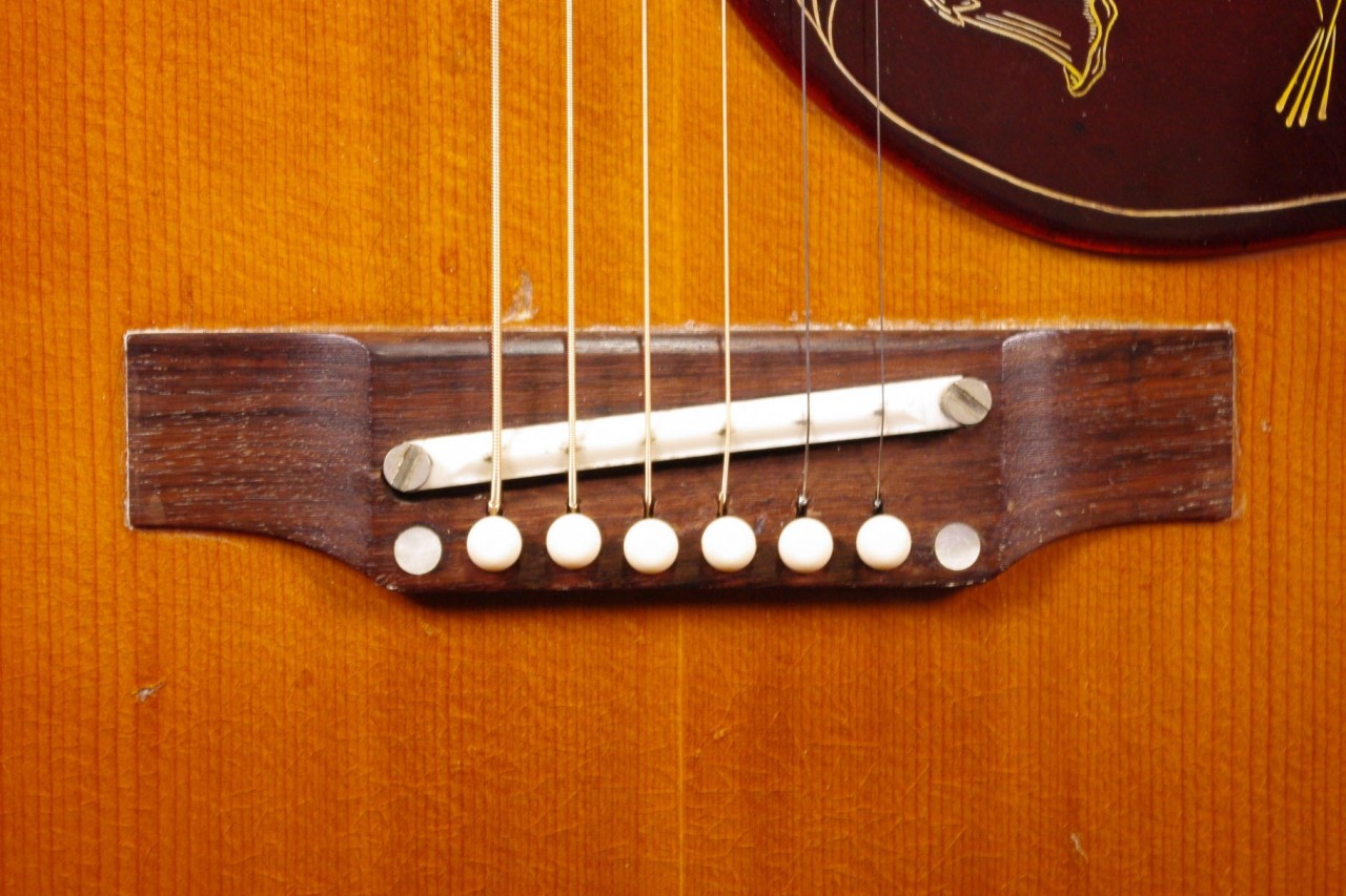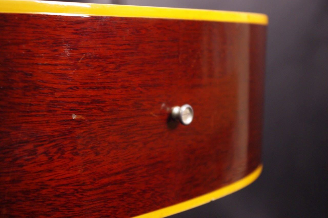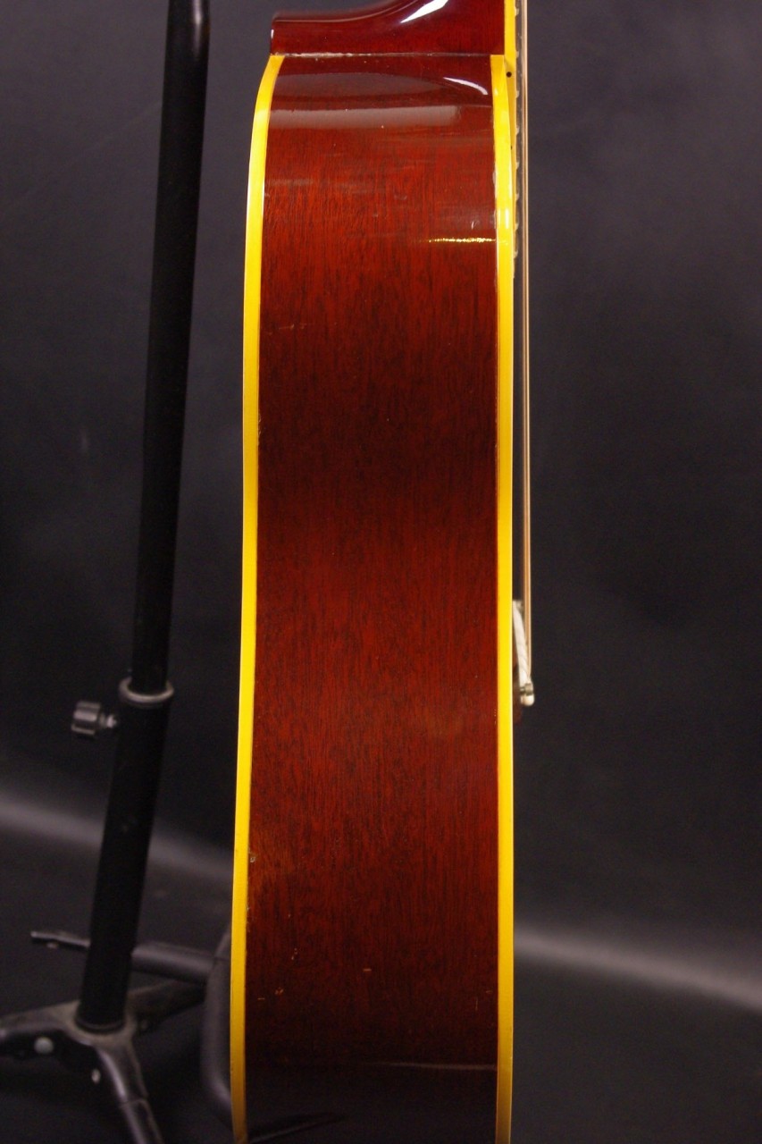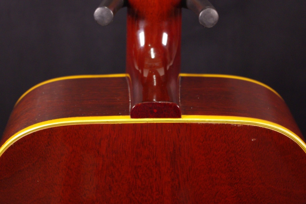1960年代後期のギブソン上位機種 HummingBirdがチェリーサンバーストフィニッシュで入荷しました!!トップはスプルース、サイドバックにはマホガニー、指板とブリッジにはハカランダを採用、シリアルナンバースペックから1969年が有力でこの時期ナローネックが多く存在しますがナット幅約42mmの1ピースマホガニーを使っているのが最大の特徴です。60年代初期スペックをがお好みの方にとっては嬉しい1本ですよ!!ペグはギブソンデラックスに交換されています。裏のカバーが浮いている箇所がありますが今のところ支障ございません。ネジ止めされたピックガード、ベリーブリッジはオリジナルで残っていました。ネックヒールへは以前にストラップピンが打たれていましたが綺麗に穴埋めされています。ピックアップの取り付け加工はございません。ネックのアングルも理想的でトラスロッドは硬さを感じるところまで締めて調整していますが問題なく効いています。フレットはオリジナルでローポジションに多少の減りは出ていますがまだまだ使えます。弦高もハイポジションまでストレスなく押さえられます。セラミックサドルが搭載されておりお好みに合せた微調整も可能です。J-45と比べるとロングスケールの影響もありよりキレの良いダイナミックなサウンドで特にストローク中心で演奏される方に一押しです!!レギュラーネックのレアな1本!!是非この機会にお試しください!汎用ハードケース付
