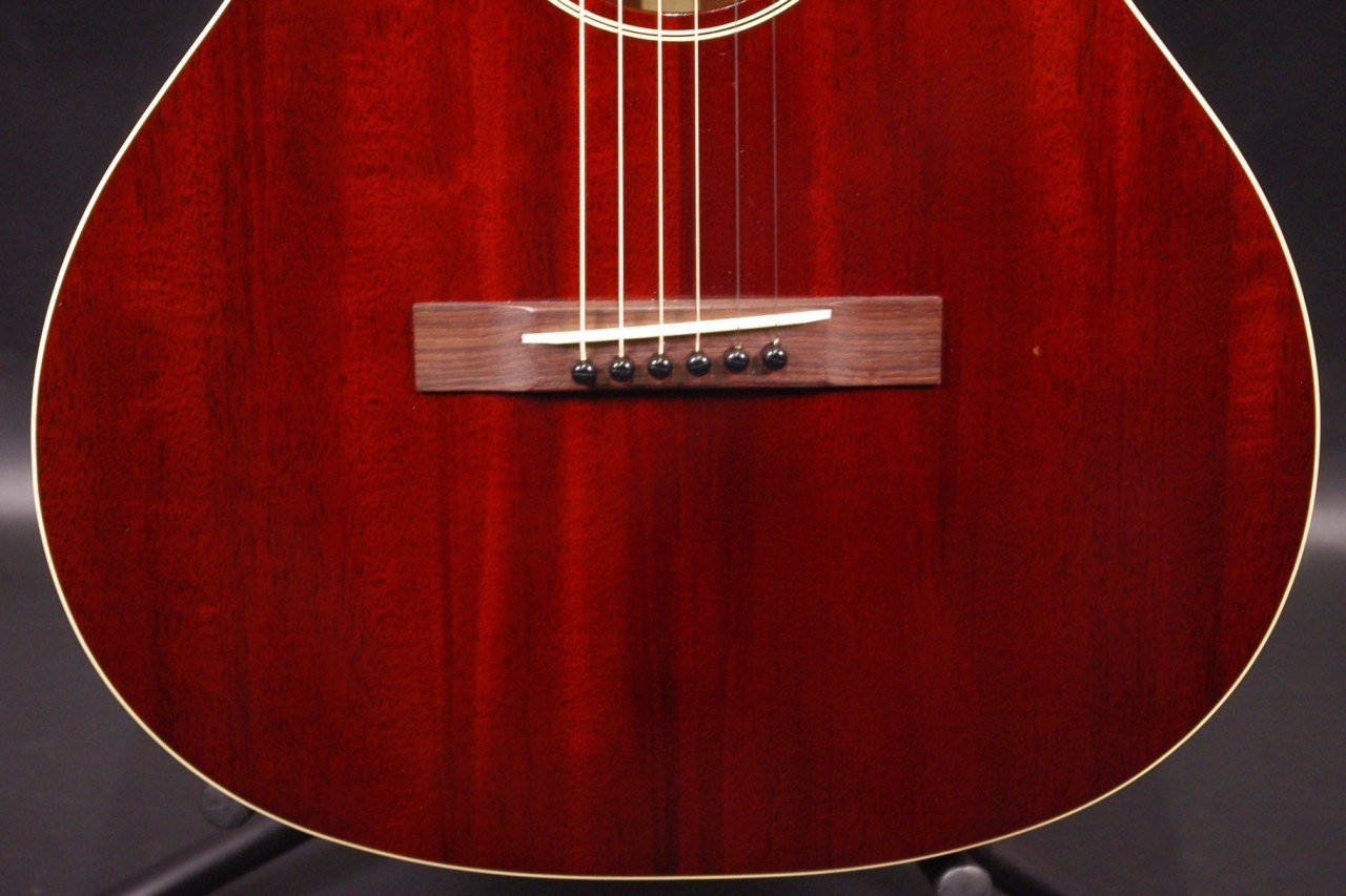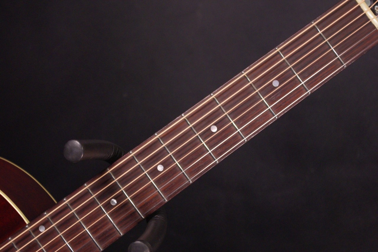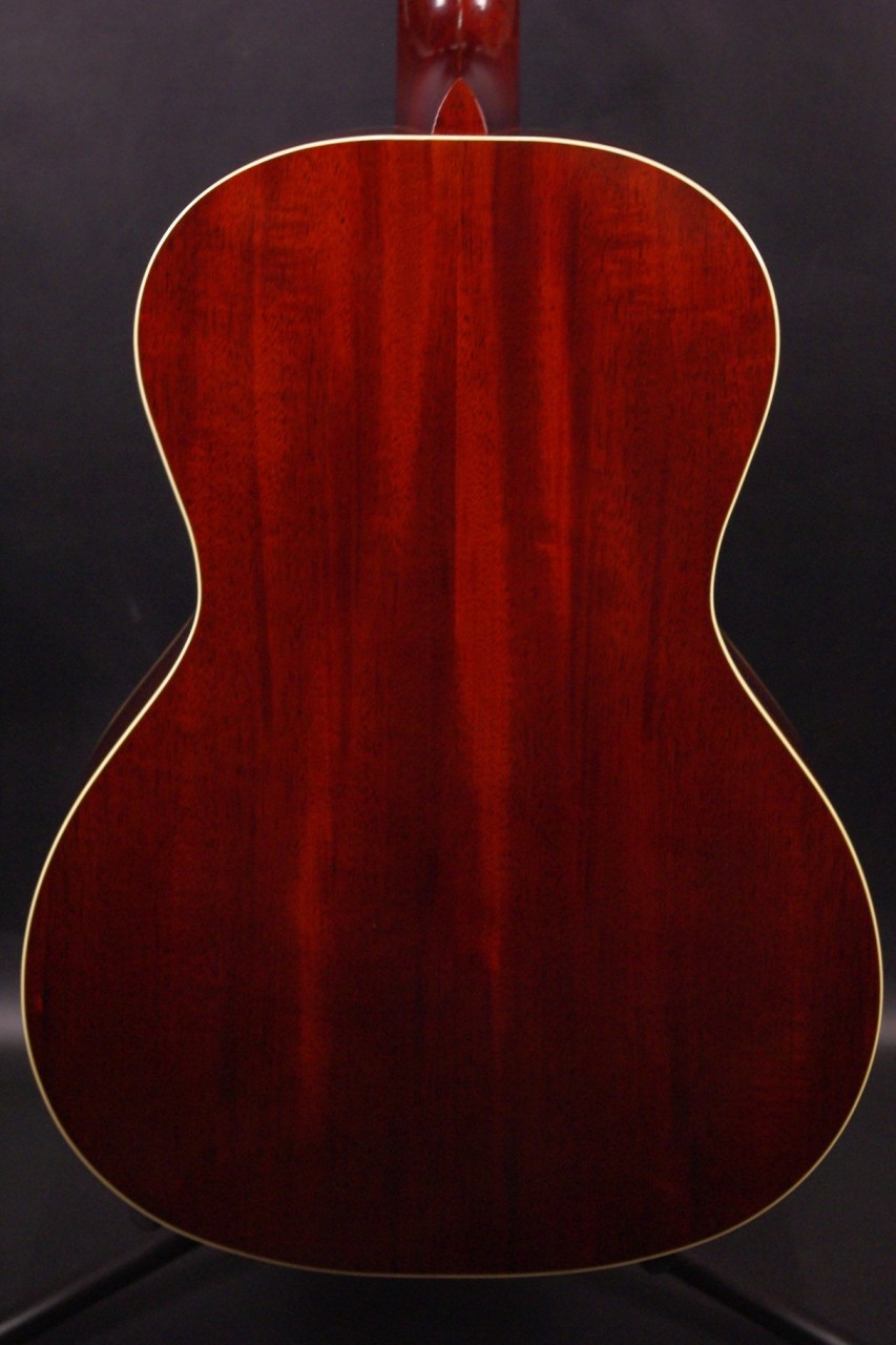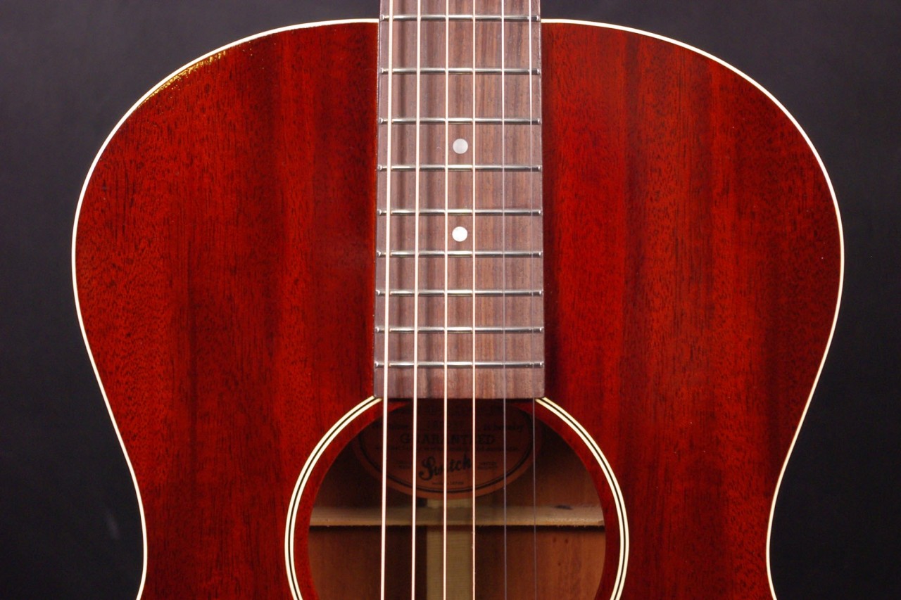 1930年頃のギブソンL-0スタイル!SWITCH SL-0 Irene HMが入荷しました!!トップ、サイドバックにホンジュラスマホガニーオール単板を採用、12フレットでジョイントされた抱えやすいコンパクトなボディで手軽にお楽しみいただけるのが魅力です!!オープンバック3連ペグ、レクタンギュラーブリッジもオリジナルでスキャロップドXブレーシング、ロングサドルなど作りも拘っており音も優れています!!2018年製が有力で所々に打ち傷がありますが全体的に綺麗でルックスもシブいですよ!ネックヒールへのストラップピン加工やピックアップなど特別な加工もございません。ナット幅は約43mmのやや薄めのソフトVシェイプになります。ネックのアングルも理想的でトラスロッドの動作も問題なく余裕があります。フレットの減りも少なく長期で安心いただけます。弦高は12フレット6弦側で約2.8mm、1弦側で約1.8mmの高さで押さえやすく調整しています。サドル残もあり将来の微調整も十分可能です。塗装も薄く重量も軽くボディ全体で響きます!マホガニーらしい温かく柔らかさもあり軽いタッチで癒されます!!是非この機会にお試しください!おすすめ!汎用ハードケース付き