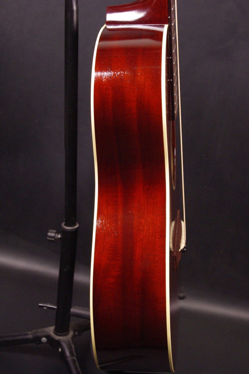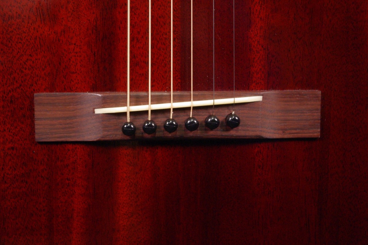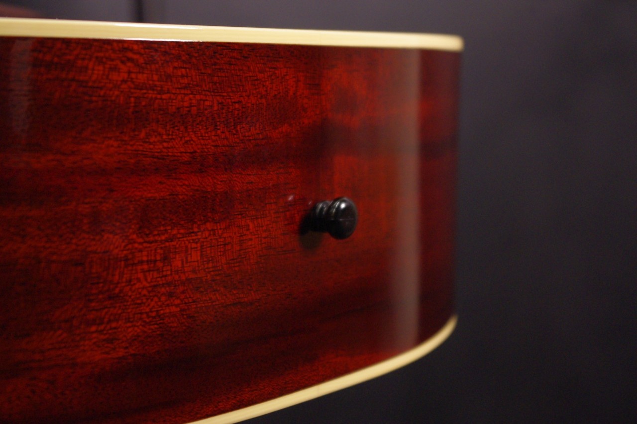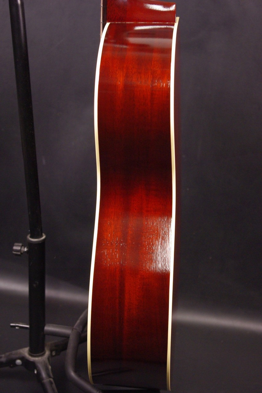 1930年頃のギブソンL-0スタイル!SWITCH SL-0 Irene HMが入荷しました!!トップ、サイドバックにホンジュラスマホガニーオール単板を採用、12フレットでジョイントされた抱えやすいコンパクトなボディで手軽にお楽しみいただけるのが魅力です!!オープンバック3連ペグ、レクタンギュラーブリッジもオリジナルでスキャロップドXブレーシング、ロングサドルなど作りも拘っており音も優れています!!2018年製が有力で所々に打ち傷がありますが全体的に綺麗でルックスもシブいですよ!ネックヒールへのストラップピン加工やピックアップなど特別な加工もございません。ナット幅は約43mmのやや薄めのソフトVシェイプになります。ネックのアングルも理想的でトラスロッドの動作も問題なく余裕があります。フレットの減りも少なく長期で安心いただけます。弦高は12フレット6弦側で約2.8mm、1弦側で約1.8mmの高さで押さえやすく調整しています。サドル残もあり将来の微調整も十分可能です。塗装も薄く重量も軽くボディ全体で響きます!マホガニーらしい温かく柔らかさもあり軽いタッチで癒されます!!是非この機会にお試しください!おすすめ!汎用ハードケース付き
