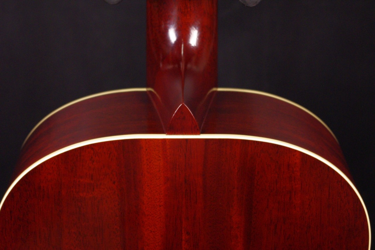 トップ ホンジュラスマホガニー単板、サイドバック ホンジュラスマホガニー単板、指板・ブリッジ ローズウッド、ネック マホガニー、オリジナルオープンバック3連ペグ、12フレットジョイント、スキャロップドXブレーシング、ロングサドル、