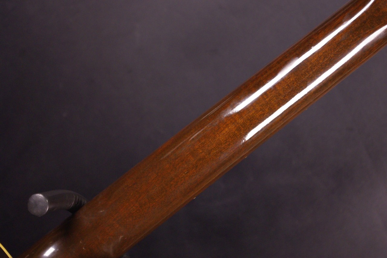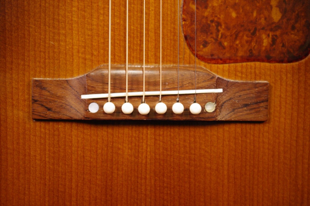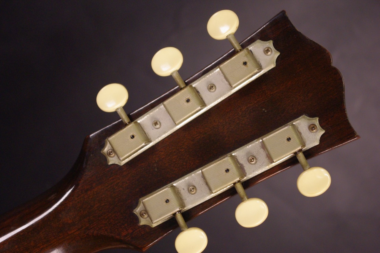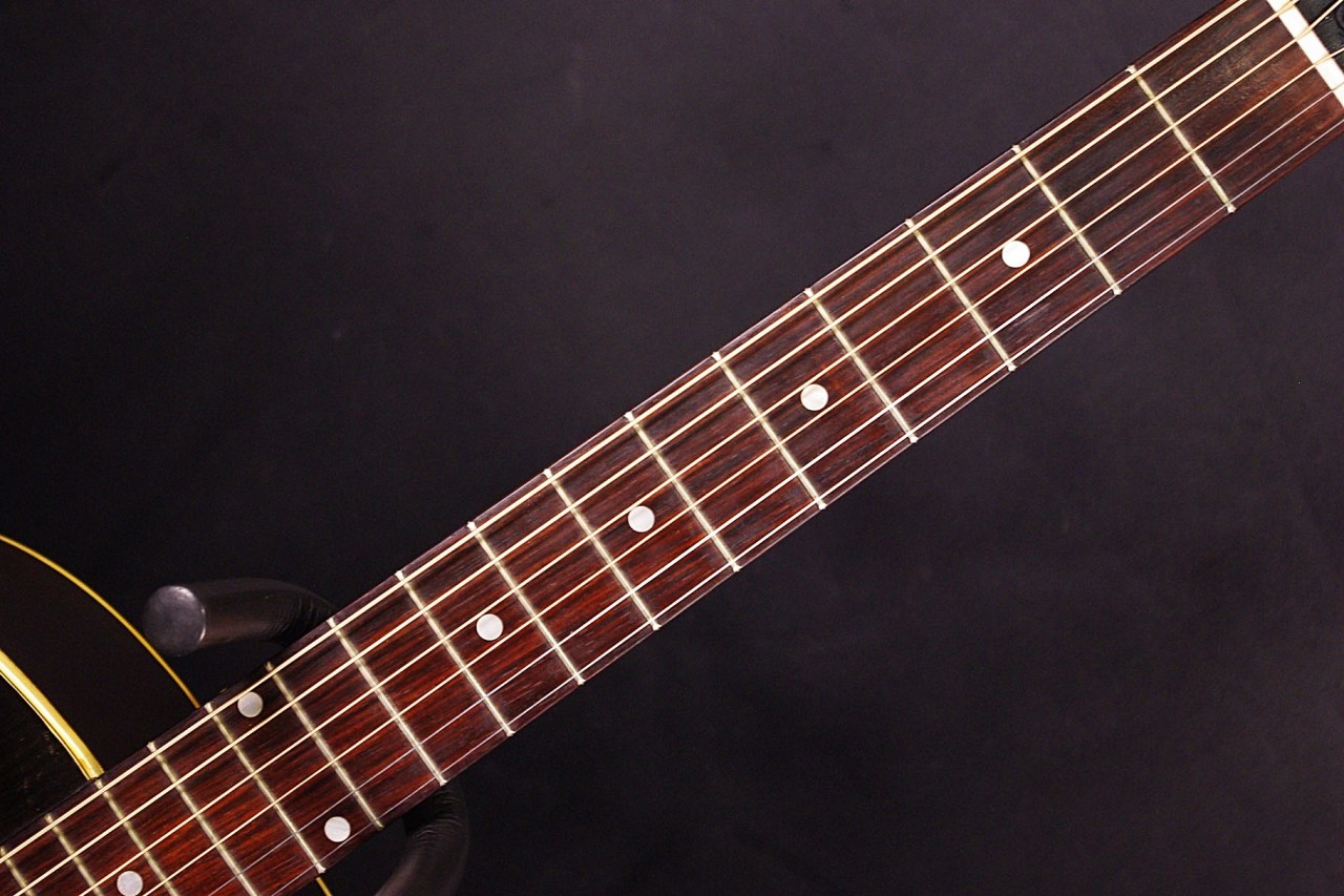 1950年代初期のスモールピックガード、ロングサドル期のJ-45 ビンテージが極上コンディションで入荷しました!トップはスプルース、サイドバックにはマホガニー、指板とブリッジにはハカランダ、ロングサドルを採用、スキャロップドXブレーシング、サイドには割れ止めの入ったオール単板なのもこの時期の特徴でサウンドも優れています!!シリアルナンバーから1952年製でペグはクルーソン製の3連に交換されています。オリジナルと同じ形状のため違和感はございません。ピックガード、ブリッジなど主なパーツはオリジナルで残っています。トップトバックにセンターシームが入っていますが目立たない程度でしっかりと補修されていますので安心です。ピックガードに沿ってクラック補修、サウンドホールには弾き傷があります。全体的に傷、ウェザーチェックはありますが保管状態も素晴らしく綺麗でビンテージの雰囲気も最高でしょう!!調整もしっかりと行き届いていますので演奏性、サウンドも優れています。ネックヒールへはストラップピンが打っています。ピックアップの取り付けはございませんがエンドピンは交換されています。ナット幅は約42.5mm位のやや太めの50年代グリップです。ネックのアングルも理想的でトラスロッドの動作にも十分な余裕がありました。フレットは多少の減りはありますがまだまだお使いいたいだけます。弦高は12フレット6弦側で約2.2mm、1弦側で約1.5mmの高さで押さえやすく調整しています。ブリッジもオリジナルの高さでサドル残もありますので微調整も可能です。ボディも軽く箱鳴りしており低中音も気持ちよく膨らみます!ストロークではパワフル!反応が素早く枯れたビンテージの鳴りで軽いタッチでバランスよく抜けてくれます!滅多に出てこない年式、コンディションでこの時期のJ-45で探していた方にとってはかなりおすすめです!是非この機会にお試しください!!汎用ハードケース付き!