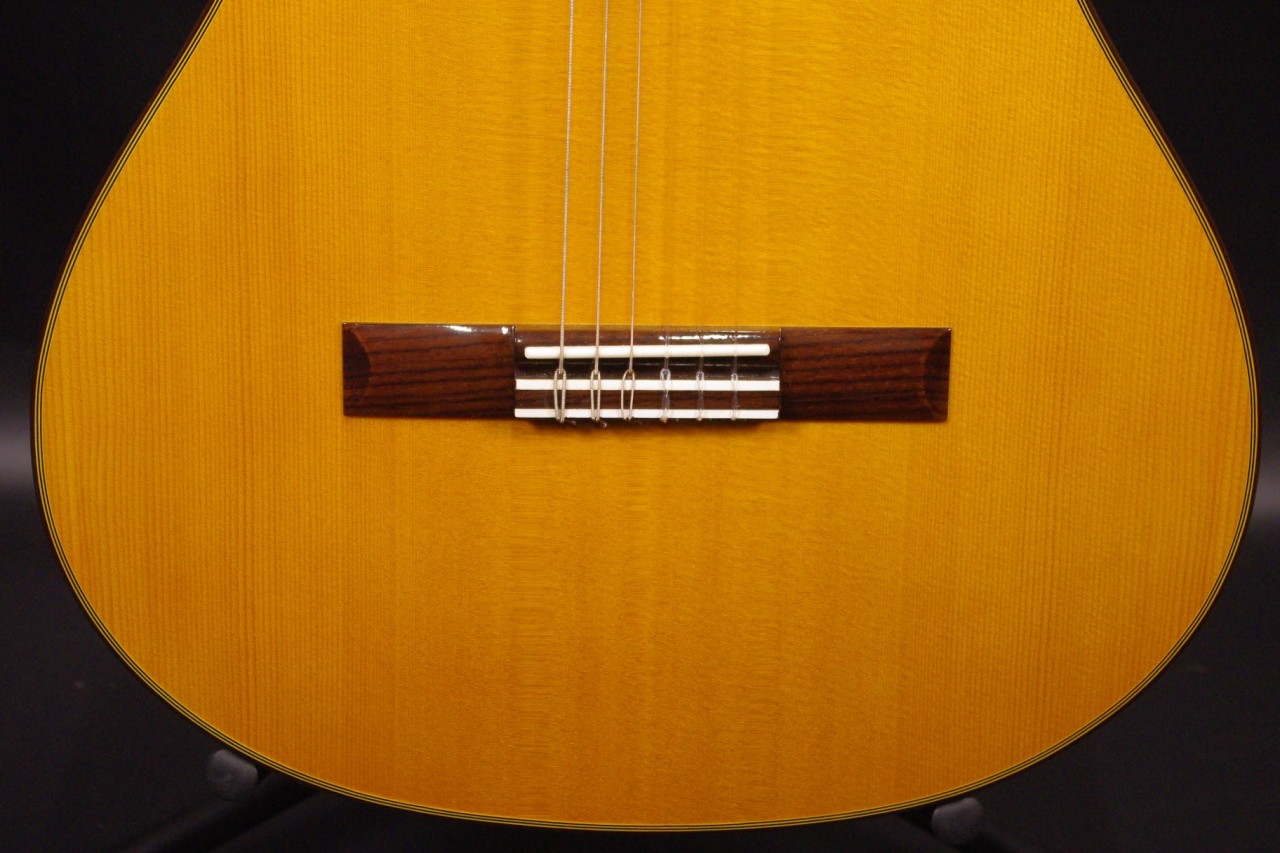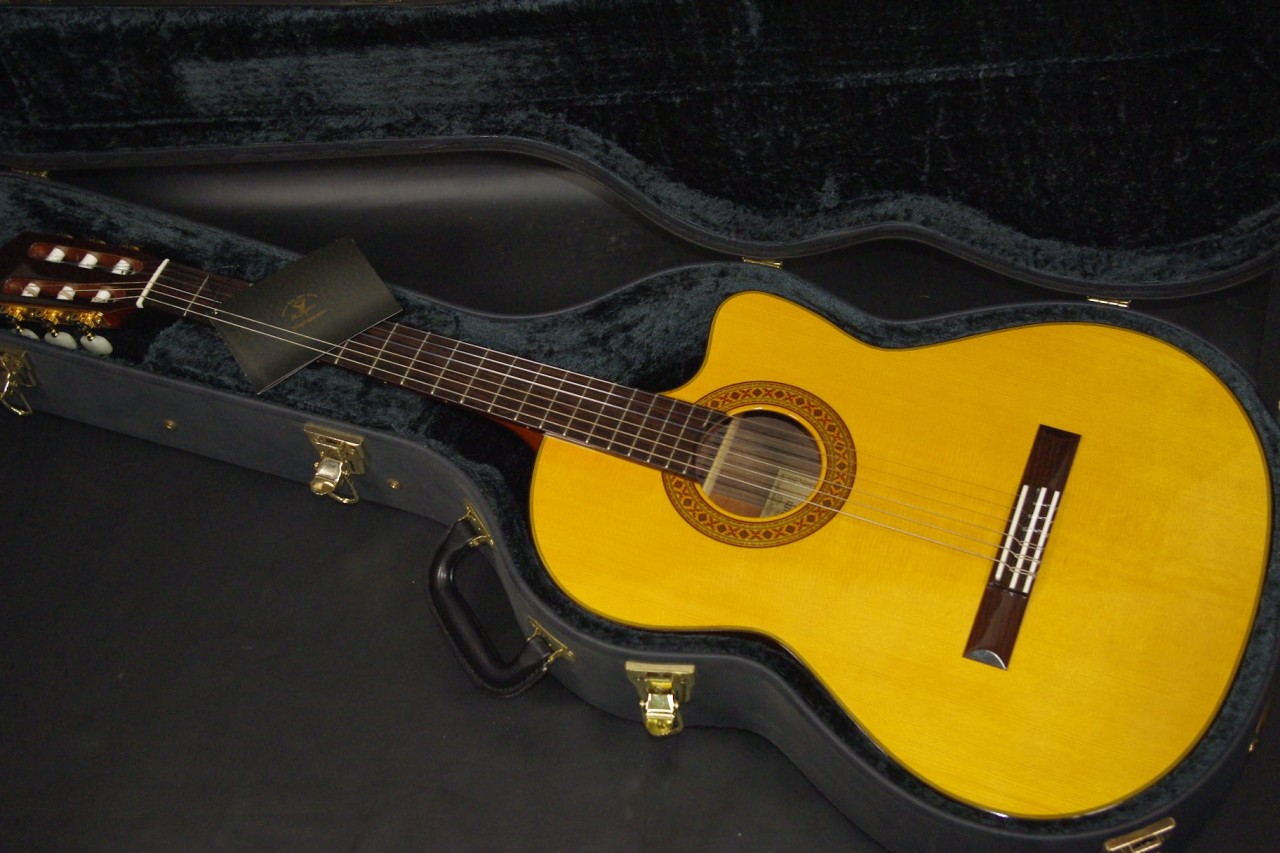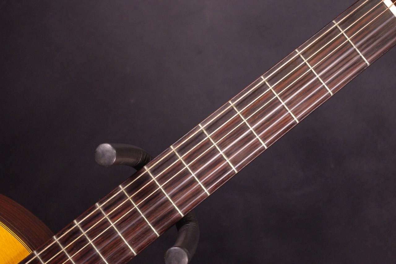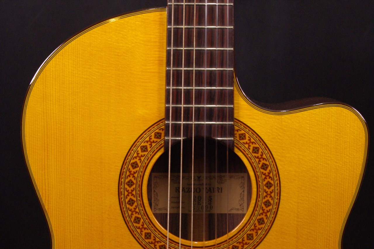 K.YAIRIの人気エレガット CE-2が入荷しました!!トップはスプルース単板、サイドバックにはローズウッド、指板はエボニー、ブリッジはローズウッドを採用、一般的なクラシックギターと比べるとコンパクトなサイズで長時間の演奏も疲れません。ナット幅約42mmのスリムネックなのが最大の特徴で特にアコースティックギターがメインな方にとっては違和感なくお楽しみいただけるでしょう!!カッタウェイ仕様でLRBaggs社のエレメントVTCピックアップも搭載されていますのでライブでも即戦力でお使いいただけます。ボディ内部のラベルから2015年に生産された個体で使用感も少なく全体的に綺麗で演奏性も優れています。ペグ、ブリッジもオリジナルで残っていました!ネックヒールへのストラップピン加工はございません。ネックのアングルも理想的、アジャスタブルロッド仕様のため微調整も可能です。フレットの状態もよく今後も安心いただけます。弦高は12フレット6弦側で約3.2mm、1弦側で約2.6mmの高さで調整しています。サドル残も十分余裕がありますのでお好みに合せた微調整にもお応えいたします。弦長約650mmの薄型ボディの影響からレスポンスのよい歯切れの良いサウンドでピック弾きも応えてくれます!気軽に使えるエレガットで探していた方はお見逃しなく!!是非お試しください!オリジナルハードケース付。