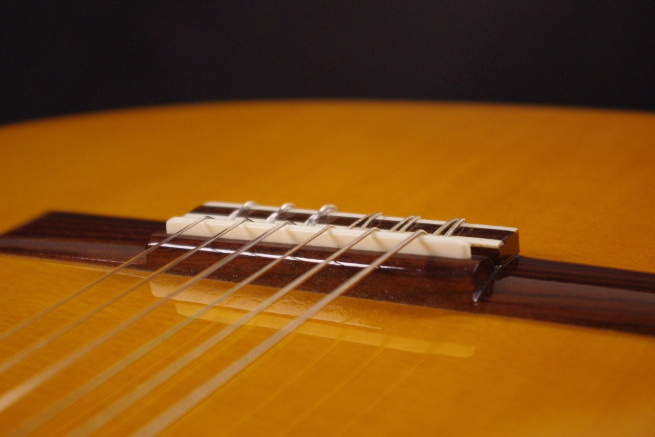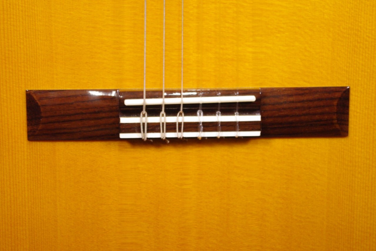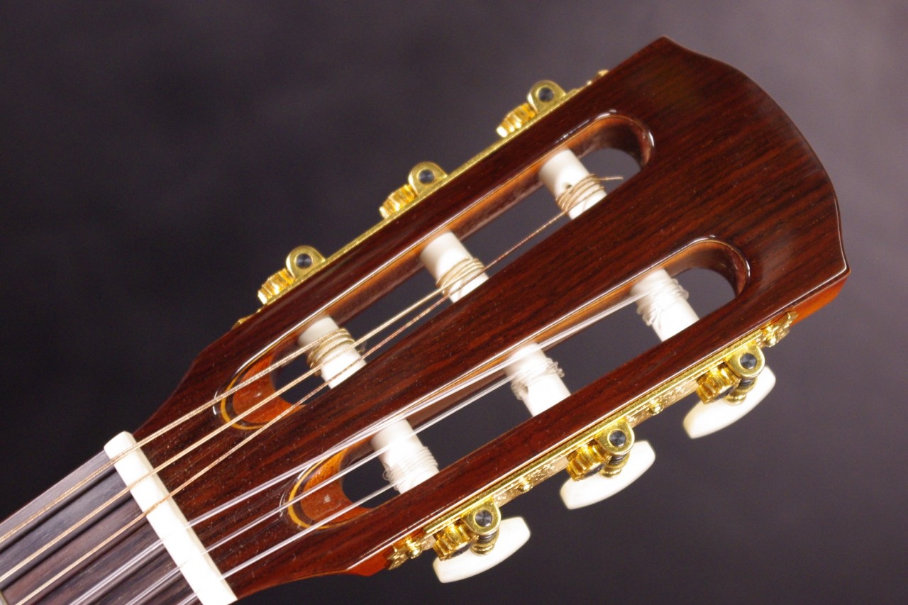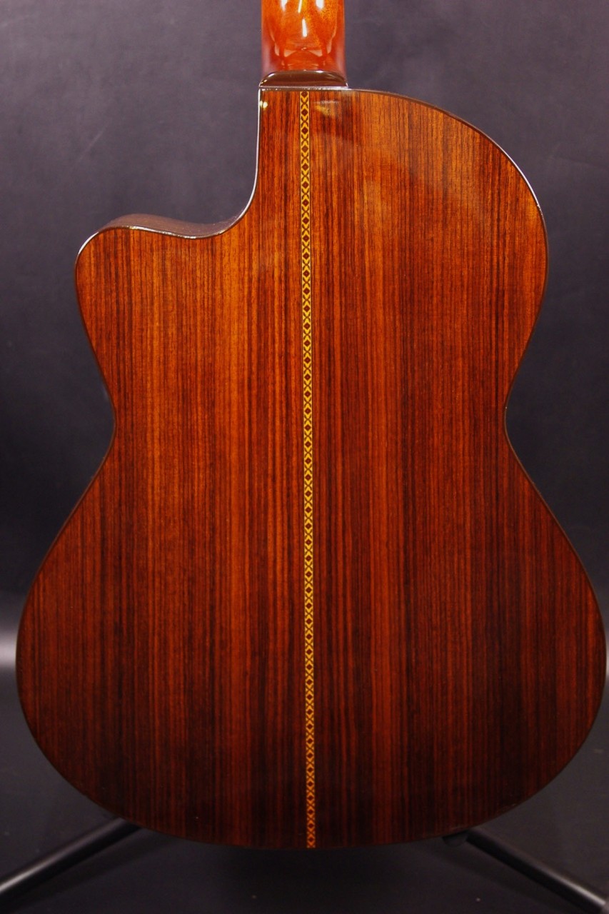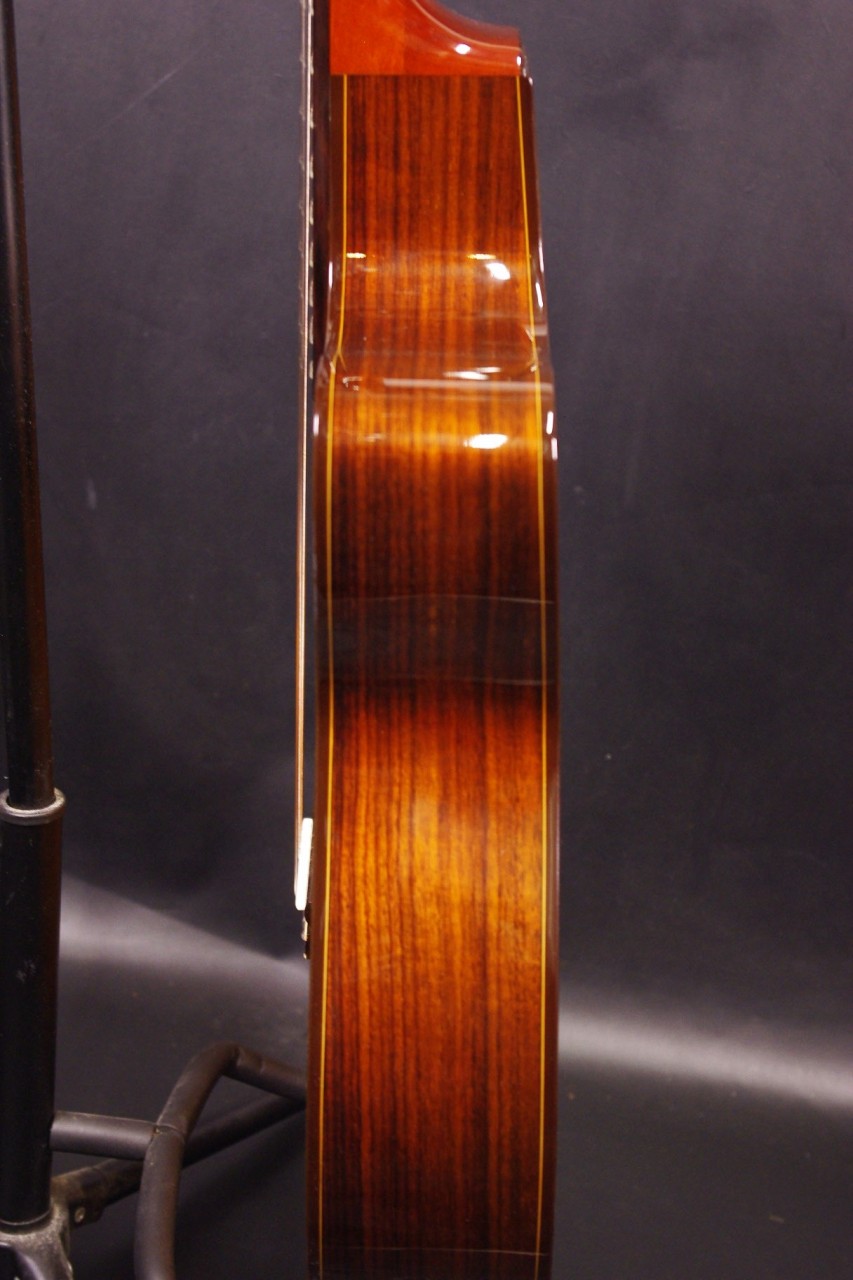 K.YAIRIの人気エレガット CE-2が入荷しました!!トップはスプルース単板、サイドバックにはローズウッド、指板はエボニー、ブリッジはローズウッドを採用、一般的なクラシックギターと比べるとコンパクトなサイズで長時間の演奏も疲れません。ナット幅約42mmのスリムネックなのが最大の特徴で特にアコースティックギターがメインな方にとっては違和感なくお楽しみいただけるでしょう!!カッタウェイ仕様でLRBaggs社のエレメントVTCピックアップも搭載されていますのでライブでも即戦力でお使いいただけます。ボディ内部のラベルから2015年に生産された個体で使用感も少なく全体的に綺麗で演奏性も優れています。ペグ、ブリッジもオリジナルで残っていました!ネックヒールへのストラップピン加工はございません。ネックのアングルも理想的、アジャスタブルロッド仕様のため微調整も可能です。フレットの状態もよく今後も安心いただけます。弦高は12フレット6弦側で約3.2mm、1弦側で約2.6mmの高さで調整しています。サドル残も十分余裕がありますのでお好みに合せた微調整にもお応えいたします。弦長約650mmの薄型ボディの影響からレスポンスのよい歯切れの良いサウンドでピック弾きも応えてくれます!気軽に使えるエレガットで探していた方はお見逃しなく!!是非お試しください!オリジナルハードケース付。