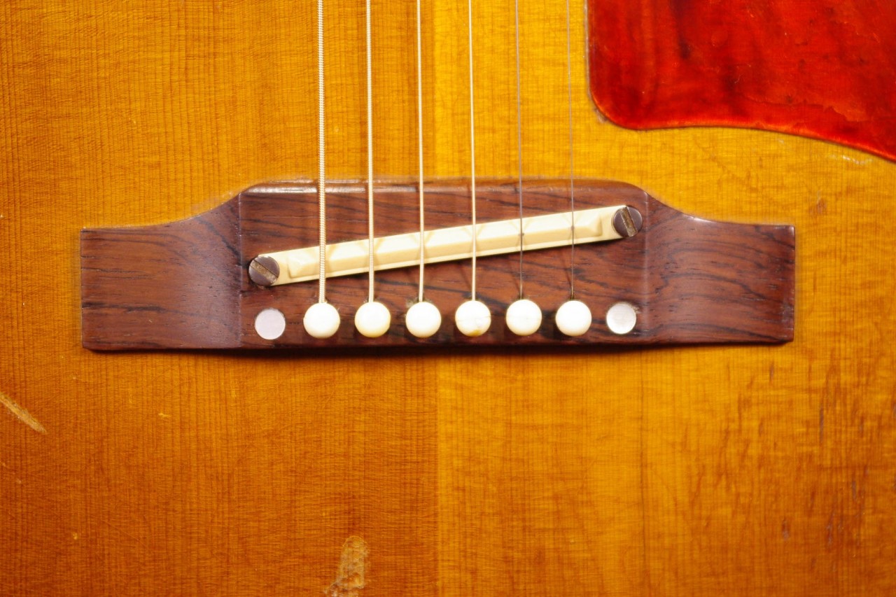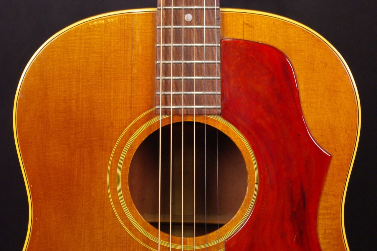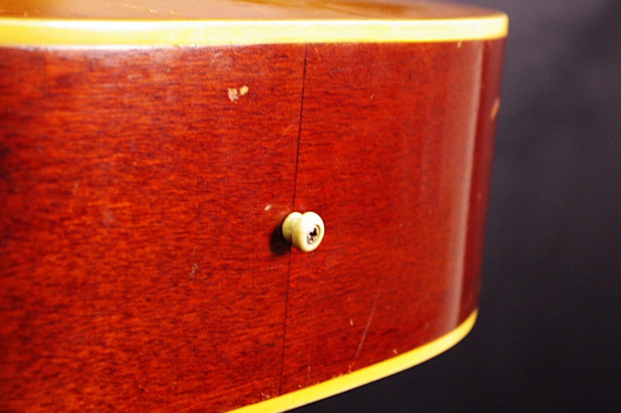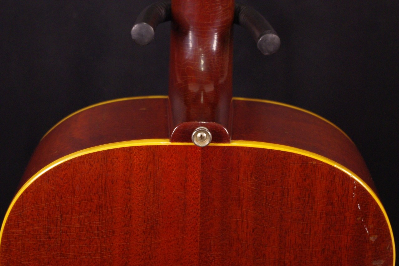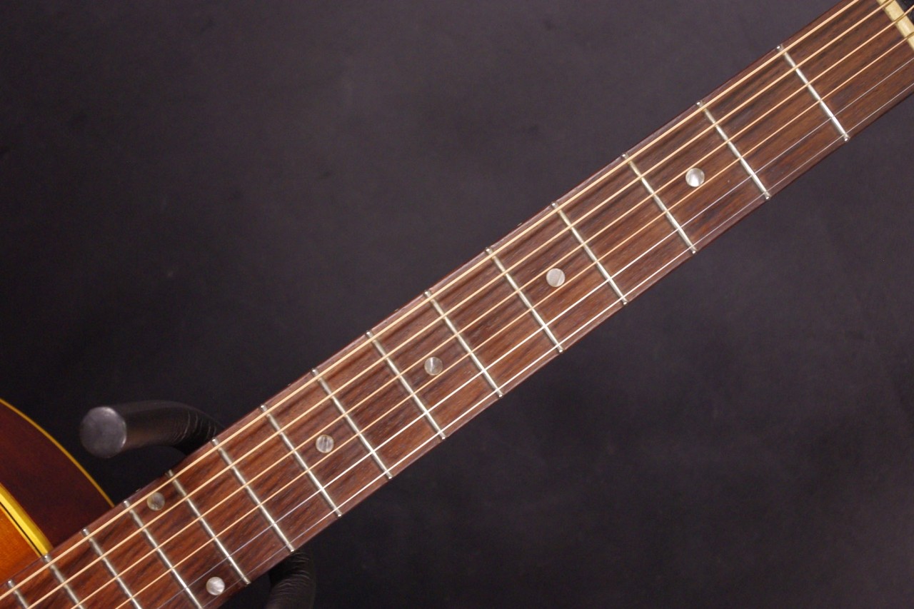 1960年代ナローネックのJ-45が味わい深いチェリーサンバーストで入荷しました!!トップはスプルース、サイドバックにはマホガニー、指板とブリッジにはハカランダを採用、シリアルナンバーから1966年製でペグはこの時期に存在するオープンバックでオリジナルです。ピックガード、ハカランダブリッジもオリジナルで残っています。サドルはタスクに交換されています。トップの指板近くとブリッジから下に2箇所クラック補修箇所がありますが演奏上支障ございません。年代相応の傷、ウェザーチェックがありますが演奏性、サウンドが優れていますので狙い目です!ネックヒールヘはストラップピンが打っています。ピックアップの取り付け加工はございません。ヘッド角度は14度、ナット幅は約40mm近くの細めのグリップが特徴です。ネックのアングルは適正でトラスロッドの動作も問題なく機能しています。フレットは交換済みで高さがあり安心です。弦高もハイポジションまで押さえやすく調整しています。お好みに合せた微調整も可能です。ナローネック、アジャスタブルブリッジの影響からジャキジャキと歯切れの良いサウンドで特にストローク中心で演奏される方におすすめです!是非この機会にお試しください!ハードケース付き