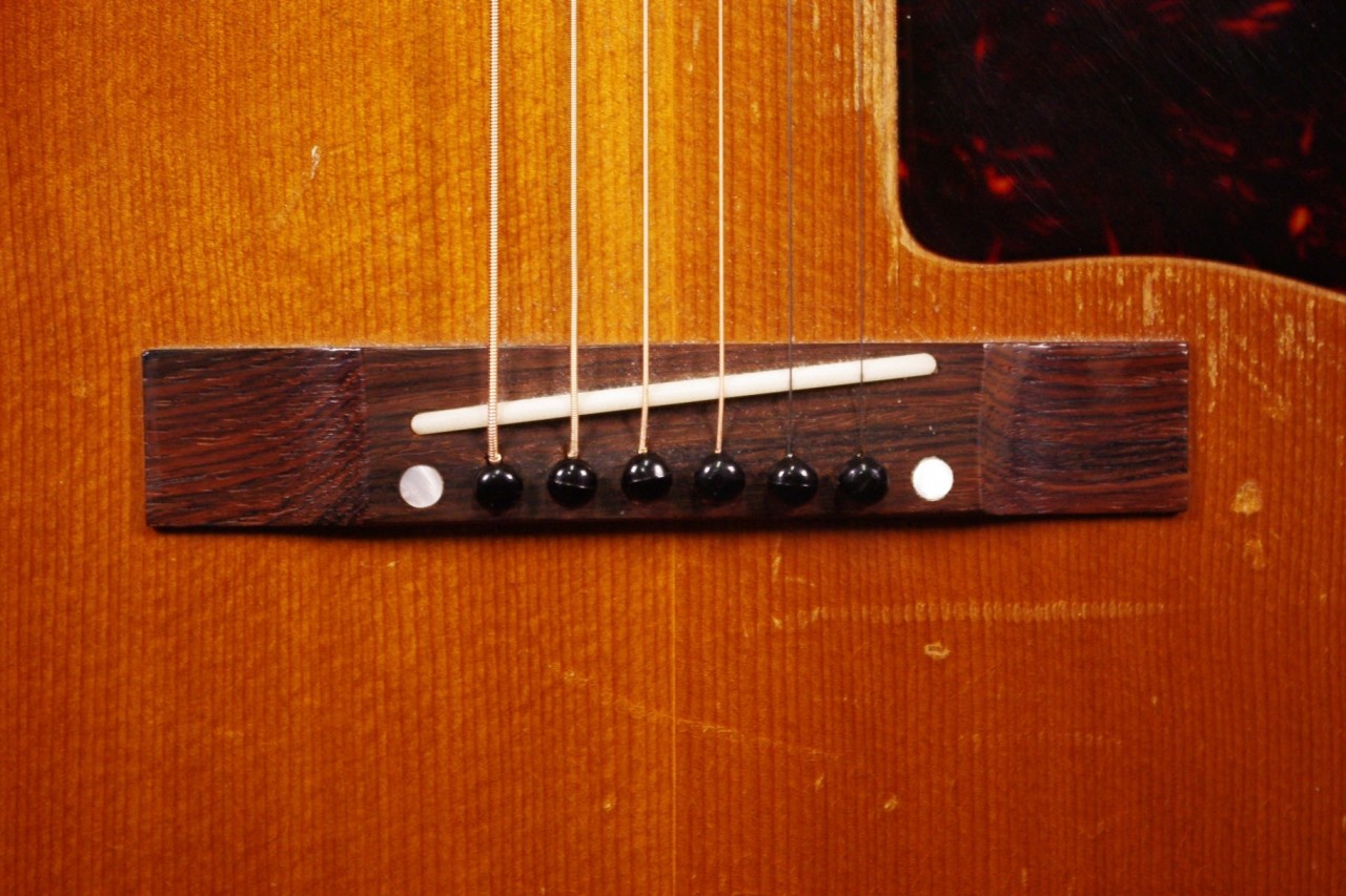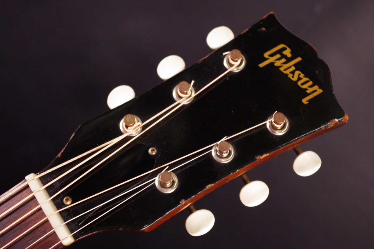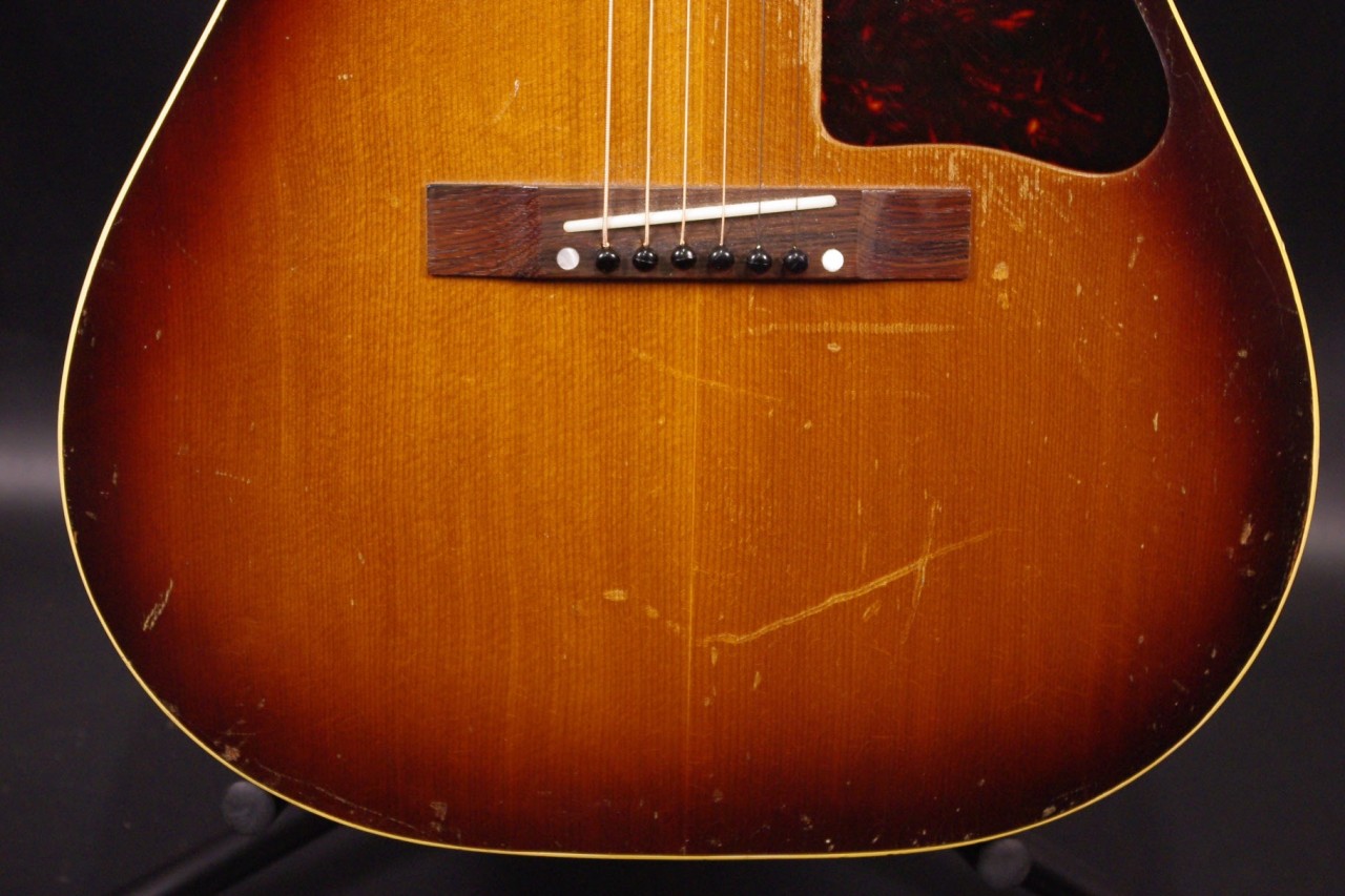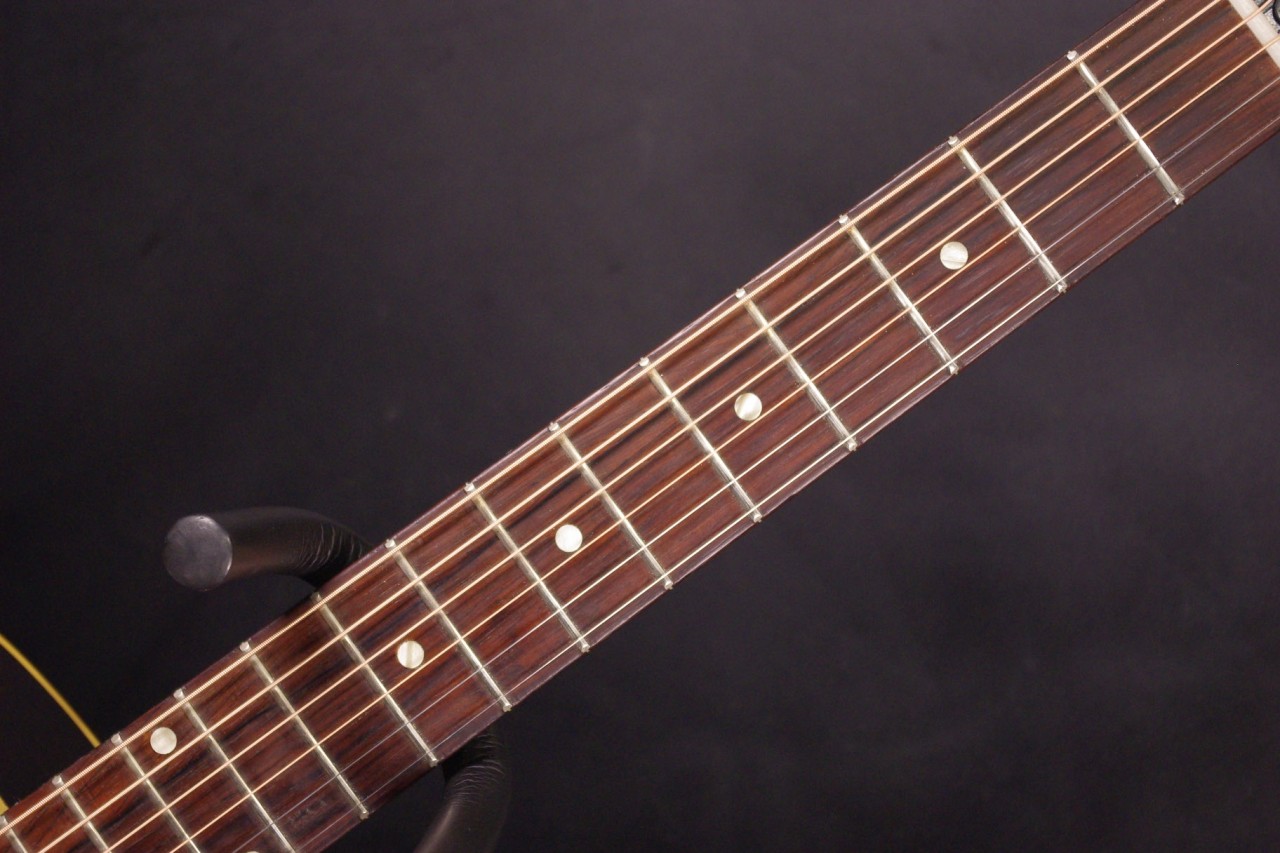 1960年代レクタンギュラーブリッジ期のLG-1が入荷しました!!トップはスプルース、サイドバックにはマホガニー、指板とブリッジにはハカランダを採用、ラダーブレーシングが最大の特徴でLG-2と比べると明るく軽快です!!シリアルナンバーから1961年製でクルーソン製3連ペグ、薄いラージピックガード、ブリッジはオリジナルで残っていました!ピックガードの内側に沿ってクラック補修箇所があります。サウンドホールに弾き傷、全体的に傷は多めにありますが雰囲気がよく演奏性、サウンドが良いので一押しですね!ネックヒールへのストラップピン加工、ピックアップの取り付け加工はございません。ナット幅は約42mm、50年代と比べると若干薄めで握りやすいグリップです。ネックのアングルも理想的でトラスロッドの動作も問題なく機能しています。フレットは多少の減りは出ていますがまだまだ余裕があります。弦高は12フレット6弦側で約2.7mm、1弦側で約1.8mmの高さでハイポジションまで押さえやすく調整しています。サドル側での微調整も可能です。長年弾きこまれており乾いた味わい深いサウンドで仕上がっています!フィンガーピッキング中心で演奏される方におすすめ!チップボードケース
