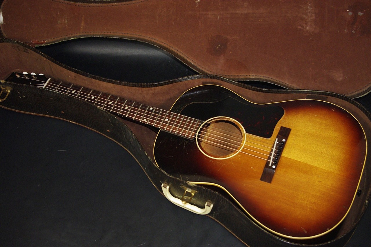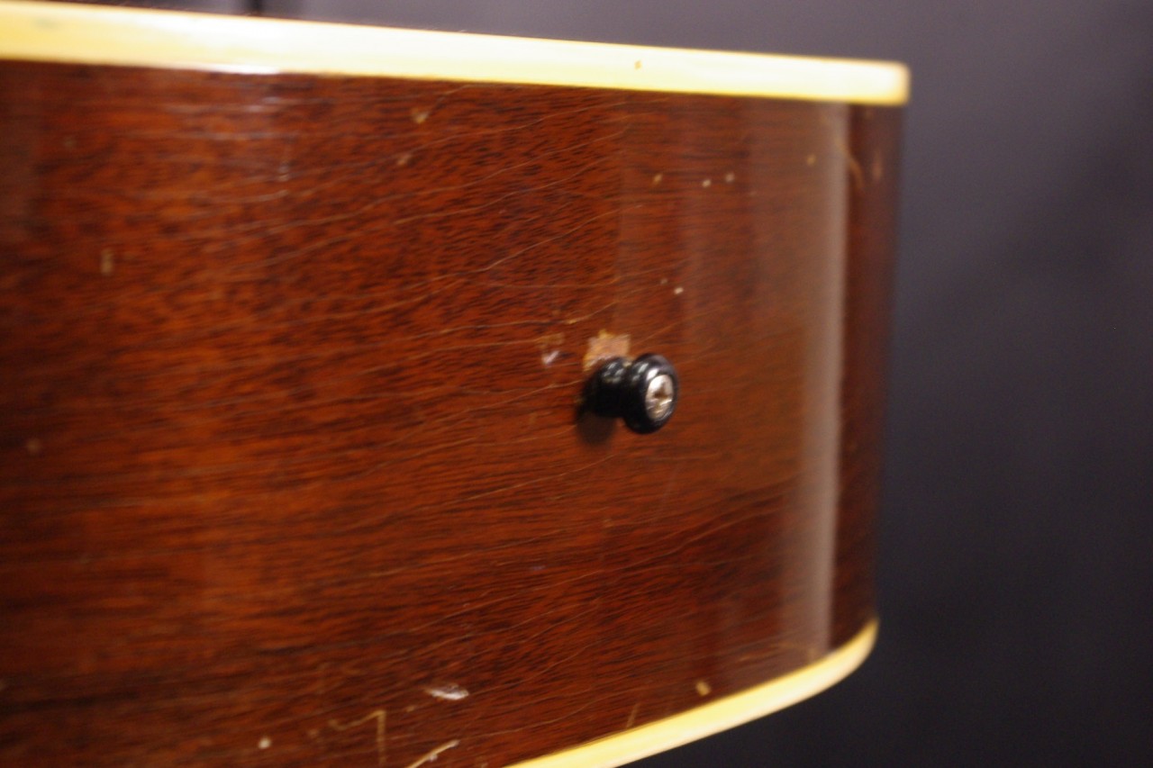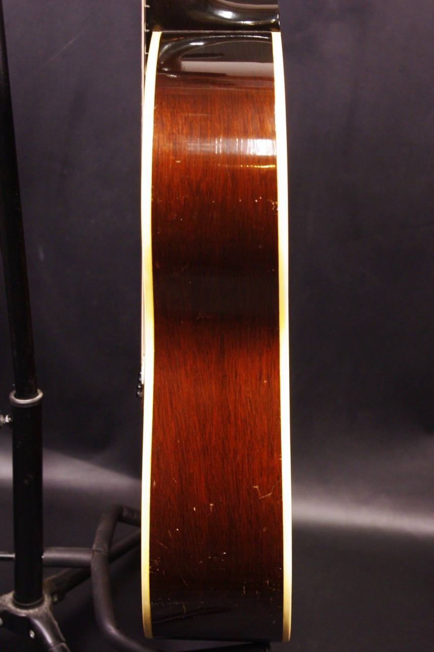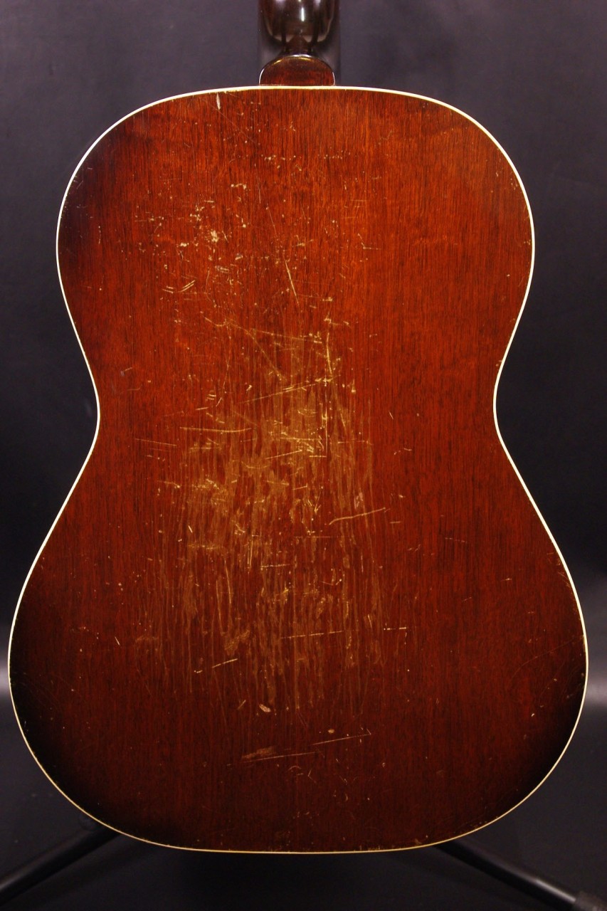 1960年代レクタンギュラーブリッジ期のLG-1が入荷しました!!トップはスプルース、サイドバックにはマホガニー、指板とブリッジにはハカランダを採用、ラダーブレーシングが最大の特徴でLG-2と比べると明るく軽快です!!シリアルナンバーから1961年製でクルーソン製3連ペグ、薄いラージピックガード、ブリッジはオリジナルで残っていました!ピックガードの内側に沿ってクラック補修箇所があります。サウンドホールに弾き傷、全体的に傷は多めにありますが雰囲気がよく演奏性、サウンドが良いので一押しですね!ネックヒールへのストラップピン加工、ピックアップの取り付け加工はございません。ナット幅は約42mm、50年代と比べると若干薄めで握りやすいグリップです。ネックのアングルも理想的でトラスロッドの動作も問題なく機能しています。フレットは多少の減りは出ていますがまだまだ余裕があります。弦高は12フレット6弦側で約2.7mm、1弦側で約1.8mmの高さでハイポジションまで押さえやすく調整しています。サドル側での微調整も可能です。長年弾きこまれており乾いた味わい深いサウンドで仕上がっています!フィンガーピッキング中心で演奏される方におすすめ!チップボードケース