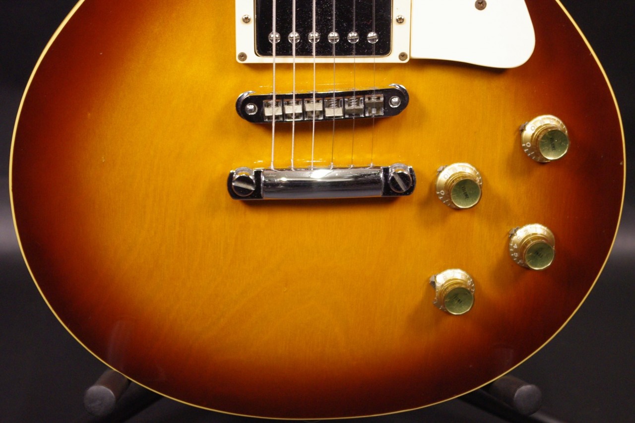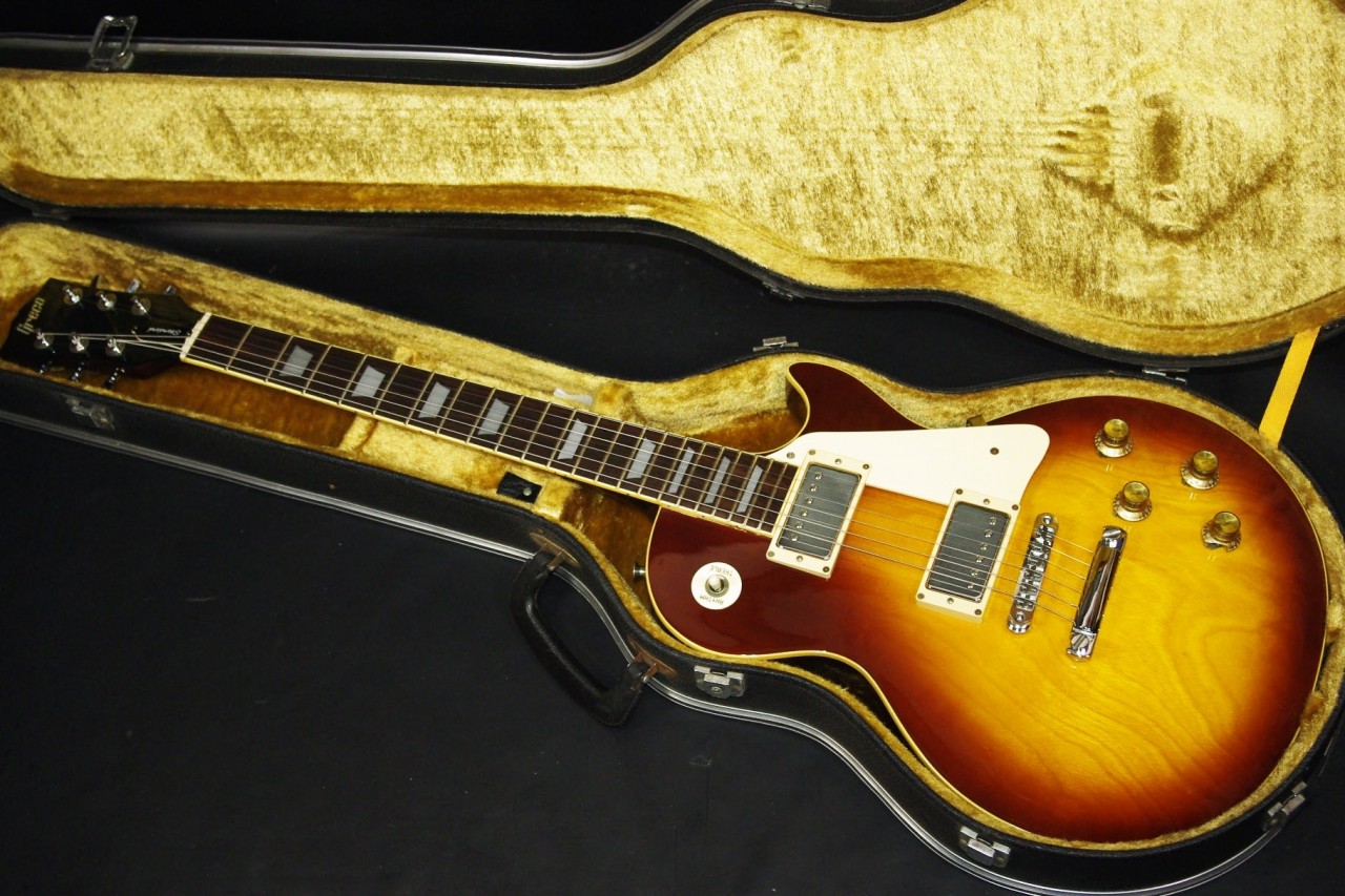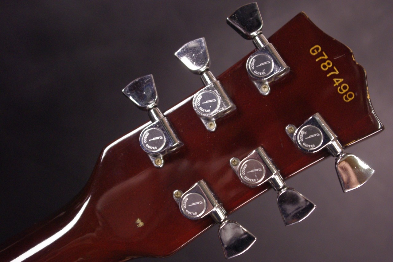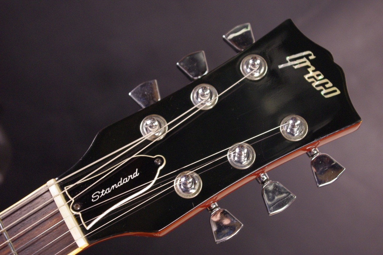 1970年代のグレコ EG450が味わい深いサンバーストフィニッシュで入荷しました!!ボディはバーチ、メイプルネックにローズウッド指板を採用したレスポールタイプで気軽に使えるジャパンビンテージ!シリアルナンバーから1978年頃に生産されたモデルで多少の傷、使用感はありますが40年以上経過した個体としては全体的に綺麗に残っていました。トーンコントローラーにダメージがありますがペグやピックガード、ピックアップなど主なパーツもオリジナルで残っています。ナット幅は約42.5mmのやや薄めの握りやすいグリップです。ネックのアングルは僅かな元起きがありますが許容派範囲です。フレットの高さもありますので安心です。弦高もハイポジションまで押さえやすく調整していますがお好みに合せた微調整にもお応えいたします。重量は約4キロ、トーンにガリが出ていますがその他の電装系は問題なくお使いいただけます!是非この機会にどうぞ!ハードケース付き