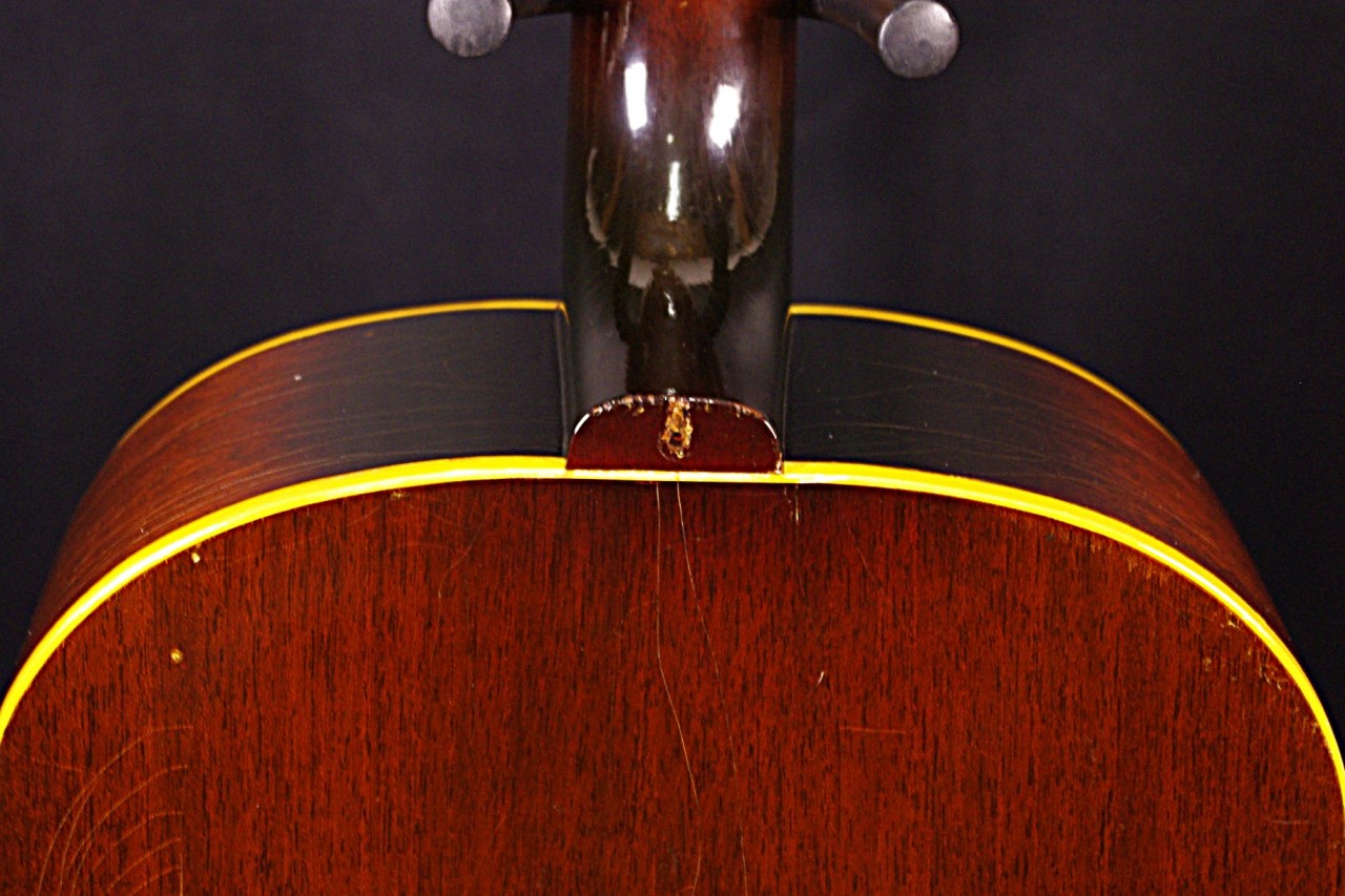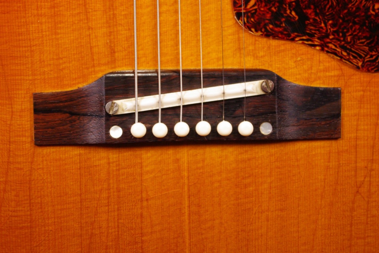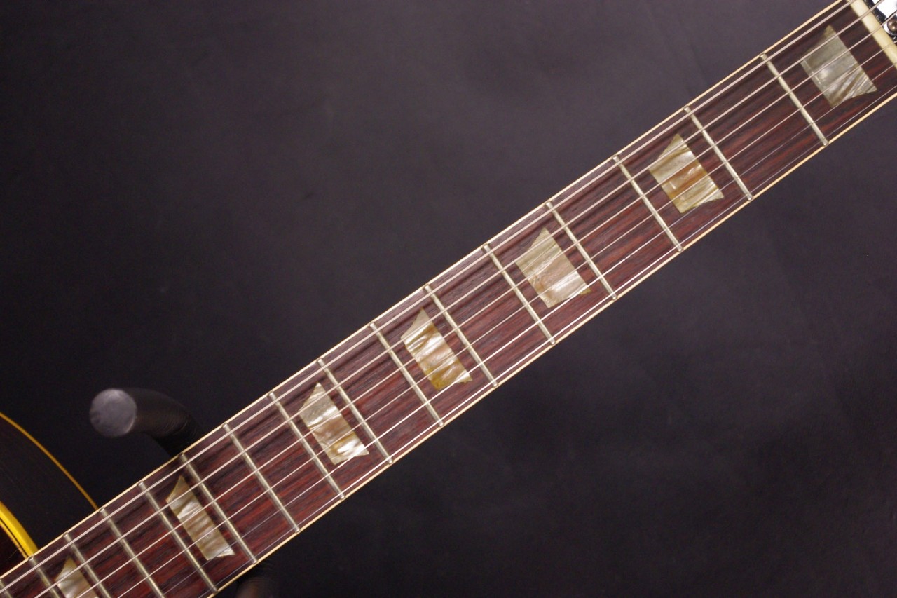 1960年代ナローネック期!おすすめのJ-160Eが入荷しました!!トップはスプルース、サイドバックにはマホガニー、指板とブリッジにはハカランダを採用、ナローネックまたセラミックサドルを採用したJ-160Eでヘッドのクラウンインレイも上に位置しているのもこの時期までの特徴です!1967年製で2コブクルーソンチューナー、べっ甲柄ピックガード、P-90ピックアップなど主なパーツもオリジナルで残っておりサンバーストカラーの雰囲気も最高です!!バックの左上にクラック補修箇所、全体的にウェザーチェックはありますが60年近く経過した個体としては綺麗で光沢が残っています。演奏性もよいので狙い目ですね!ネックヒールヘはストラップピンの穴埋め修正があります。ナット幅は約40mm、ネックのアングルも適正でトラスロッドの動作にも余裕があります。フレットは以前に交換されており少々の減りは出ていますが長期でお使いいただけます。弦高もハイポジションまで押さえやすく調整していますがお好みに合せた微調整にもお応えいたします。合板、ラダーブレーシングのため同時期のJ-45と比べると明るくより軽快でキレの良い生音が特徴です!電装系の不具合もなく太く乾いた味わい深いサウンドでお楽しみいただけます!!ナローネックのJ-160Eで探していた方にとっては一押しの1本!是非この機会に弾いてみてください!!ボブレンハードケース付き