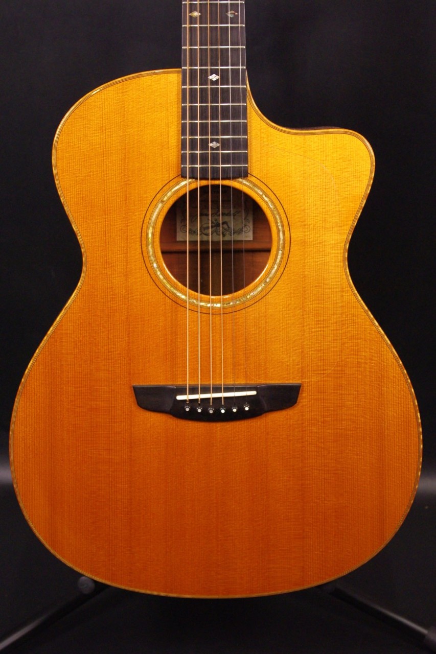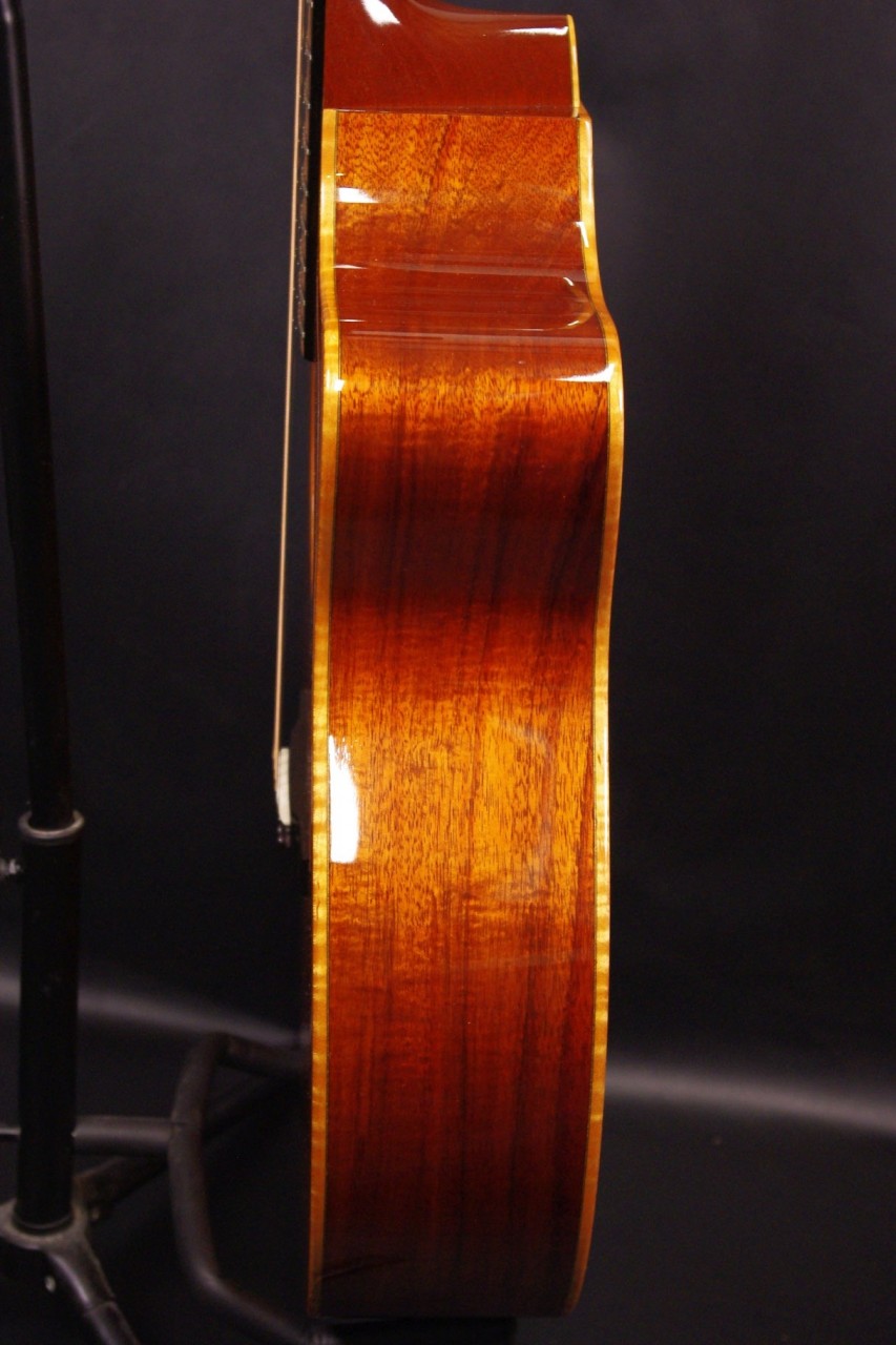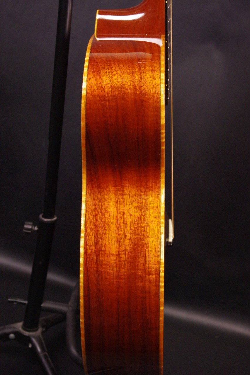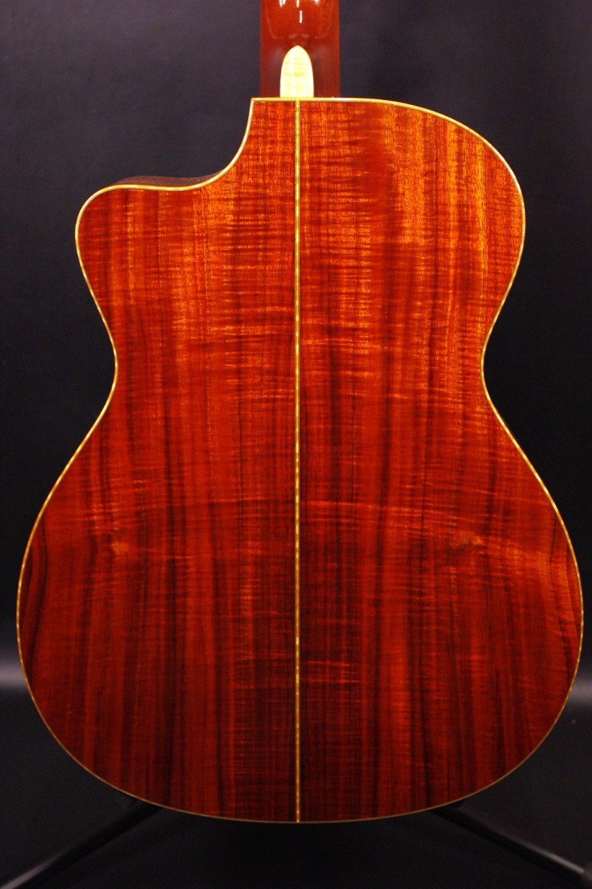稀少なハワイ時代に生産されたJAMES GOODALL KGCCが入荷しました!!トップはシトカスプルース、サイドバックには木目の美しいAAグレードのハワイアンコア、指板とブリッジにはエボニーの厳選された材を採用、グランドコンサートボディにカッタウェイ仕様の扱いやすいサイズも魅力で長時間の演奏も疲れません!美しいメイプルバインディング、ダイヤモンドのポジションインレイなど見た目も高級感がありますね!シリアルナンバーから2005年に生産された個体で貼付けピエゾピックアップが搭載されています。ペグ、ブリッジなどのパーツはオリジナルで残っていました。傷は少なく美品と言ってよいでしょう!演奏性、サウンドも優れていますので安心いただけます。ナット幅は約43mm、やや薄めで幅広い演奏に適したネックグリップです。アングルも理想的でトラスロッドの動作も問題なく機能しています。フレットの高さもあり長期で気にしないでお使いいただけます。弦高は12フレット6弦側で約2.4mm、1弦側で約1.5mmの高さでハイポジションまで押さえやすく調整しています。お好みに合せた微調整にもお応えいたします。ハワイアンコア特有の軽やかで繊細な美しいサウンドで特にフィンガーピキング中心で演奏される方に一押しです!!甘さもあり非常に癒されます!!是非この機会にお試しください。オリジナルハードケース付き