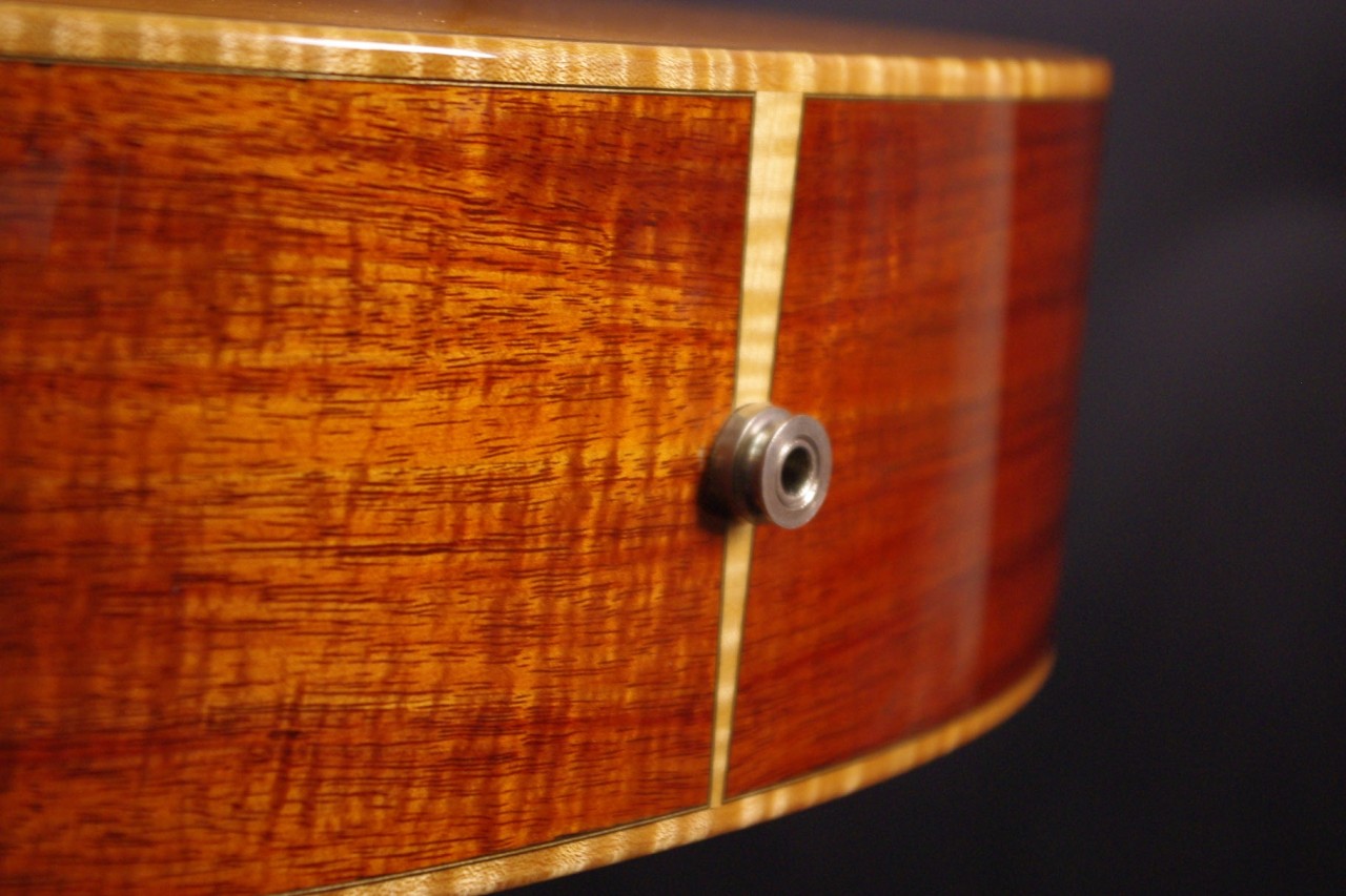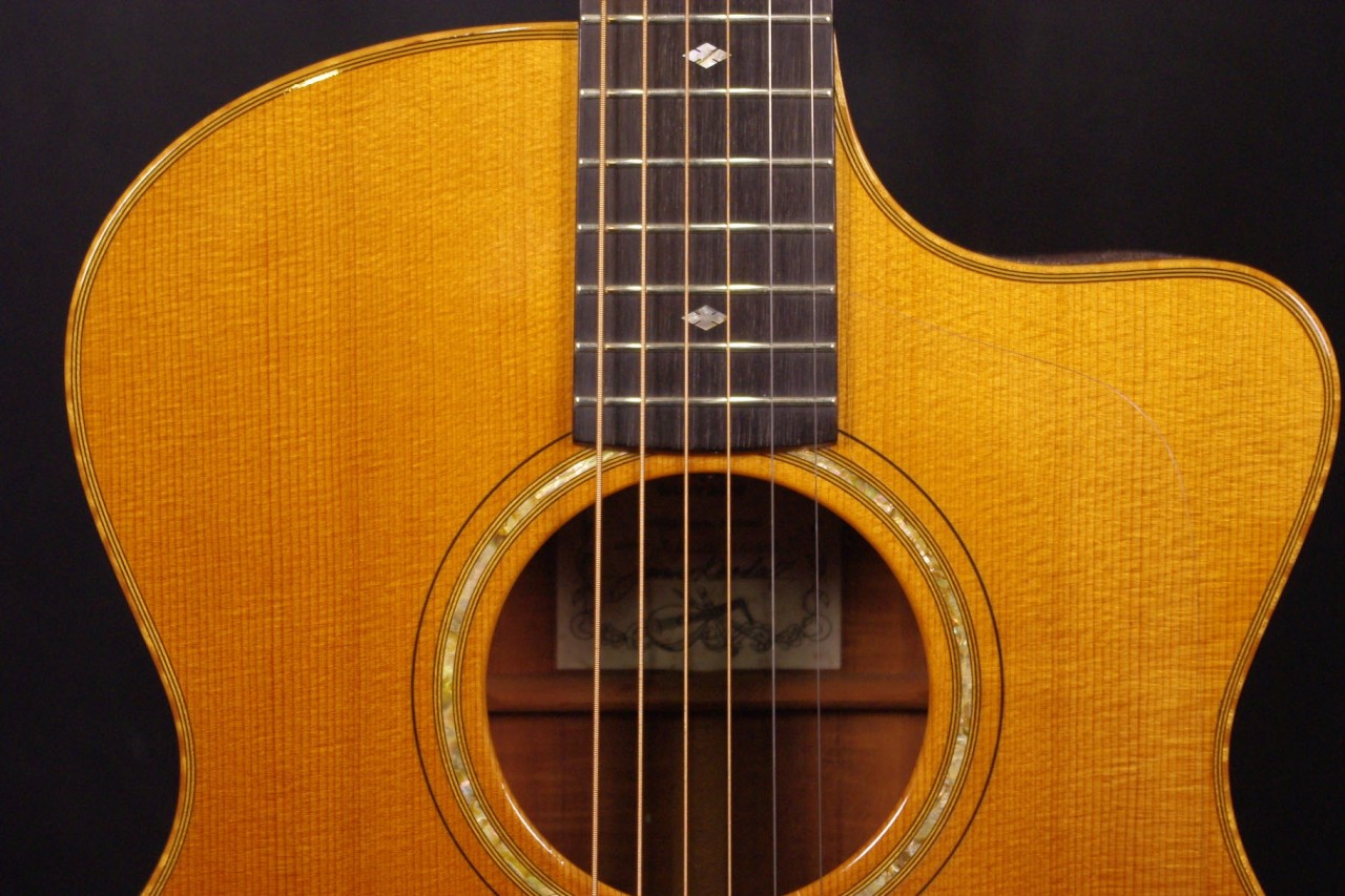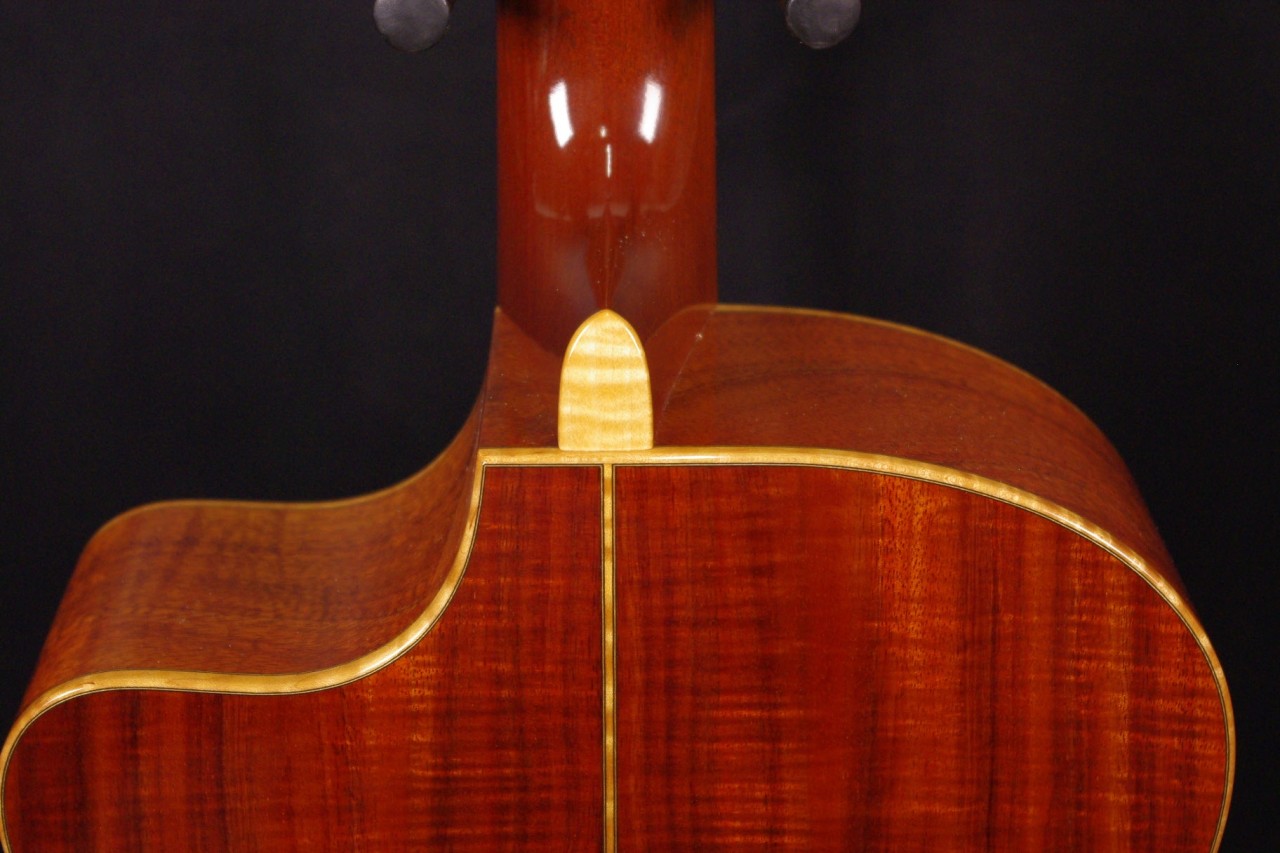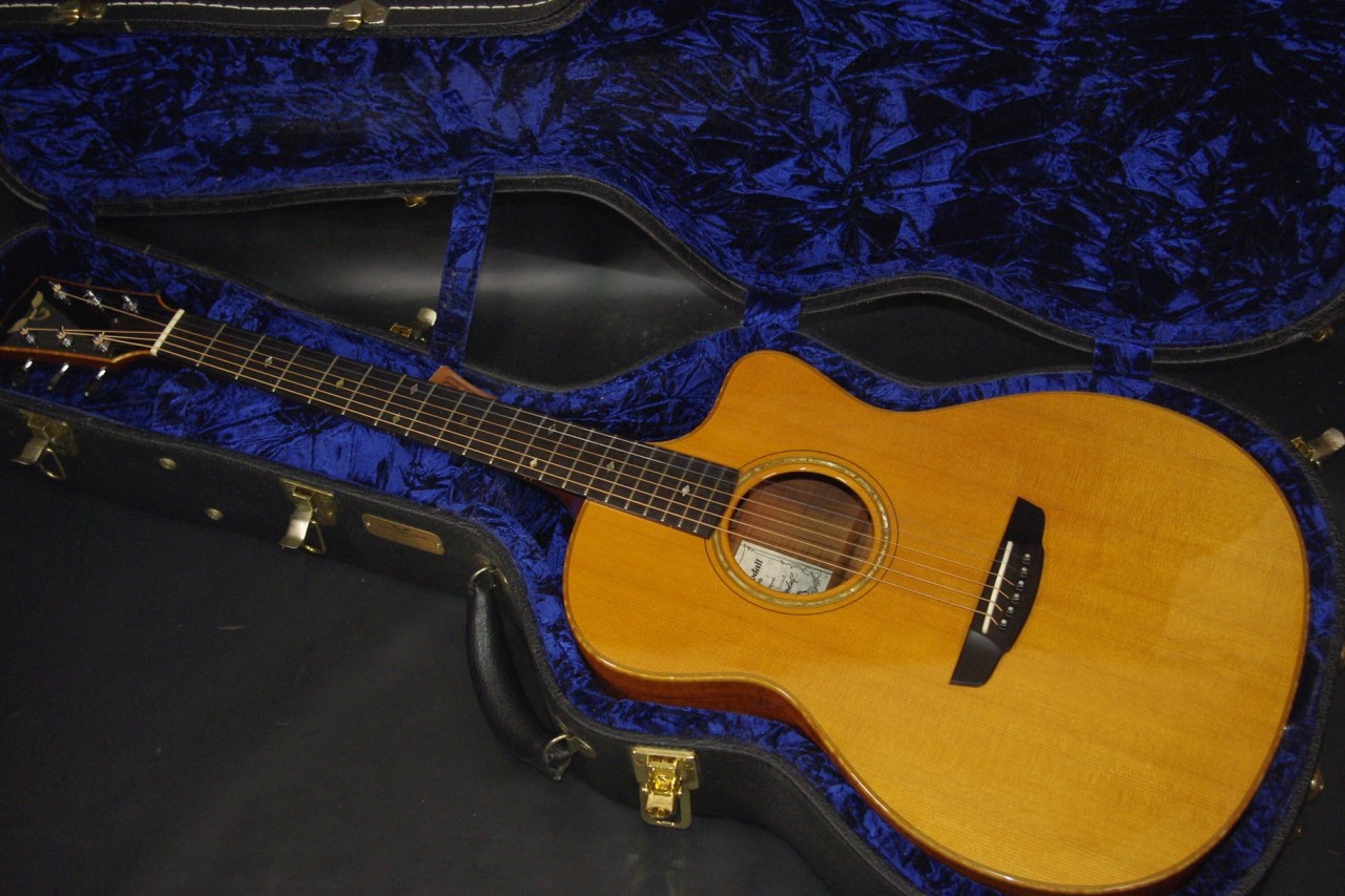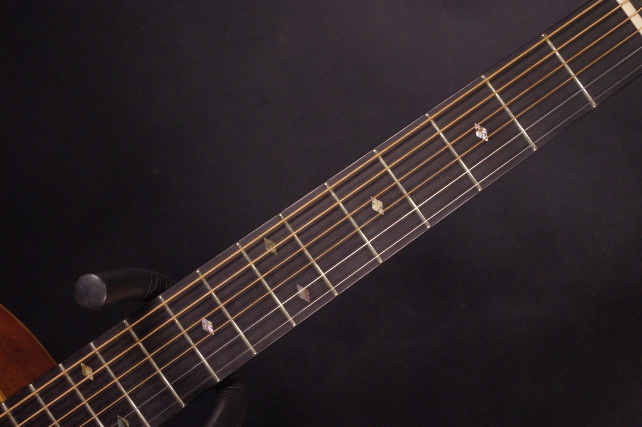 稀少なハワイ時代に生産されたJAMES GOODALL KGCCが入荷しました!!トップはシトカスプルース、サイドバックには木目の美しいAAグレードのハワイアンコア、指板とブリッジにはエボニーの厳選された材を採用、グランドコンサートボディにカッタウェイ仕様の扱いやすいサイズも魅力で長時間の演奏も疲れません!美しいメイプルバインディング、ダイヤモンドのポジションインレイなど見た目も高級感がありますね!シリアルナンバーから2005年に生産された個体で貼付けピエゾピックアップが搭載されています。ペグ、ブリッジなどのパーツはオリジナルで残っていました。傷は少なく美品と言ってよいでしょう!演奏性、サウンドも優れていますので安心いただけます。ナット幅は約43mm、やや薄めで幅広い演奏に適したネックグリップです。アングルも理想的でトラスロッドの動作も問題なく機能しています。フレットの高さもあり長期で気にしないでお使いいただけます。弦高は12フレット6弦側で約2.4mm、1弦側で約1.5mmの高さでハイポジションまで押さえやすく調整しています。お好みに合せた微調整にもお応えいたします。ハワイアンコア特有の軽やかで繊細な美しいサウンドで特にフィンガーピキング中心で演奏される方に一押しです!!甘さもあり非常に癒されます!!是非この機会にお試しください。オリジナルハードケース付き