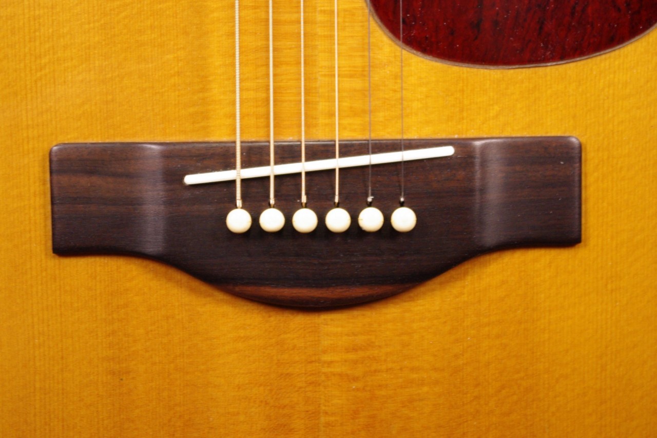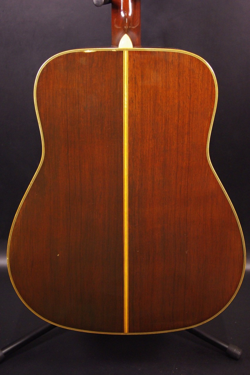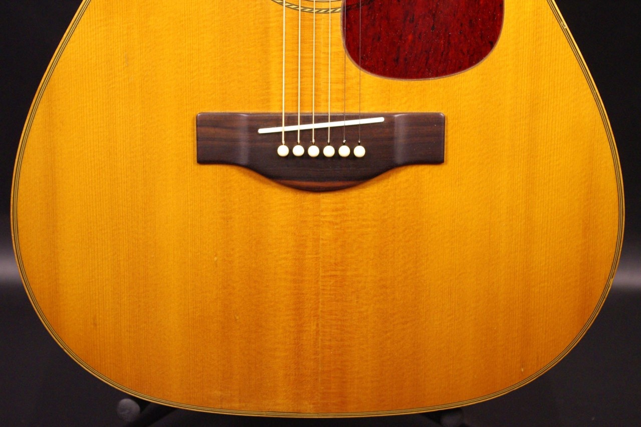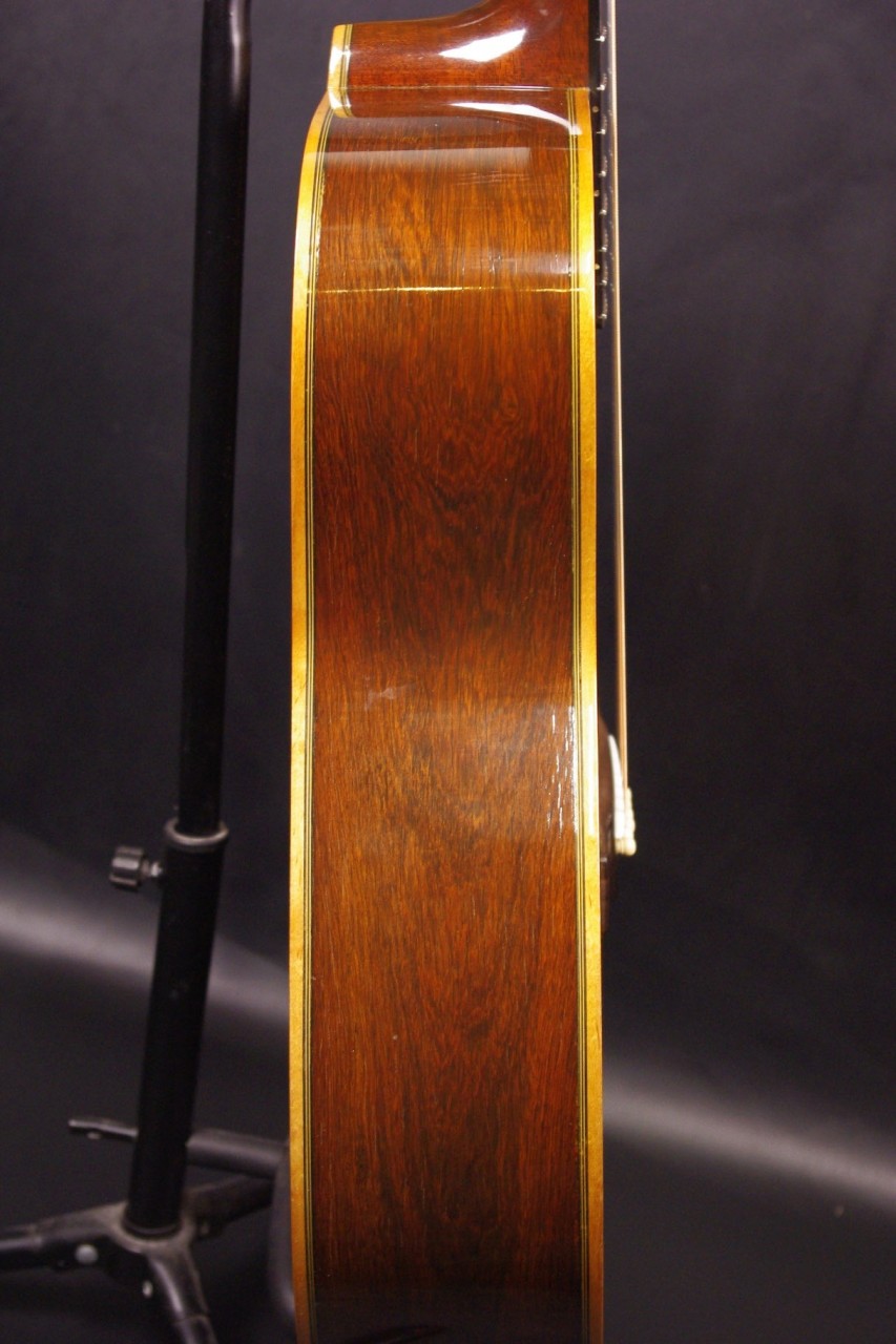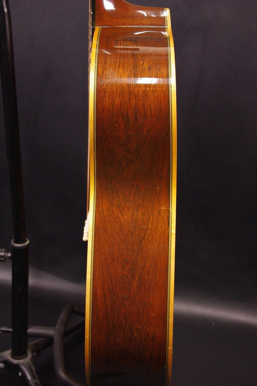 貴重な赤ラベルの上位機種!!希少ハカランダを使ったFG-500が入荷しました!!トップはスプルース単板、サイドバックにはハカランダのバック単板を採用、シリアルナンバーとボディ内のスタンプから1972年に生産された個体で50年以上経過しているわりには大変綺麗に残っていました!調整も行き届いていますので演奏性、サウンドも素晴らしく探していた方にとっては非常におすうすめです!ペグ、ピックガード、ブリッジもオリジナルで残っていました。傷は多少ありますが綺麗に光沢があります。ネックヒールへのストラップピンやピックアップの取り付けなど特別な加工もございません。トップのセンターシーム補修がありますが演奏上まったく支障ございません。ナット幅は約44mmのやや太めのしっかりとしたグリップです。ネックのアングルも適正でトラスロッドの動作にも余裕があります。フレット交換、ナット、サドルも交換済みで演奏性も良いです。弦高は12フレット6弦側で約2.6mm、1弦側で約1.9mmの高さでハイポジションまで押さえやすく調整しています。お好みに合せた微調整にもお応えいたします。ハカランダ特有のパリッと乾いた粒立ちの良いサウンド!軽快ですっきりと前に抜けてくれます!サイドは合板になりますがボディ全体が良く振動しておりヴォリュームも凄いですよ!狙い目!!是非この機会にお試しください!汎用ハードケースつき