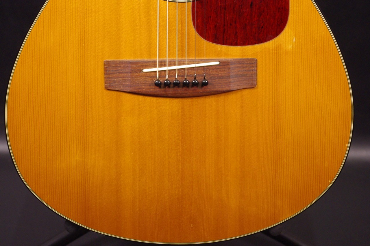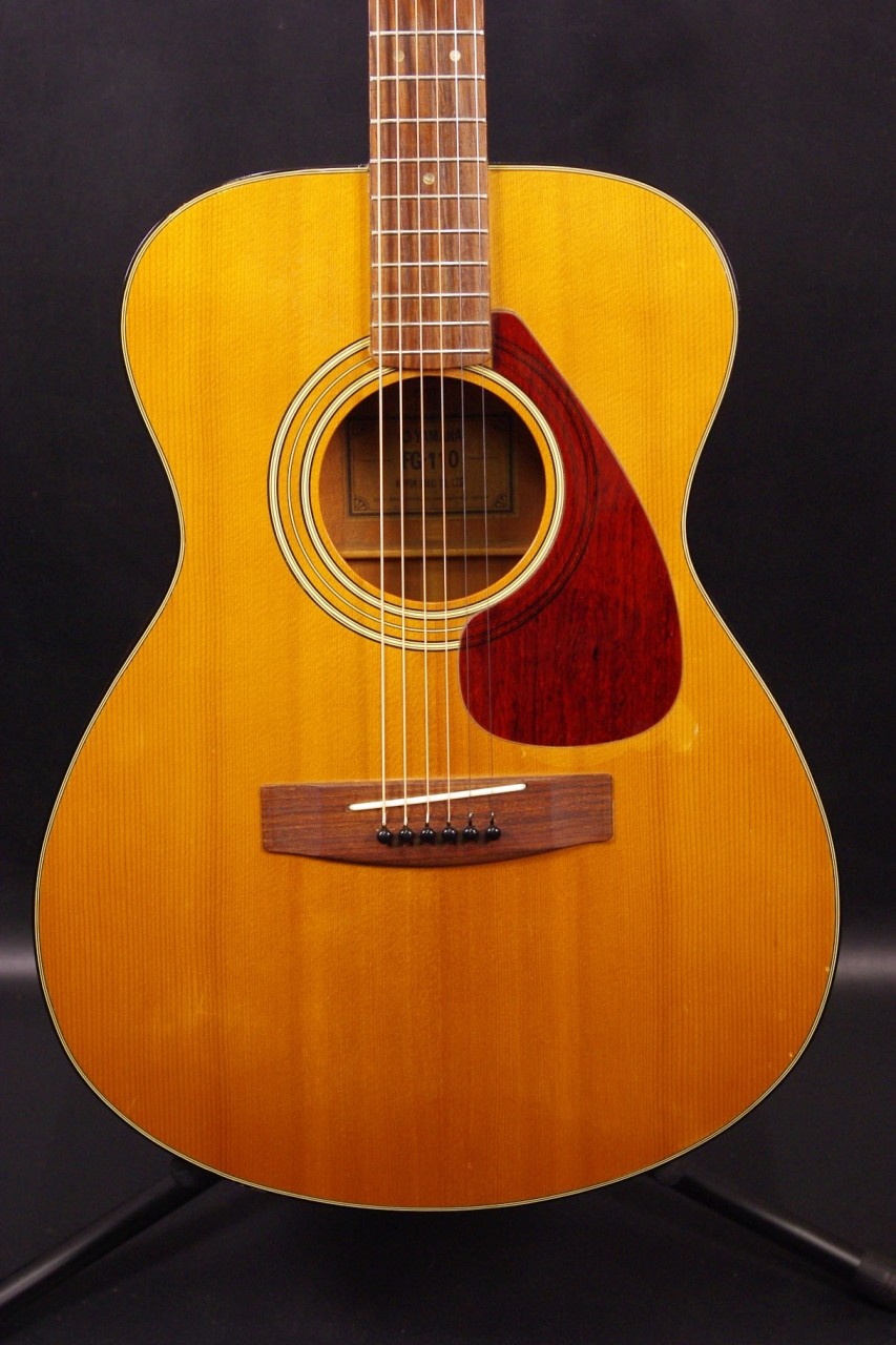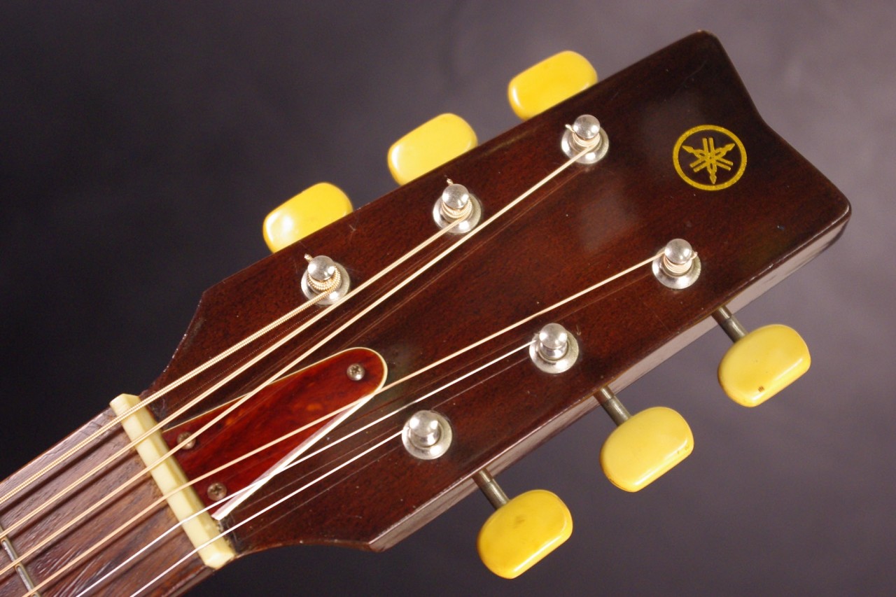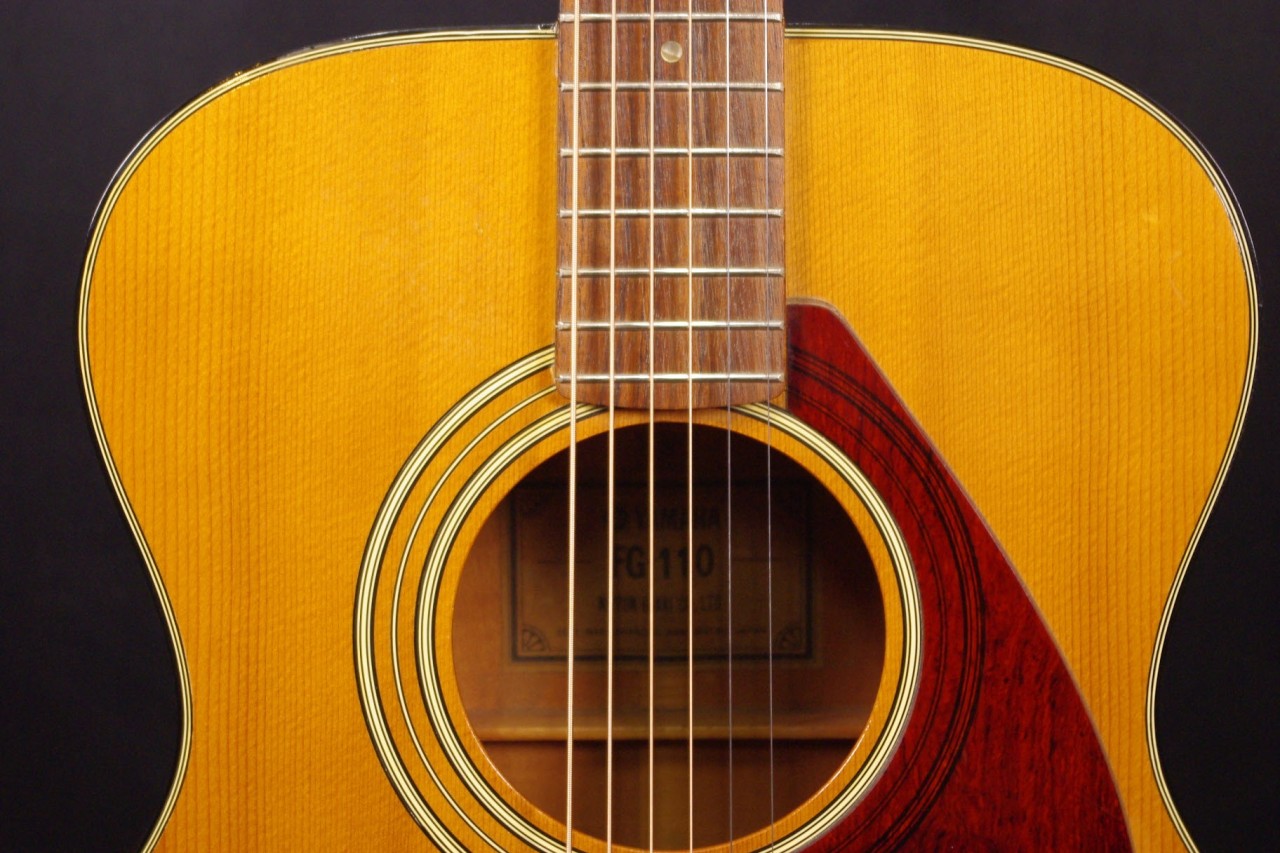 1972年から1974年頃までかけて生産されたグリーンラベル期のヤマハ FG-110が入荷しました!!トップはスプルース、サイドバックには楓、指板とブリッジはローズウッドが有力、当時のカタログには無い珍しいモデルでヘッドの裏にはmade in Japanと入っています。抱えやすいフォークサイズで手軽にお楽しみいただけるのが魅力ですね!ペグ、ピックガード、ブリッジはオリジナルで残っていました。傷等ありますが年式の割には綺麗に残っていました。ネックヒールへのストラップピン加工、ピックアップの取り付け加工はございません。ナット幅は約44mmのやや太めのグリップが特徴です。ネックのアングルも適正でトラスロッドの動作も問題なく機能しています。フレットは多少の減りは出ていますが今のところ支障なくお使いいただけます。サドル残は少なめで弦高は12フレット6弦側で約3.1mm、1弦側で約2.2mmの高さで調整しておりローポジション中心での演奏におすすめです。マホガニーボディと比べると硬質でパリッとすっきりとした音抜けで指で弾いても反応がよいです!合板ですが十分な音量で軽いタッチで抜けてくれます!是非この機会にお試しください。汎用ハードケース付