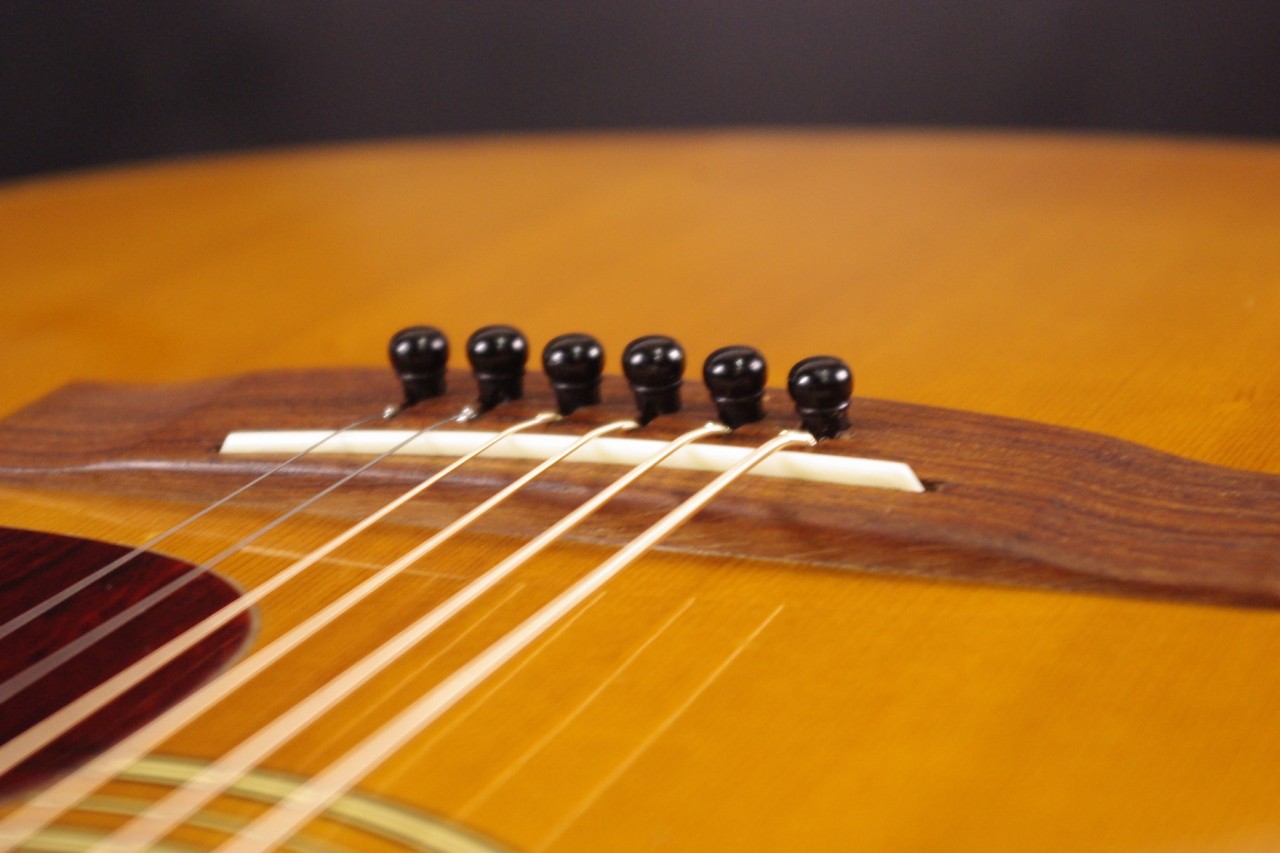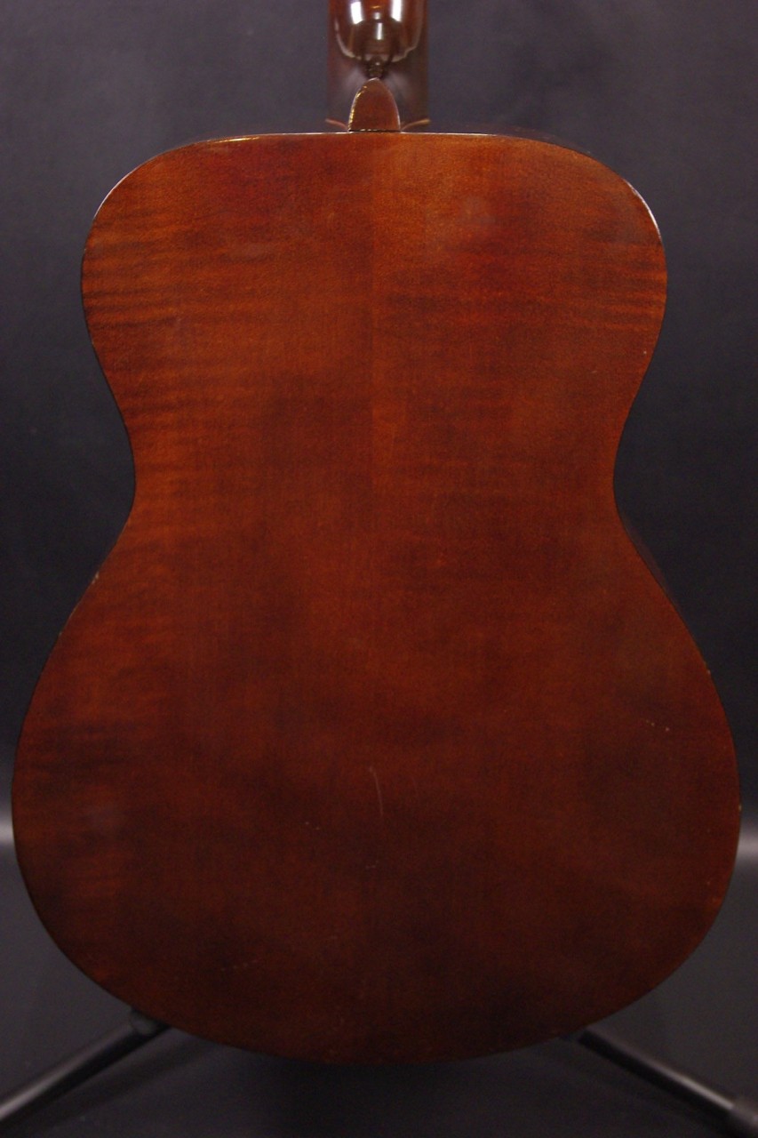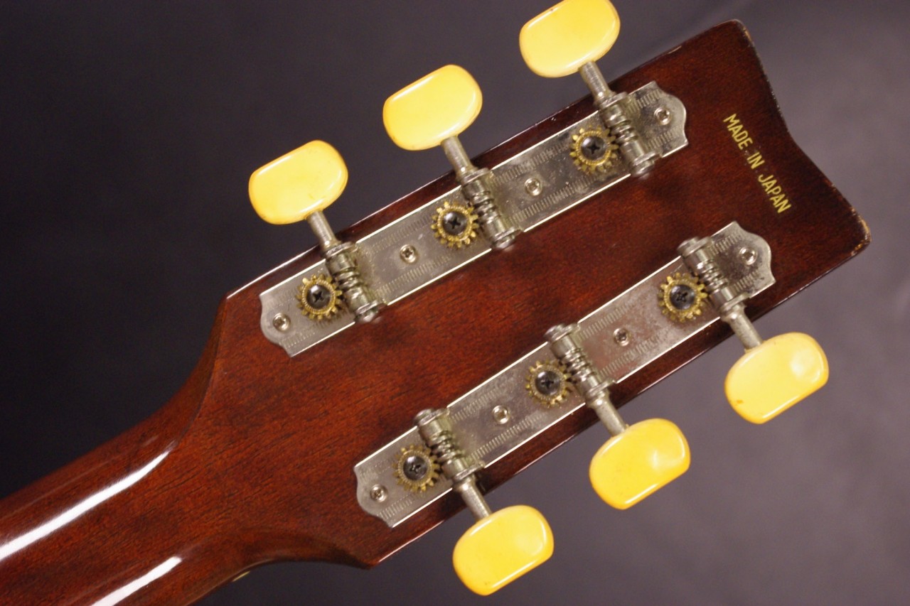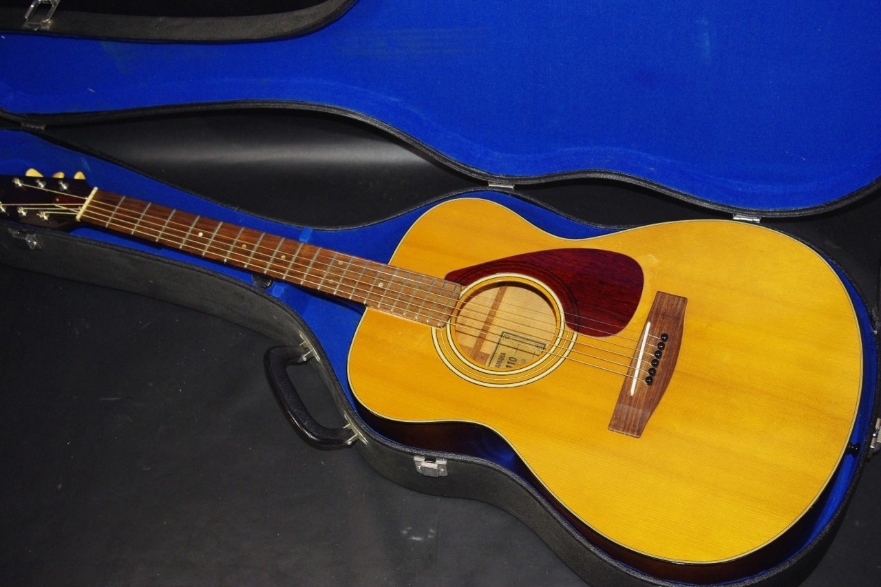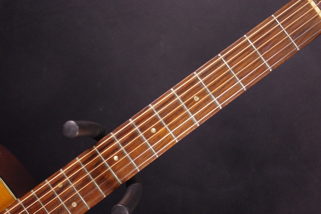 1972年から1974年頃までかけて生産されたグリーンラベル期のヤマハ FG-110が入荷しました!!トップはスプルース、サイドバックには楓、指板とブリッジはローズウッドが有力、当時のカタログには無い珍しいモデルでヘッドの裏にはmade in Japanと入っています。抱えやすいフォークサイズで手軽にお楽しみいただけるのが魅力ですね!ペグ、ピックガード、ブリッジはオリジナルで残っていました。傷等ありますが年式の割には綺麗に残っていました。ネックヒールへのストラップピン加工、ピックアップの取り付け加工はございません。ナット幅は約44mmのやや太めのグリップが特徴です。ネックのアングルも適正でトラスロッドの動作も問題なく機能しています。フレットは多少の減りは出ていますが今のところ支障なくお使いいただけます。サドル残は少なめで弦高は12フレット6弦側で約3.1mm、1弦側で約2.2mmの高さで調整しておりローポジション中心での演奏におすすめです。マホガニーボディと比べると硬質でパリッとすっきりとした音抜けで指で弾いても反応がよいです!合板ですが十分な音量で軽いタッチで抜けてくれます!是非この機会にお試しください。汎用ハードケース付