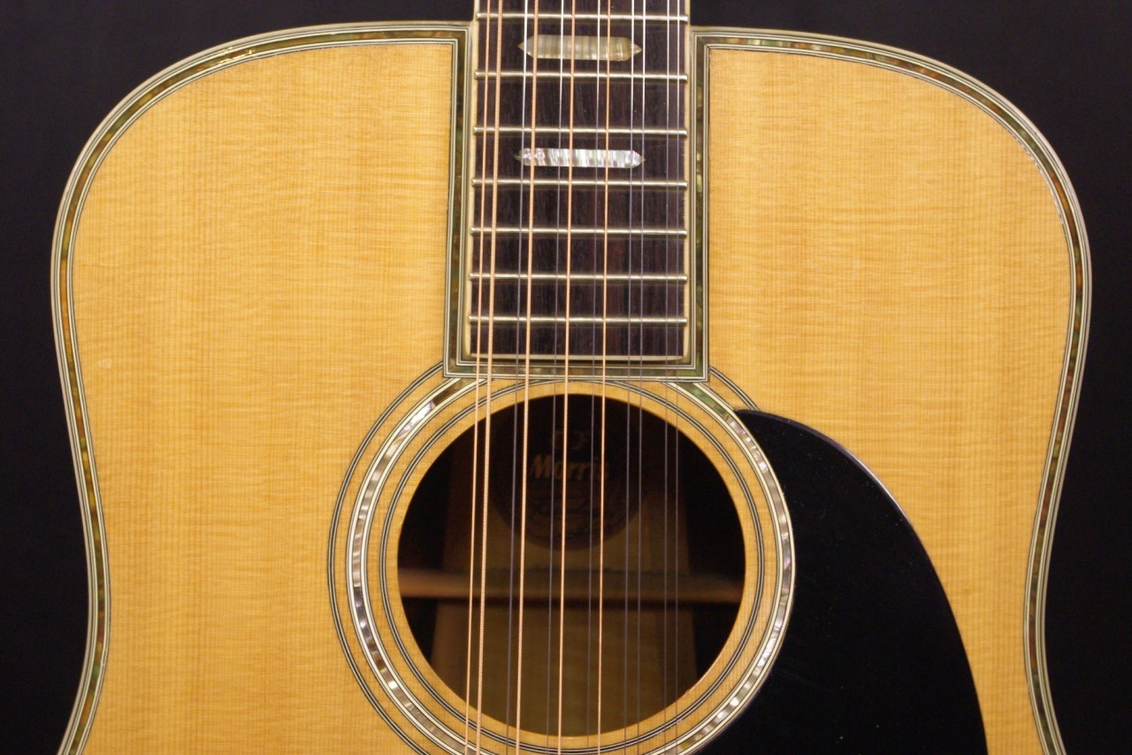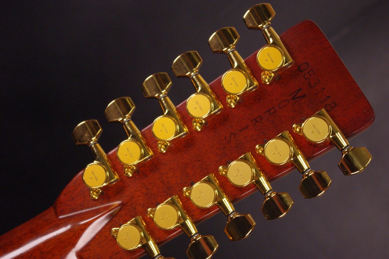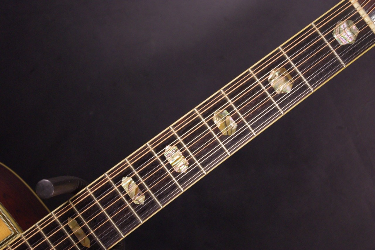 1970年代後期から1980年初期にかけて生産されたモーリスの12弦ギター B-100が入荷しました!!トップはスプルース単板、サイドバックには希少材ハカランダとチェスナット合板を採用、12弦Bシリーズの上位機種で指板にはヘキサゴンのポジションインレイが入ったおり高級感があります!!ペグはゴトー製に交換されておりビスの穴埋め跡が確認できます。ピックガード、ブリッジはオリジナルで残っていました。ネックヒールへはストラップピンが打っています。またアンダーサドルピエゾピックアップが搭載されています。細かい傷はありますが年式の割には綺麗で光沢があります。ナット幅は約47.5mm、ネックのアングルは適正でトラスロッドは硬さを感じるところまで締めて調整しています。フレットの消耗も少なく長期でお使いいただけます。サドル残は少なめで弦高は12フレット6弦側で約3.1mm、1弦側で約2.3mmの高さになりますのでローコード中心で演奏される方におすすめです。輪郭のくっきりとした煌びやかなサウンド!纏まりがよく特にストロークで弾くと最高に気持ちがよいです!!探していた方は是非この機会にお試しください!汎用ハードケース付き
