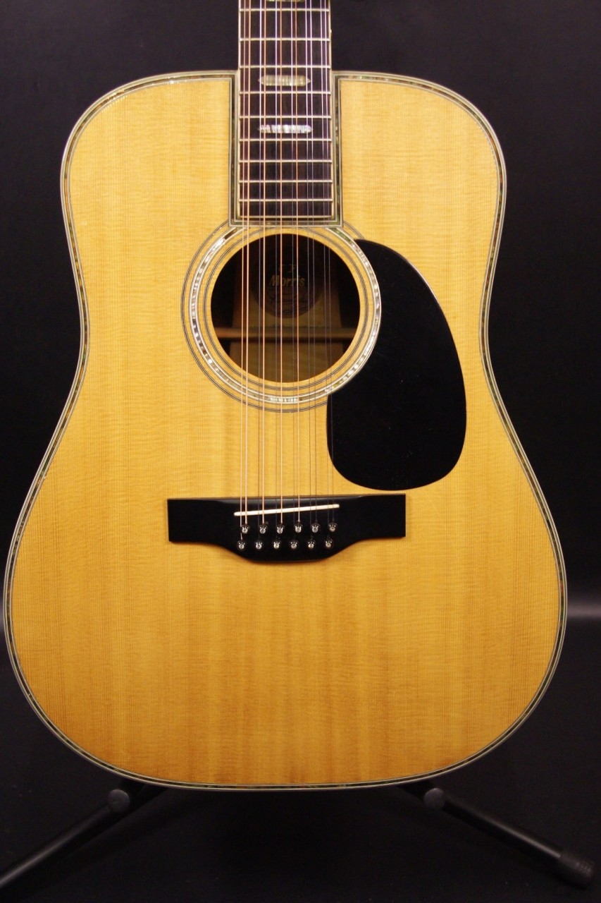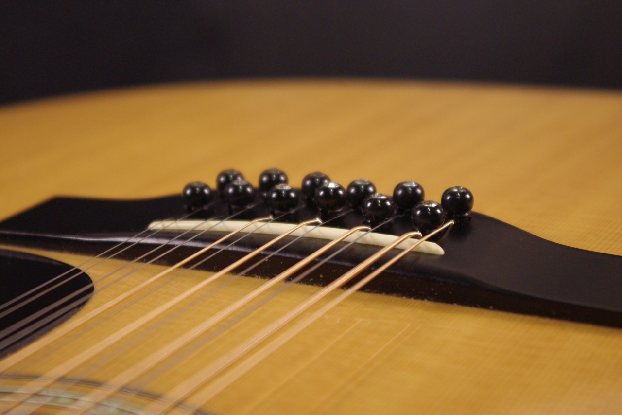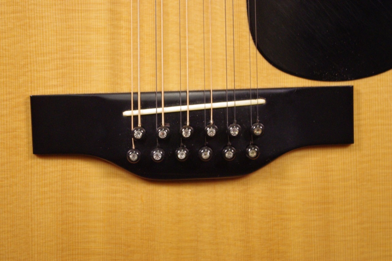 1970年代後期から1980年初期にかけて生産されたモーリスの12弦ギター B-100が入荷しました!!トップはスプルース単板、サイドバックには希少材ハカランダとチェスナット合板を採用、12弦Bシリーズの上位機種で指板にはヘキサゴンのポジションインレイが入ったおり高級感があります!!ペグはゴトー製に交換されておりビスの穴埋め跡が確認できます。ピックガード、ブリッジはオリジナルで残っていました。ネックヒールへはストラップピンが打っています。またアンダーサドルピエゾピックアップが搭載されています。細かい傷はありますが年式の割には綺麗で光沢があります。ナット幅は約47.5mm、ネックのアングルは適正でトラスロッドは硬さを感じるところまで締めて調整しています。フレットの消耗も少なく長期でお使いいただけます。サドル残は少なめで弦高は12フレット6弦側で約3.1mm、1弦側で約2.3mmの高さになりますのでローコード中心で演奏される方におすすめです。輪郭のくっきりとした煌びやかなサウンド!纏まりがよく特にストロークで弾くと最高に気持ちがよいです!!探していた方は是非この機会にお試しください!汎用ハードケース付き