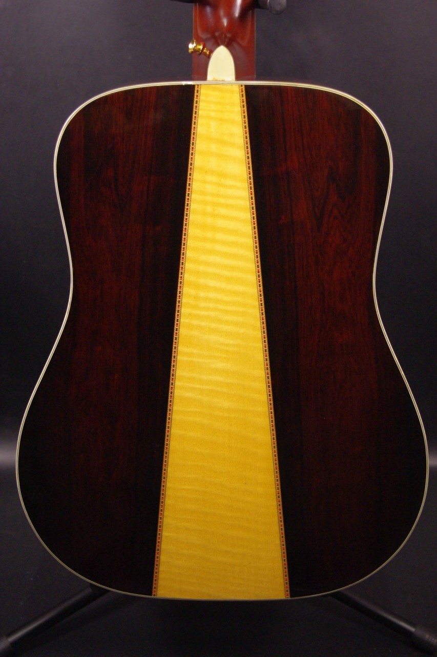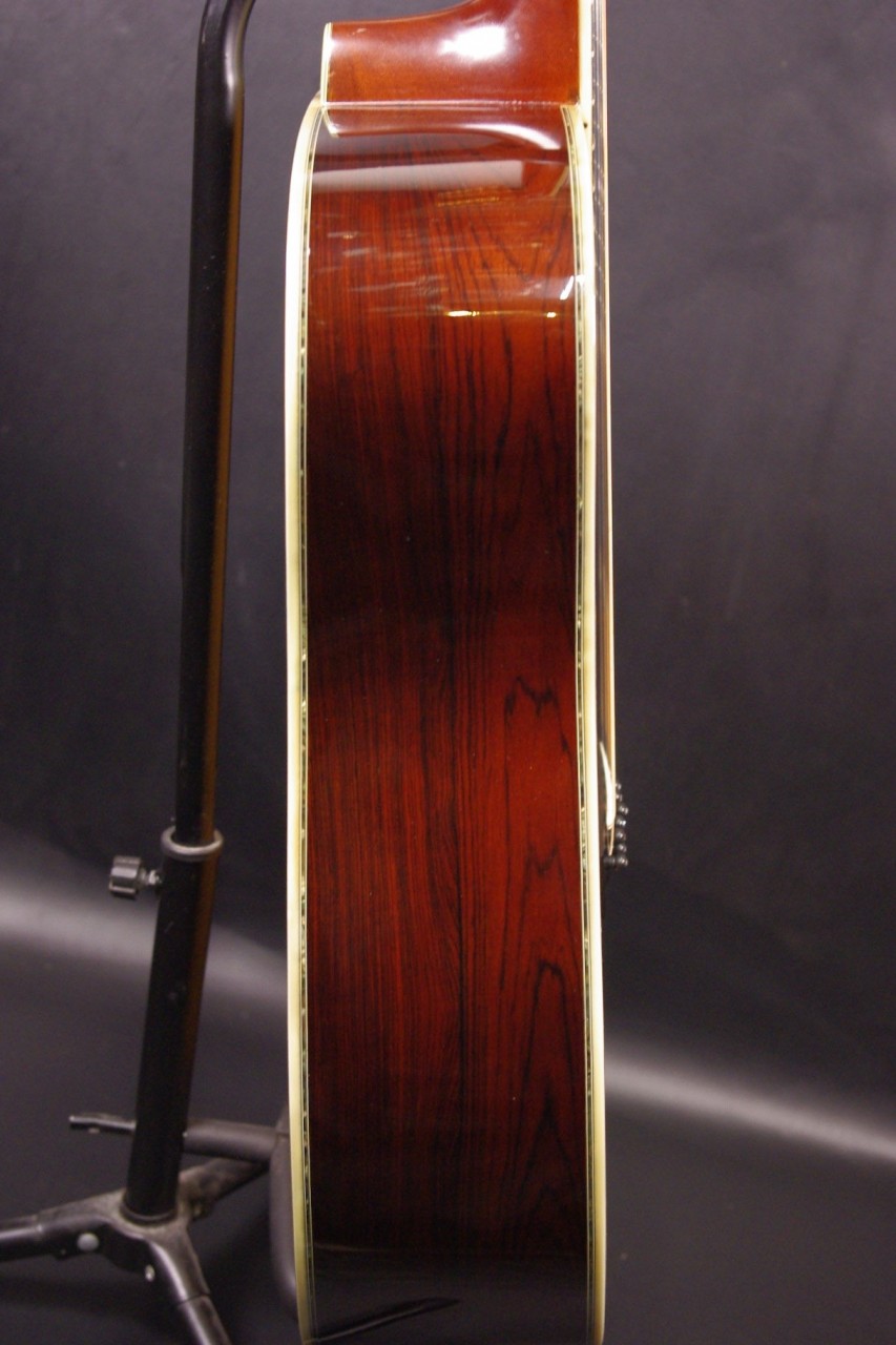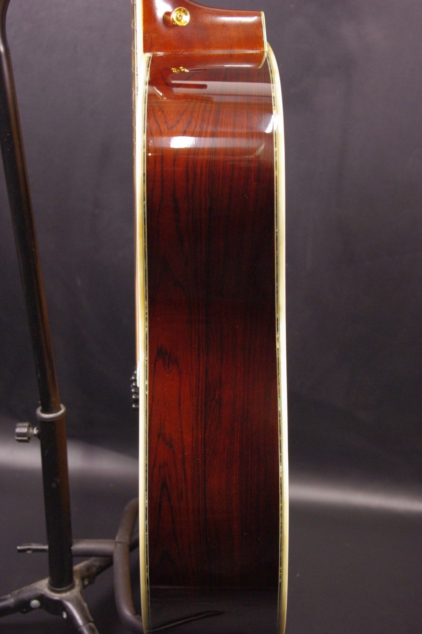 トップ スプルース単板、サイドバック ハカランダ3ピース(センターチェスナット)合板、指板・ブリッジ シマコクタン、ネック マホガニー、ゴトー製ゴールドペグチェンジ、オリジナルブラックピックガード、Xブレーシング、ヘキサゴンポジションインレイ、