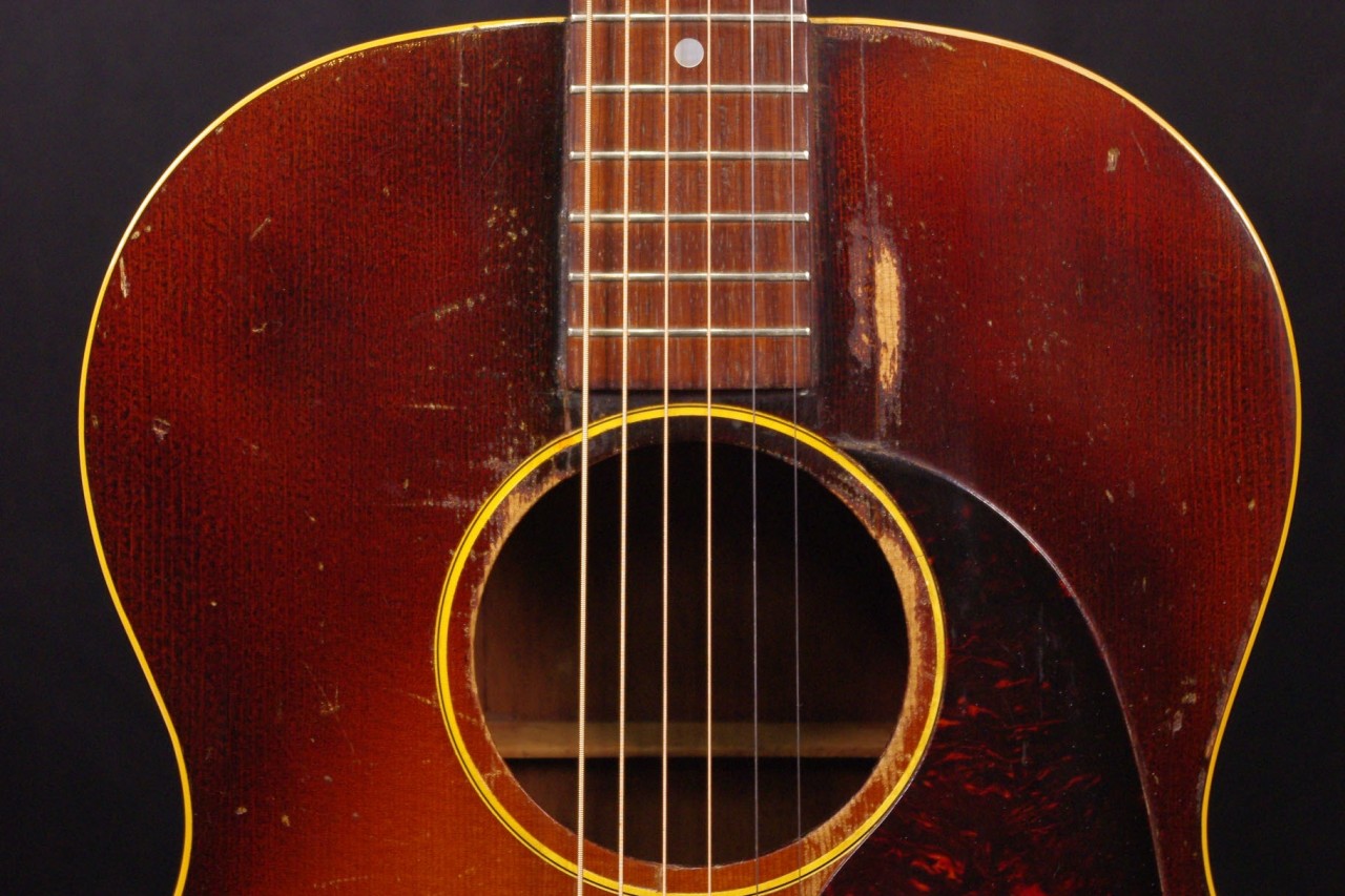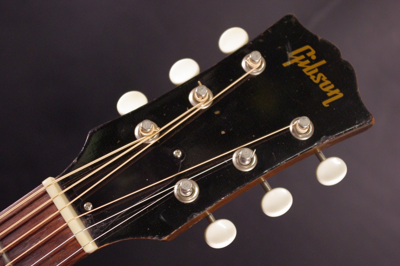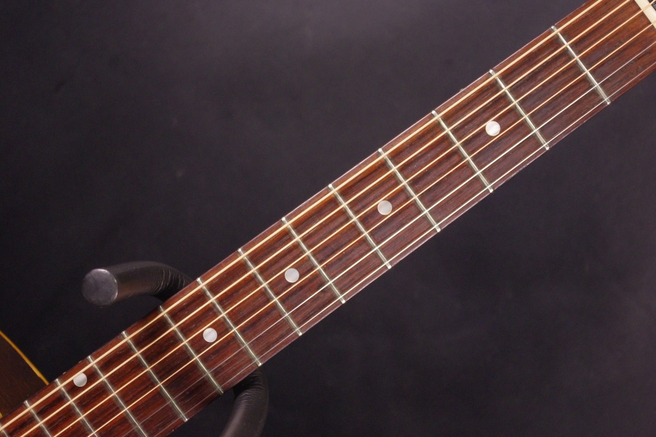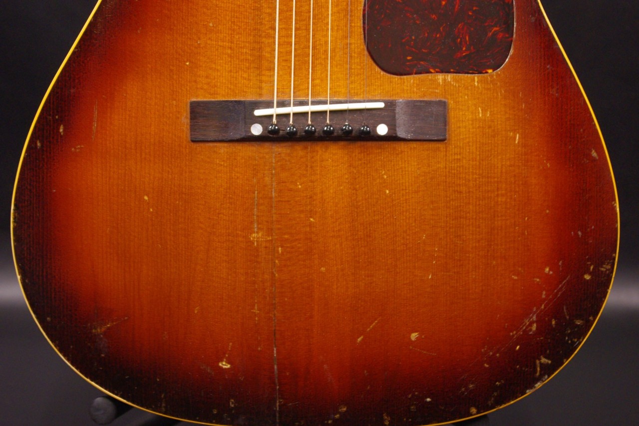 1950年代スモールピックガード期のLG-1が入荷しました!!トップはスプルース、サイドバックにはマホガニー、指板とブリッジにはハカランダを採用、同時期のLG-2と比べるとラダーブレーシングの影響からより明るく軽快なサウンドが特徴です。シリアルナンバーから1954年に生産された個体でボディにクラック補修が多数あります。サウンドホール周囲に弾き傷、全体的に傷も多めにあります。以前にバックを外しブレーシング補修、板を追加して補強されています。ペグは3連タイプに交換されています。ブリッジはオリジナルですが薄く加工されています。ピックガードはオリジナルで残っています。ネックヒールへはストラップピンが打っています。ピックアップの取り付け加工はございません。ナット幅は約42.5mm、60年代と比べるとやや厚みのある握りやすいグリップです。ネックのアングルは適正でトラスロッドの動作に余裕があります。フレットは全体的に低めですが今のところ演奏上支障ございません。弦高は12フレット6弦側で約2.6mm、1弦側で約1.6mmの高さでハイポジションまで押さえやすく調整しています。サドル残もありますので微調整も可能です。沢山弾きこまれていますのでカラッと枯れた味わい深いサウンドで仕上がっています!オーバーサイズのハードケース付き