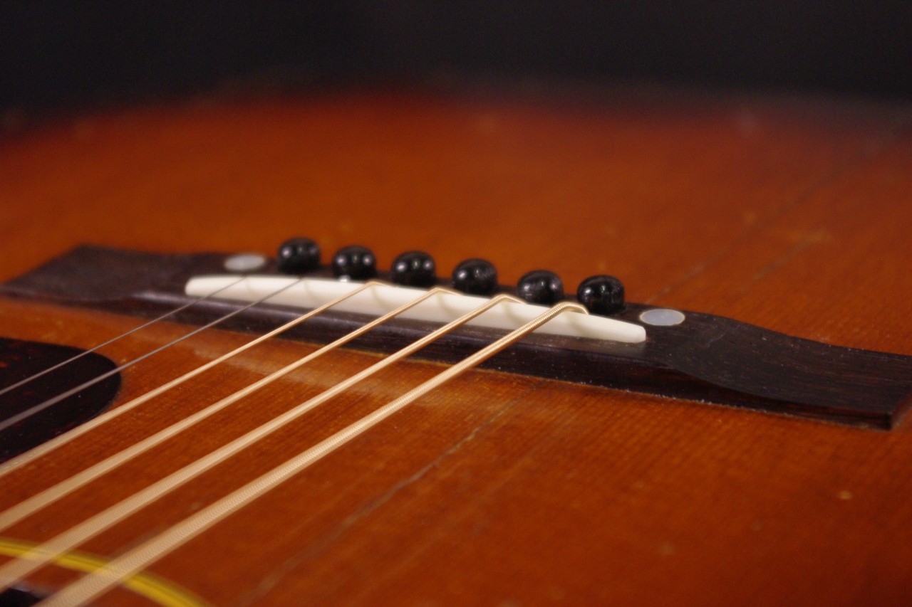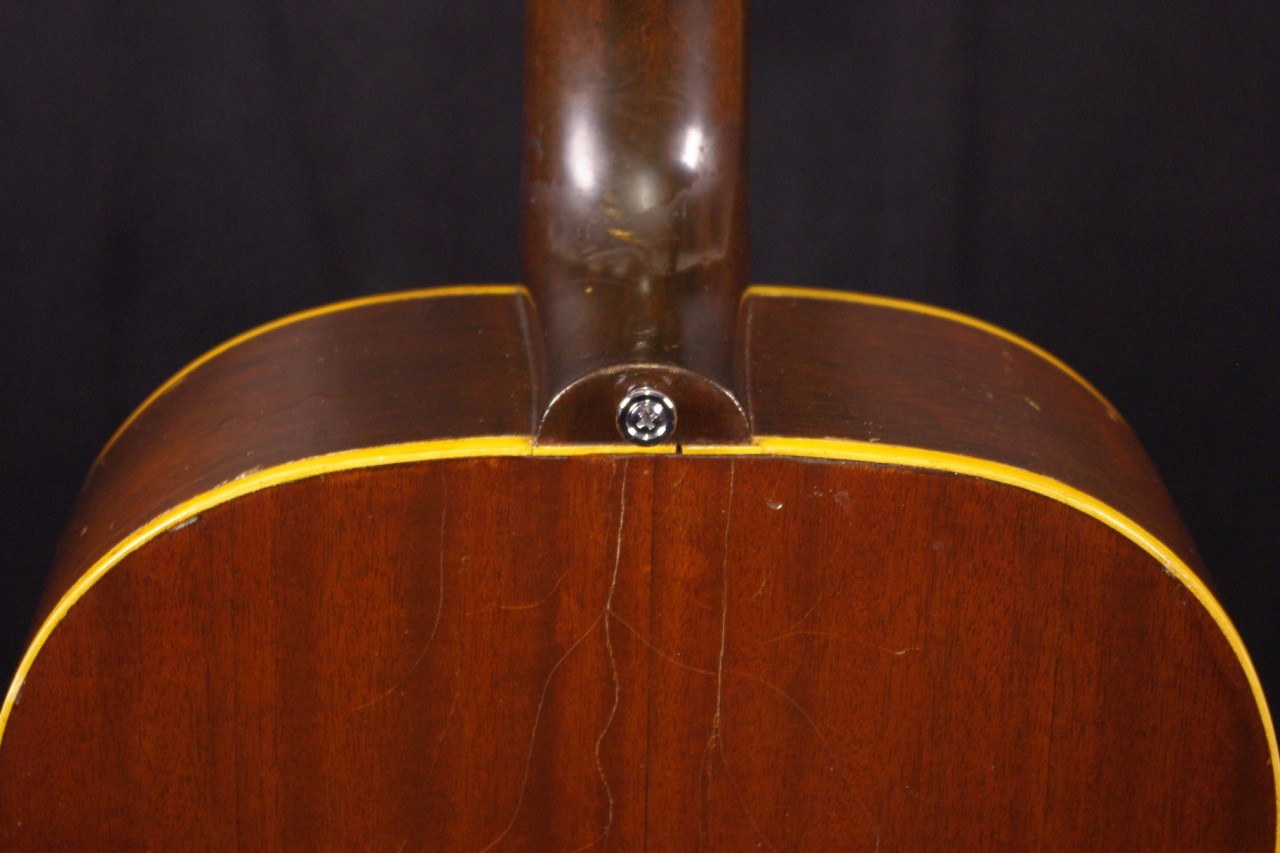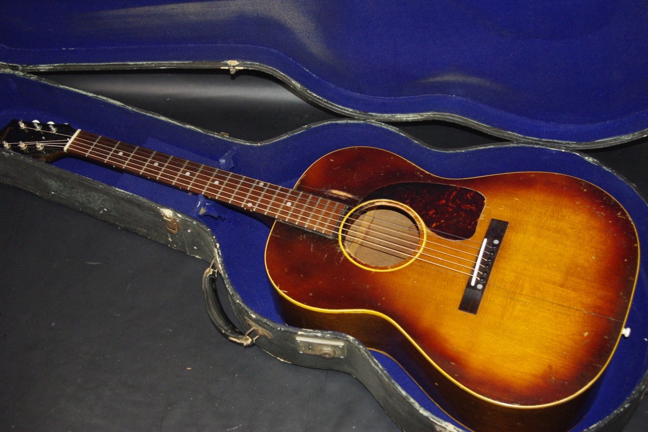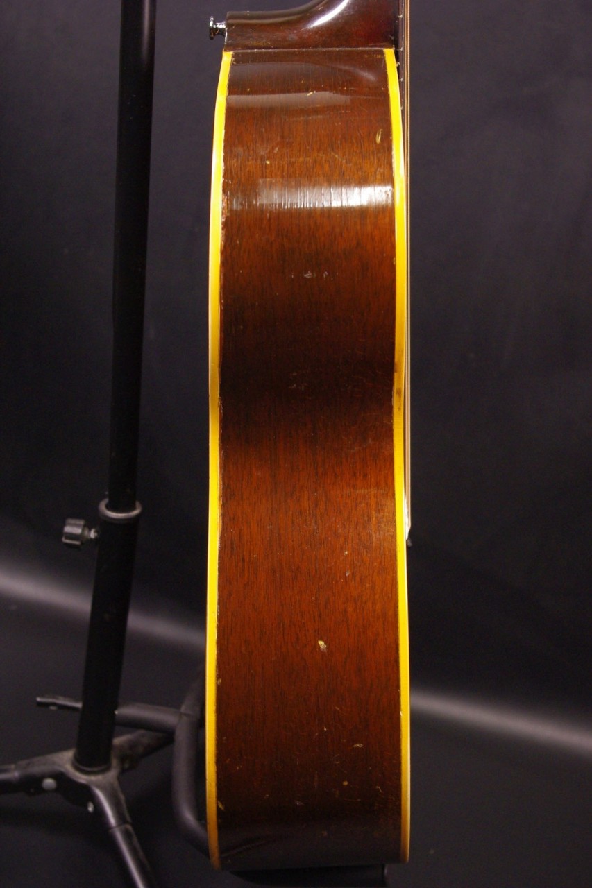 1950年代スモールピックガード期のLG-1が入荷しました!!トップはスプルース、サイドバックにはマホガニー、指板とブリッジにはハカランダを採用、同時期のLG-2と比べるとラダーブレーシングの影響からより明るく軽快なサウンドが特徴です。シリアルナンバーから1954年に生産された個体でボディにクラック補修が多数あります。サウンドホール周囲に弾き傷、全体的に傷も多めにあります。以前にバックを外しブレーシング補修、板を追加して補強されています。ペグは3連タイプに交換されています。ブリッジはオリジナルですが薄く加工されています。ピックガードはオリジナルで残っています。ネックヒールへはストラップピンが打っています。ピックアップの取り付け加工はございません。ナット幅は約42.5mm、60年代と比べるとやや厚みのある握りやすいグリップです。ネックのアングルは適正でトラスロッドの動作に余裕があります。フレットは全体的に低めですが今のところ演奏上支障ございません。弦高は12フレット6弦側で約2.6mm、1弦側で約1.6mmの高さでハイポジションまで押さえやすく調整しています。サドル残もありますので微調整も可能です。沢山弾きこまれていますのでカラッと枯れた味わい深いサウンドで仕上がっています!オーバーサイズのハードケース付き