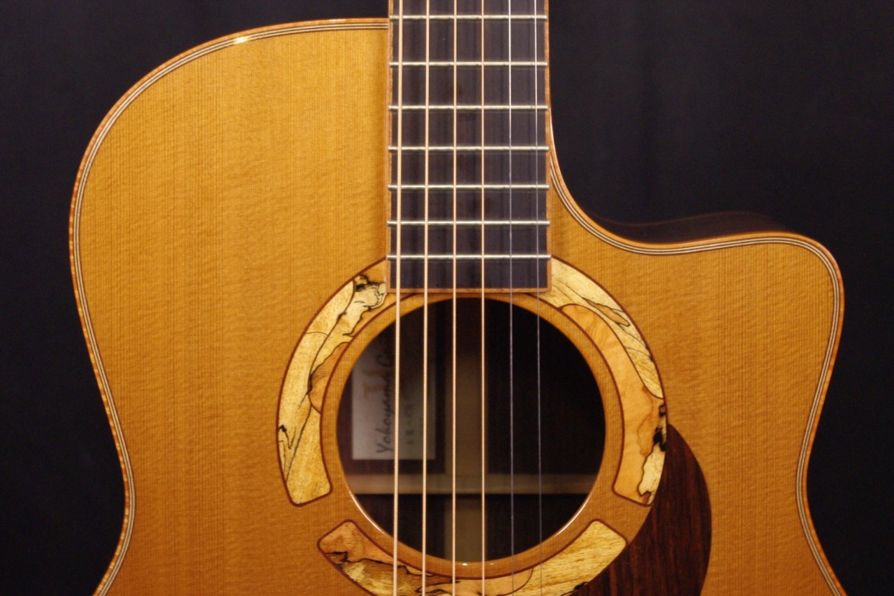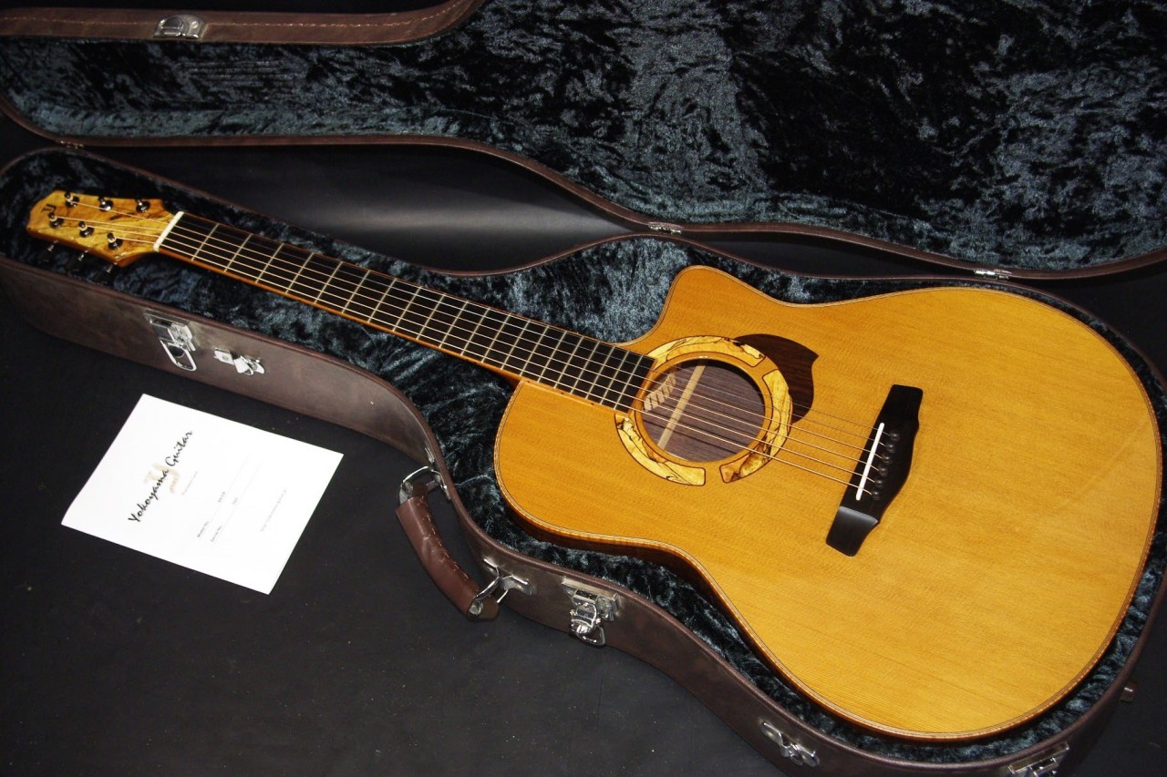 フィンガーピッキングにオススメのYOKOYAMA GUITARSのAR-CRが入荷しました!トップはレッドシダー、サイドバックにはインディアンローズウッドのオール単板を採用、トリプルオーと比べるとやや幅広く胴厚で扱いやすいボディ形状です。またカッタウェイ仕様のためハイポジションまで無理なく押さえられるのも魅力ですね!2000年代に生産された個体で細かい傷はありますが全体的に大変綺麗で演奏性も優れています。ペグやブリッジなどパーツもオリジナルでストラップピンやピックアップなど特別な加工もございません。ナット幅は約44.5mmありますがやや薄めで押さえやすいグリップです。ネックのアングルも理想的でトラスロッドの動作も問題なく機能しています。フレットの減りもなく長期で気にしないでお使いいただけます。弦高は12フレット6弦側で約2.6mm、1弦側で約1.7mmの高さでハイポジションまで押さえやすく調整しています。お好みに合せた微調整にもお応えいたします。シダーらしい柔らかく弾力があり指弾きでの立ち上がりも素早く心地よく響きます!ローズウッドとの相性も抜群でバランスもとれています!是非この機会にお試しください。オリジナルハードケース付き。